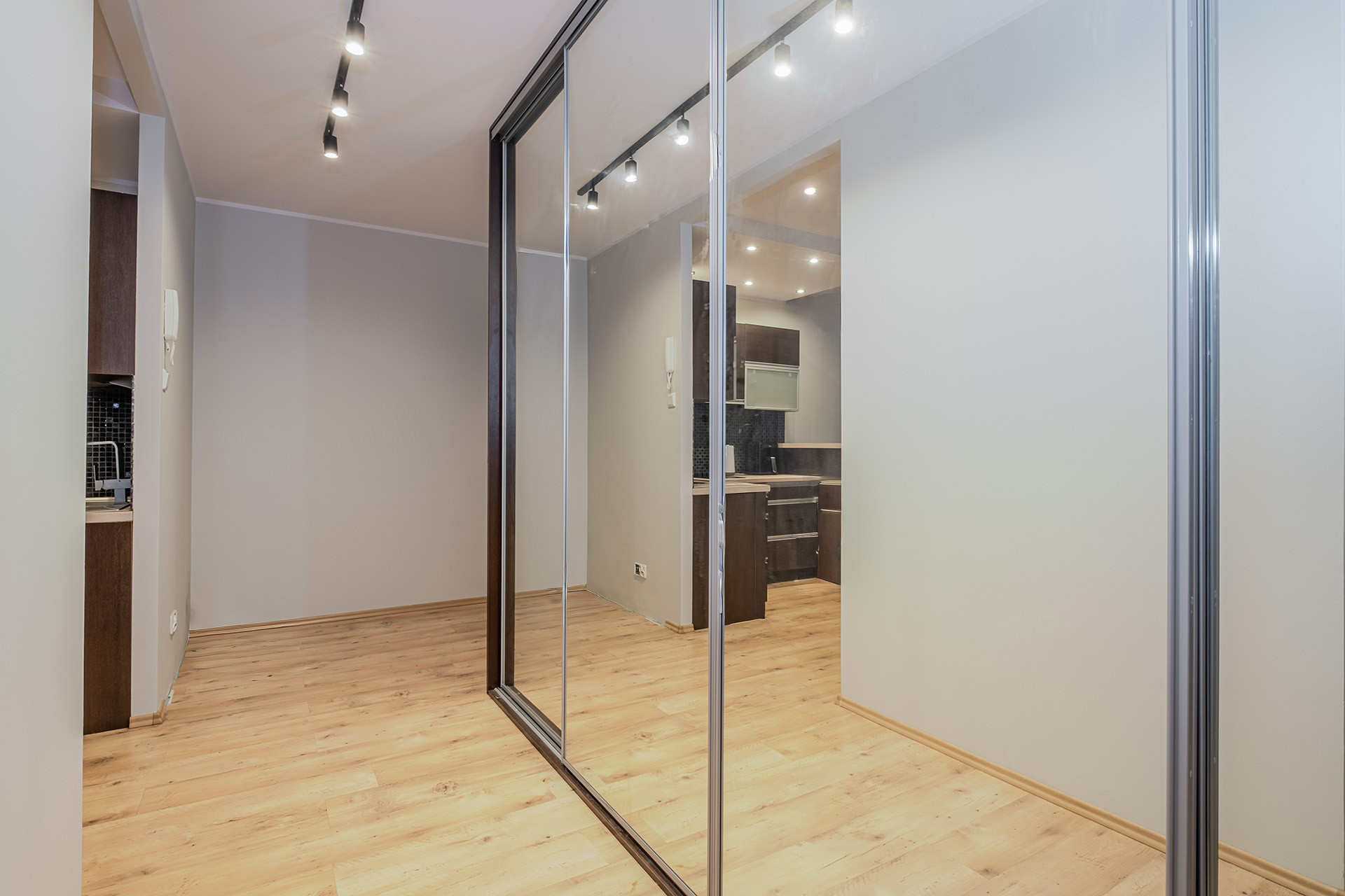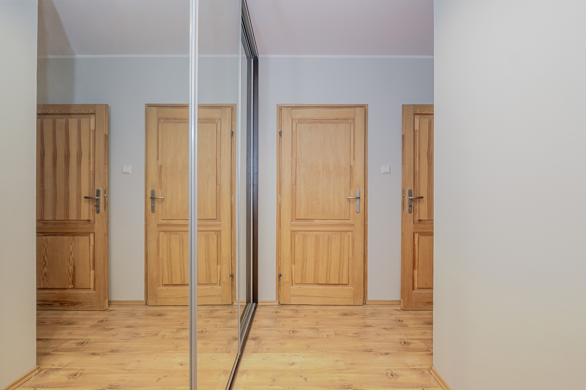 przedpokój z dużą, lustrzaną szafą w zabudowie.