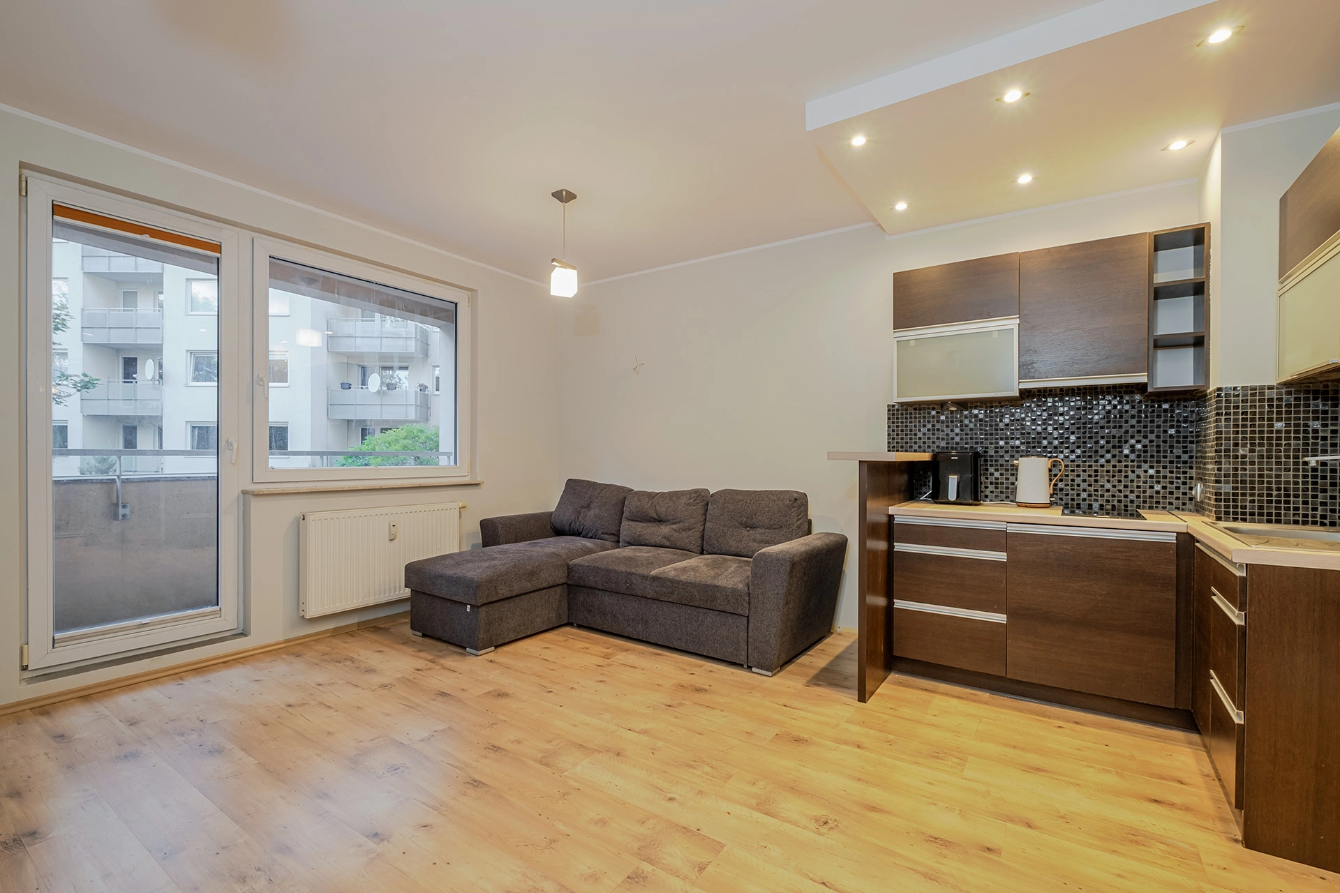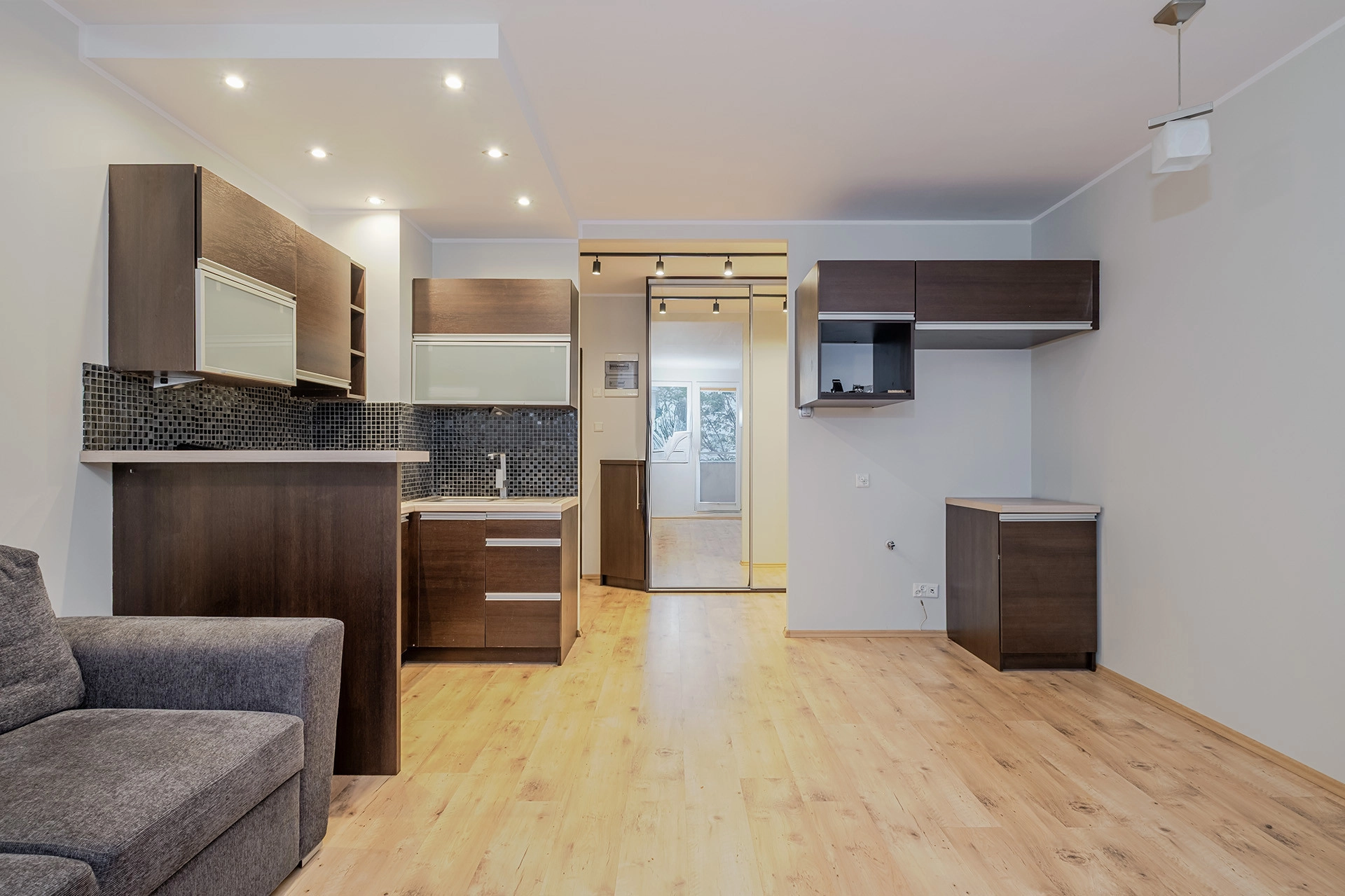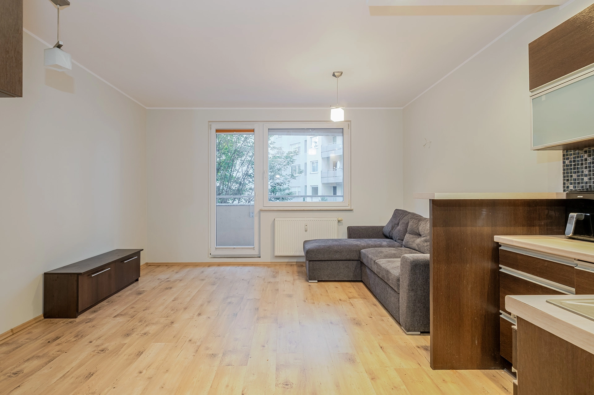 salon z aneksem kuchennym oraz wyjściem na balkon,