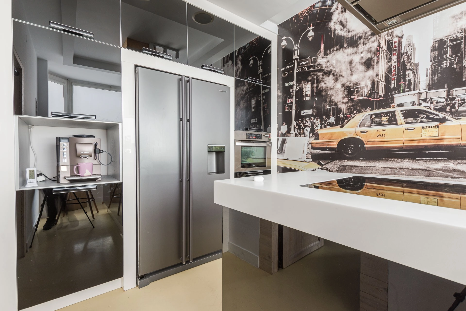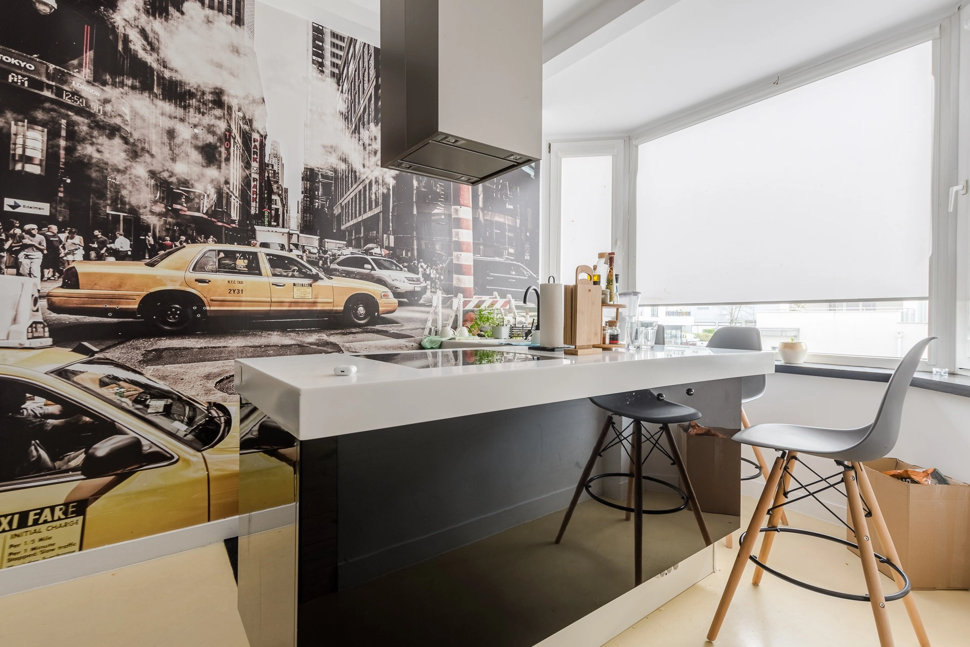 – kuchnia o pow. ok. 11 m2 z zabudową na wymiar (szkło/aluminium/mdf) wyposażoną m.in. w płytę indukcyjną i ceramiczny zlew, blat z korianu,