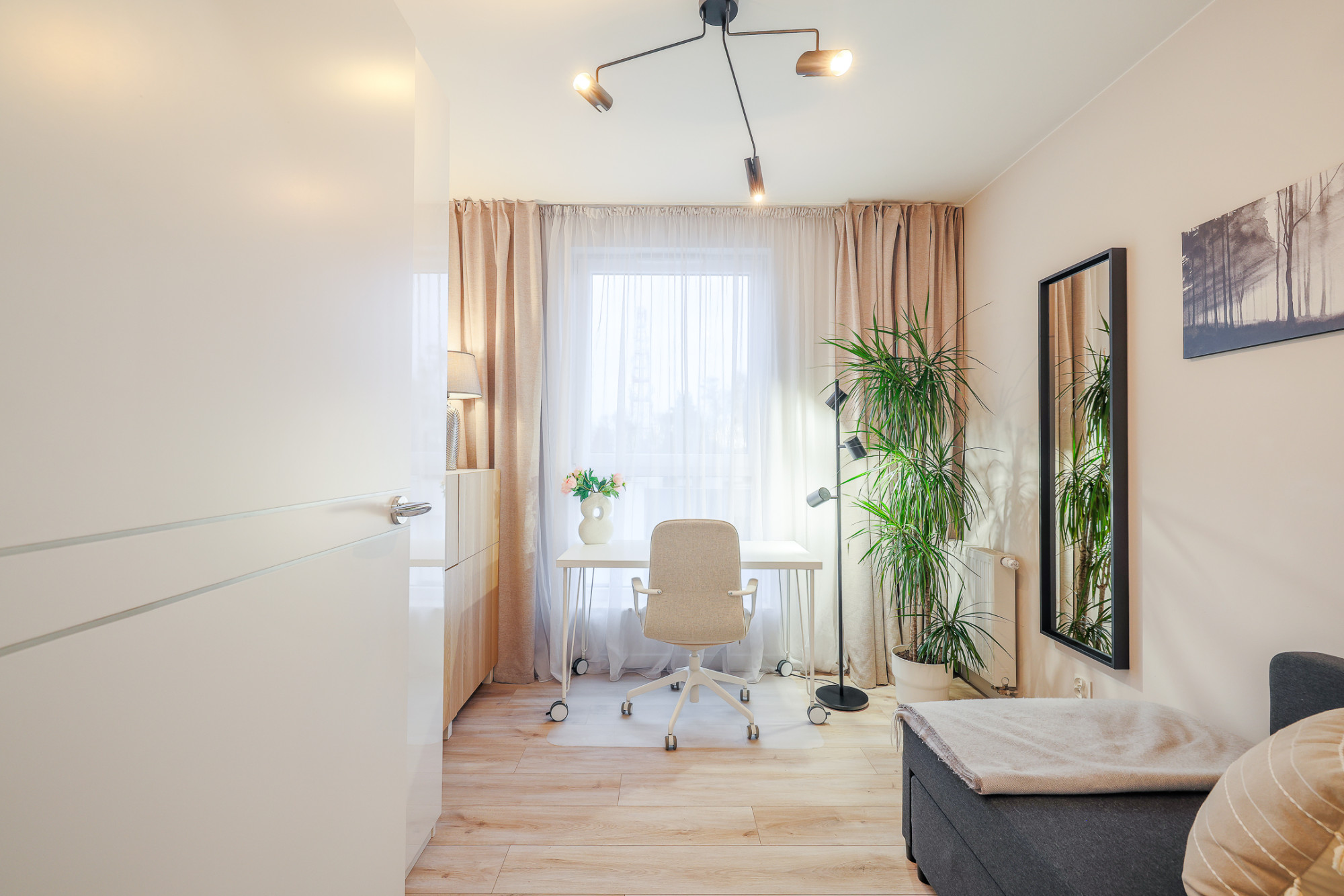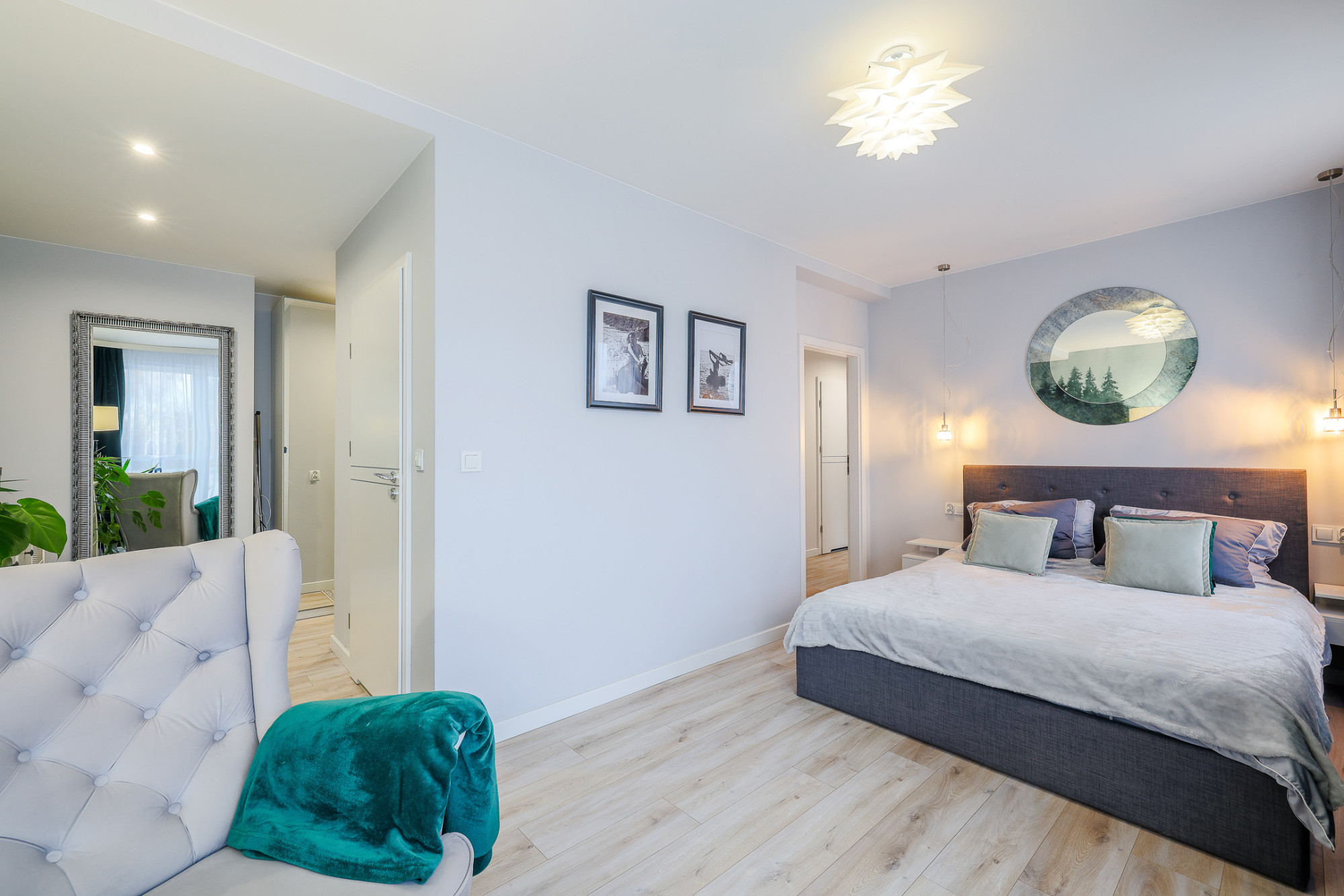 W części prywatnej znajduje się komfortowa sypialnia typu master bedroom — z własną garderobą, prywatną łazienką oraz drugim balkonem. To idealna przestrzeń na odpoczynek i chwilę wyciszenia. Dodatkowy pokój może pełnić funkcję gabinetu, sypialni dziecka lub pokoju gościnnego. Co ważne, istnieje możliwość wydzielenia trzeciej sypialni, zachowując wygodę pozostałych pomieszczeń.