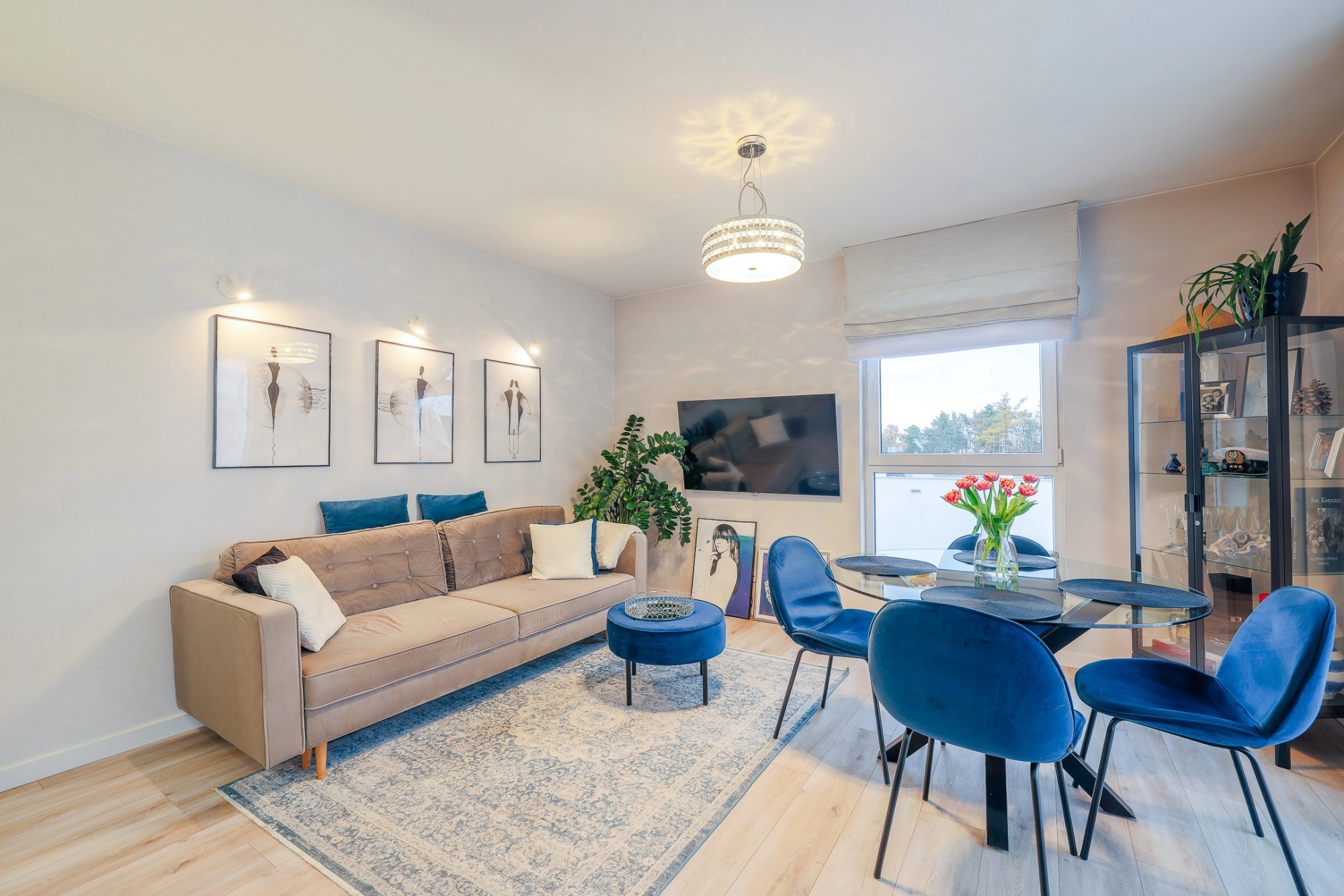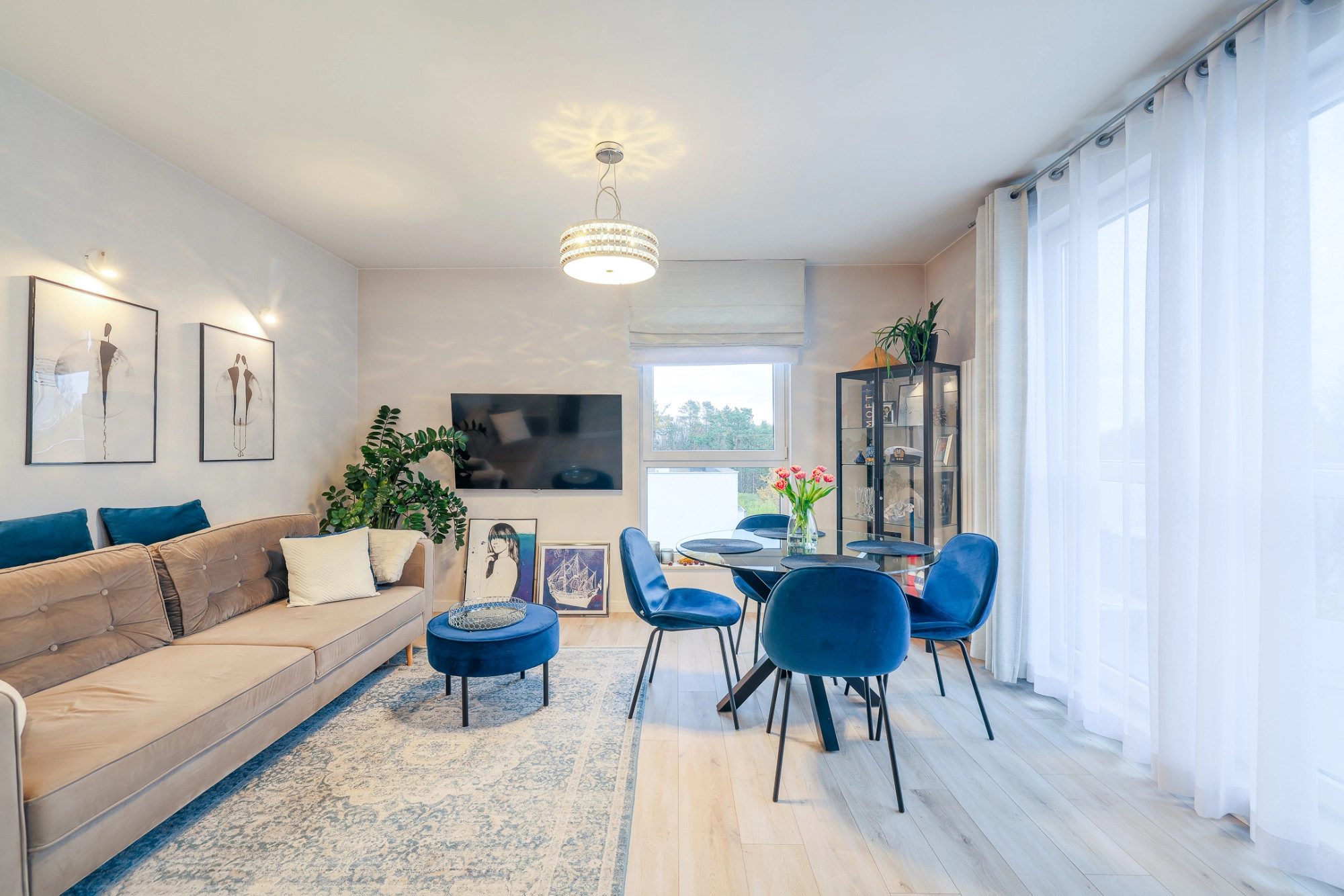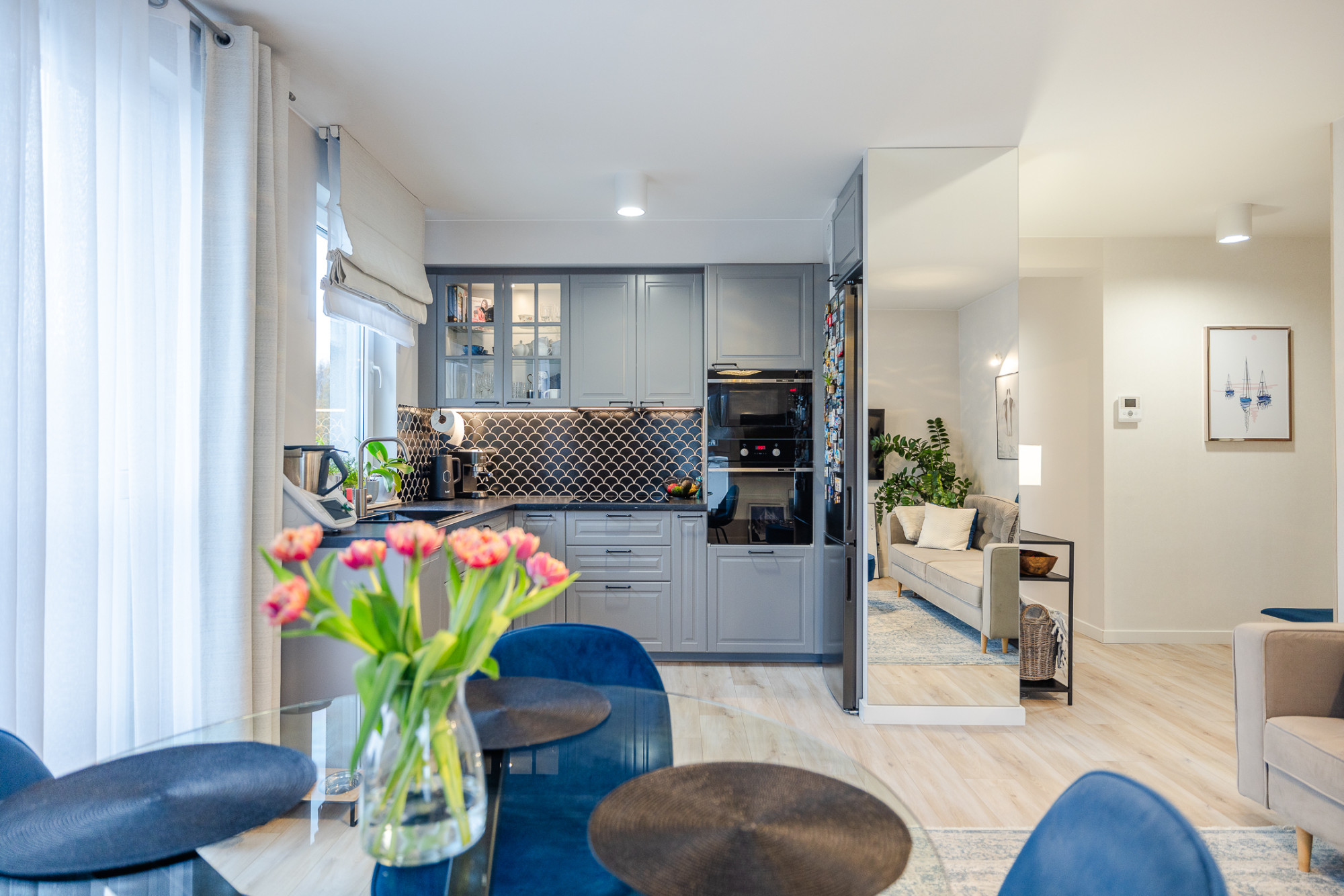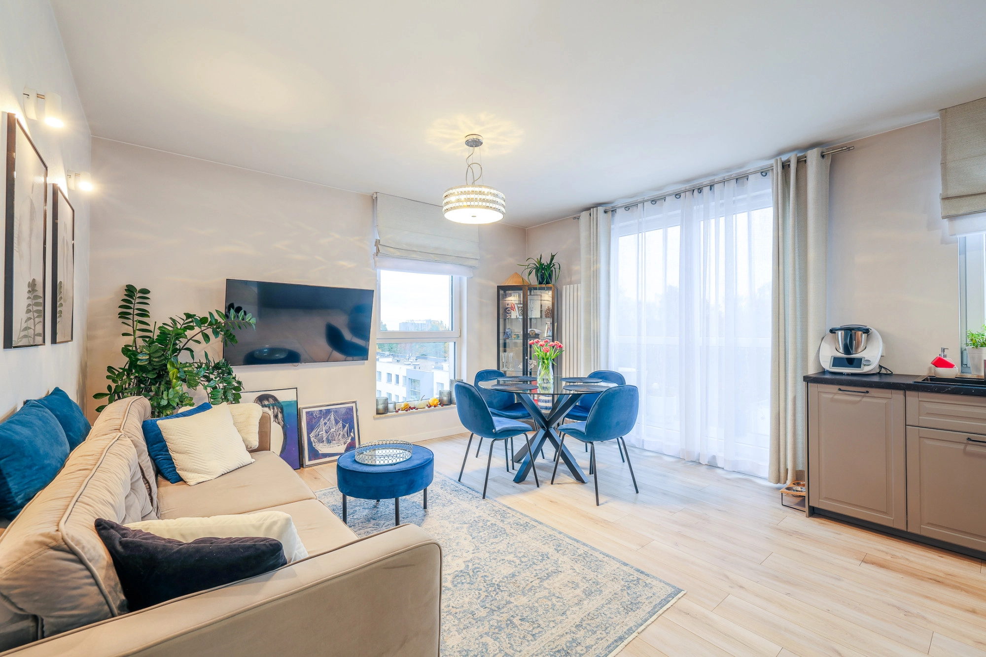 Centralnym punktem jest jasny salon połączony z aneksem kuchennym, wyposażonym w kompletny zestaw sprzętów AGD, które pozostają w cenie. Z salonu prowadzi wyjście na jeden z dwóch balkonów, z którego rozpościera się uspokajający widok na Las Oksywski.