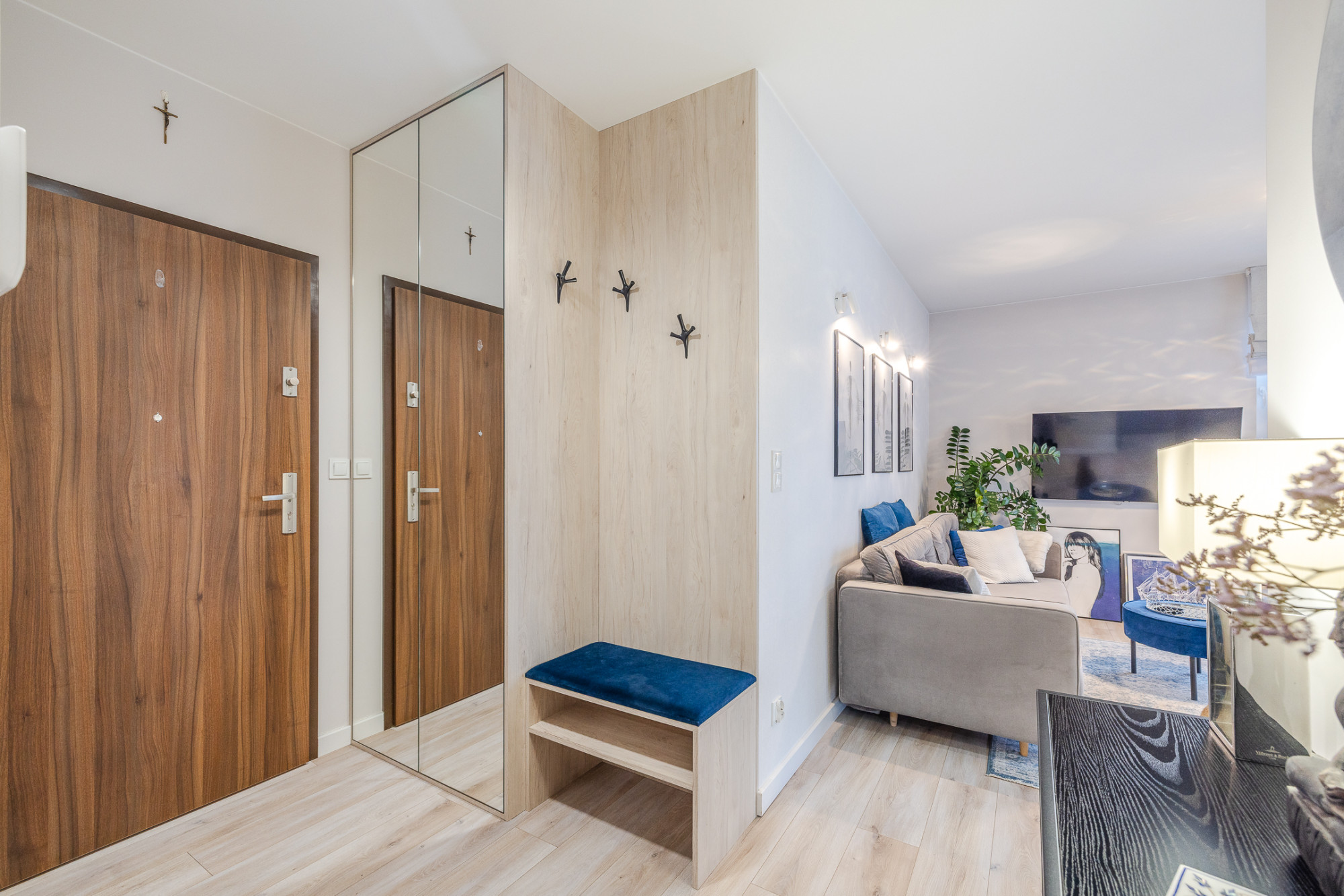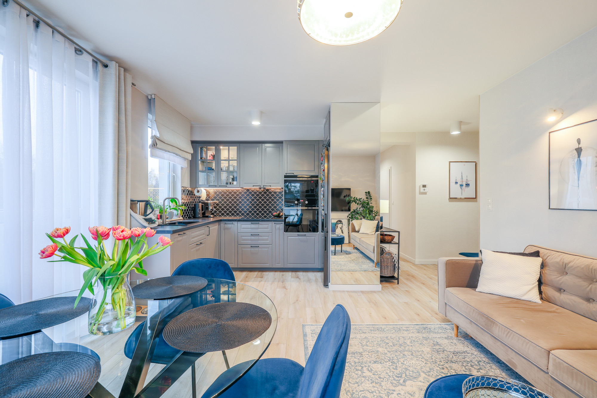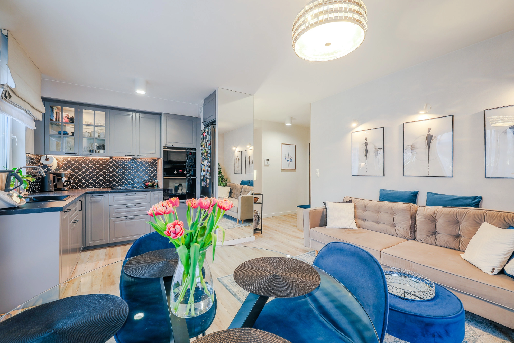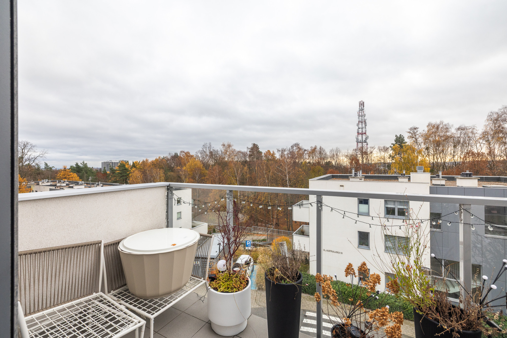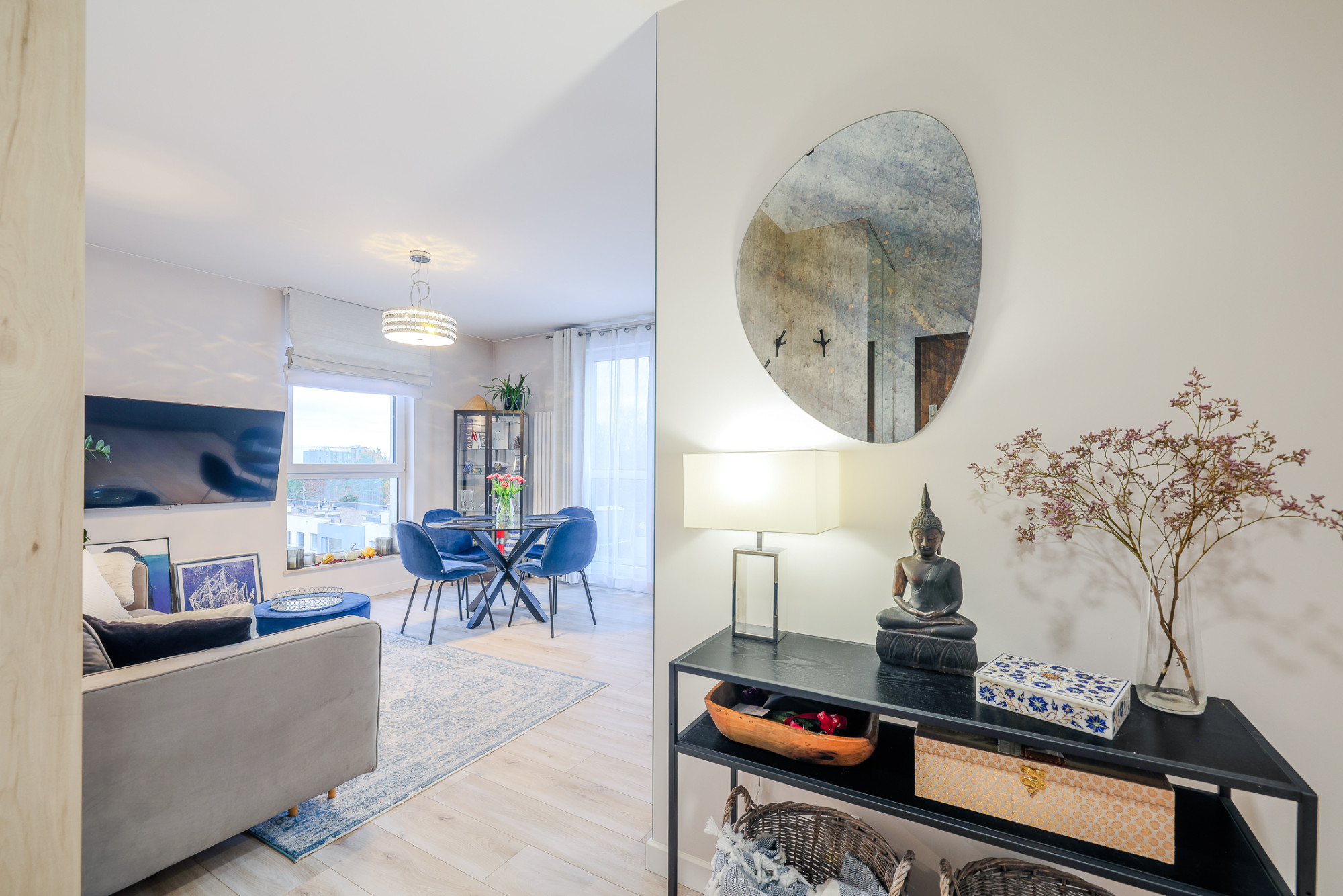 Centralnym punktem jest jasny salon połączony z aneksem kuchennym, wyposażonym w kompletny zestaw sprzętów AGD, które pozostają w cenie. Z salonu prowadzi wyjście na jeden z dwóch balkonów, z którego rozpościera się uspokajający widok na Las Oksywski.