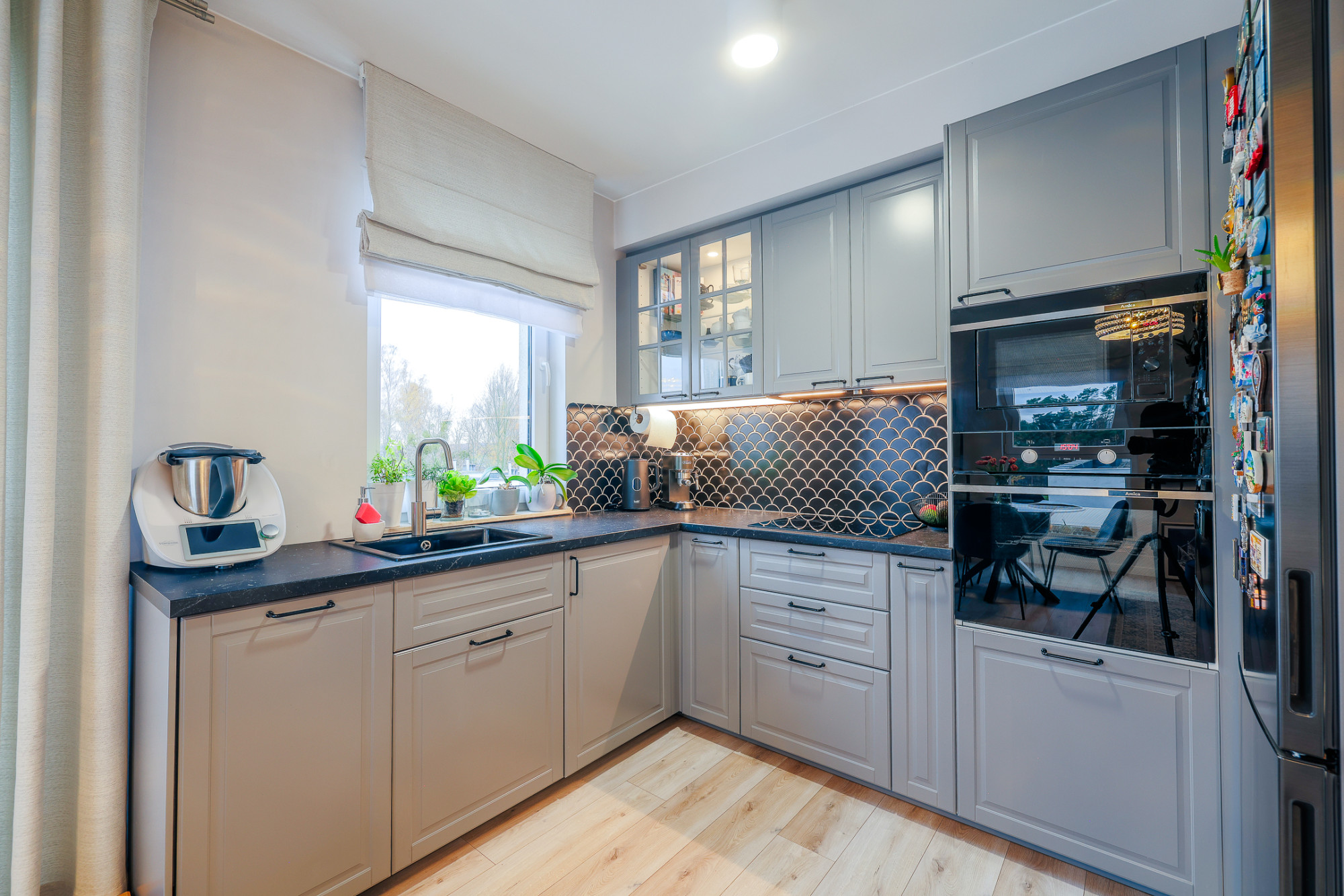 Wnętrza są jasne i ciepłe dzięki ekspozycji południowo-wschodniej, a wysokiej jakości materiały — podłogi Belpol, kafle z Hiszpanii i Maroka czy drzwi Porta — podkreślają staranny charakter nieruchomości.