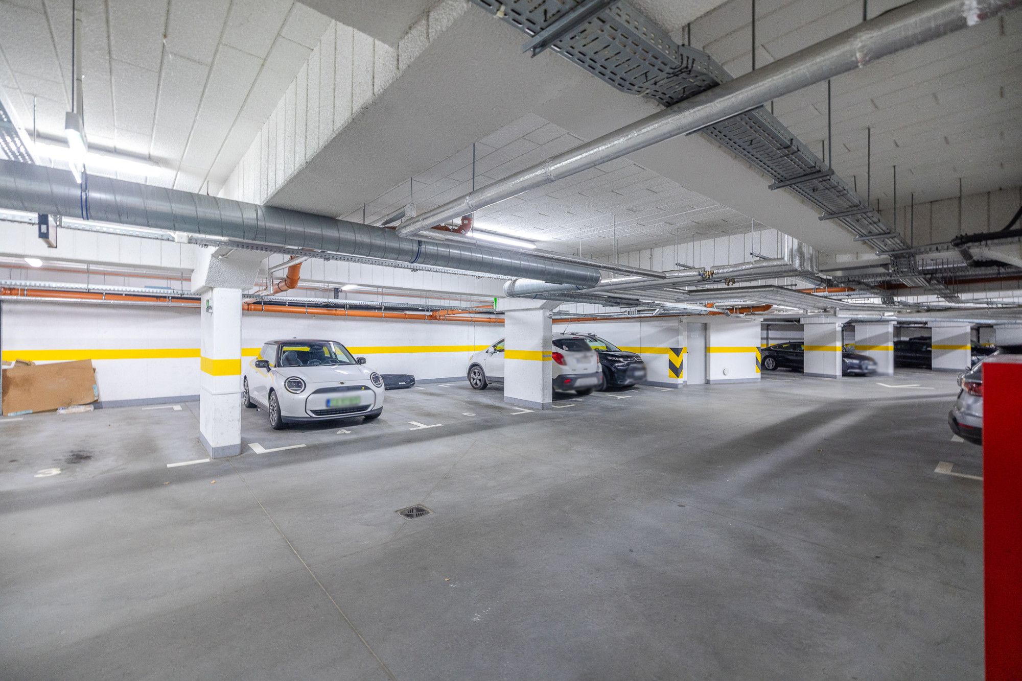 Do mieszkania przynależą dwa szerokie miejsca postojowe w hali garażowej oraz komórka lokatorska z regałami i miejscem na rower — pakiet obligatoryjny dodatkowo koszt 70 tyś zł.