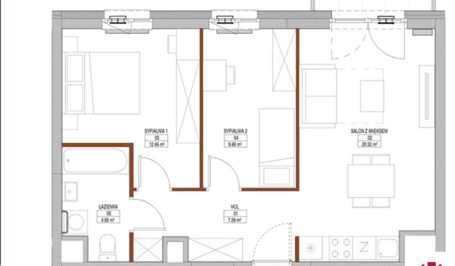 MIESZKANIE: Słoneczny apartament o powierzchni 54,44m2 składa się z: