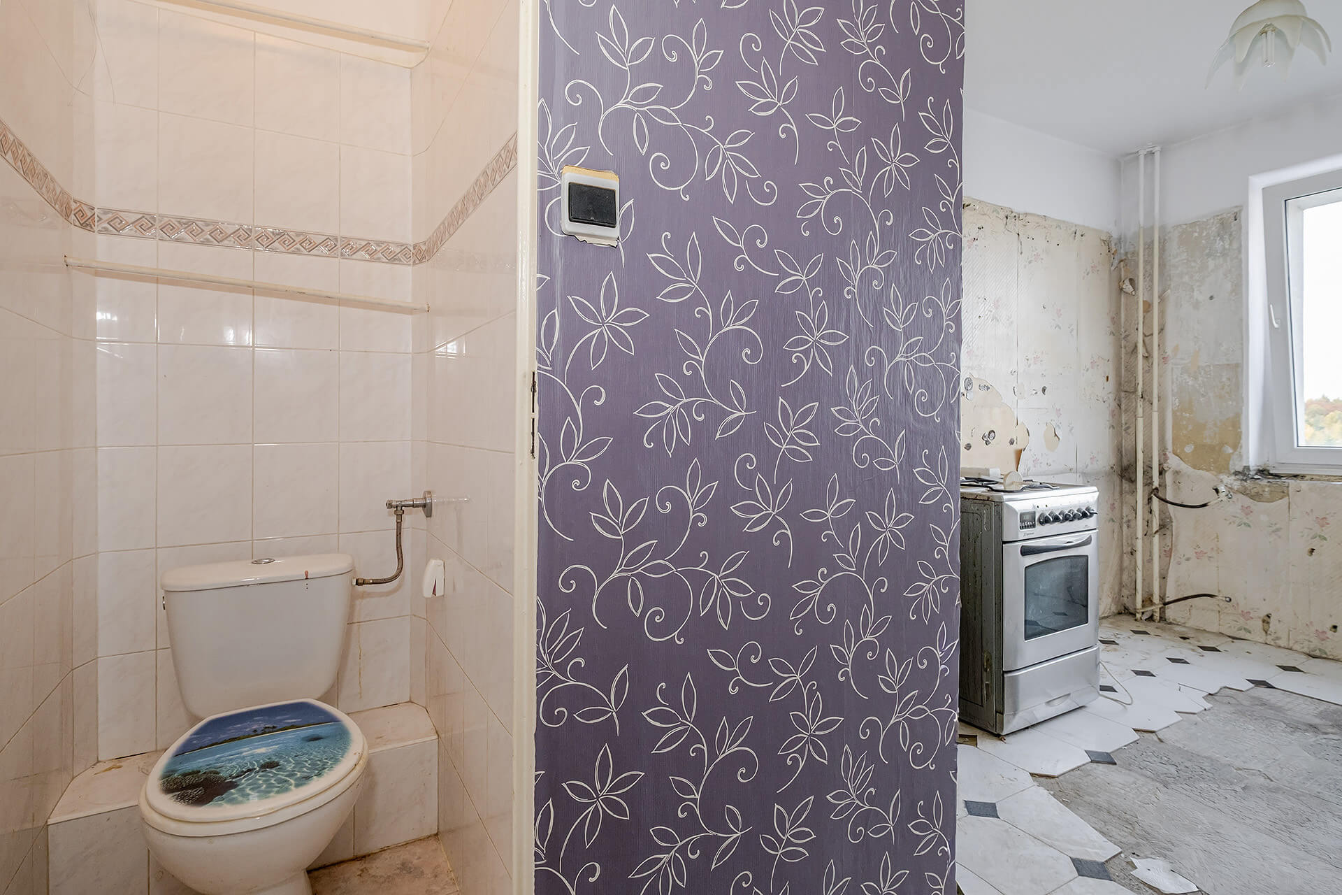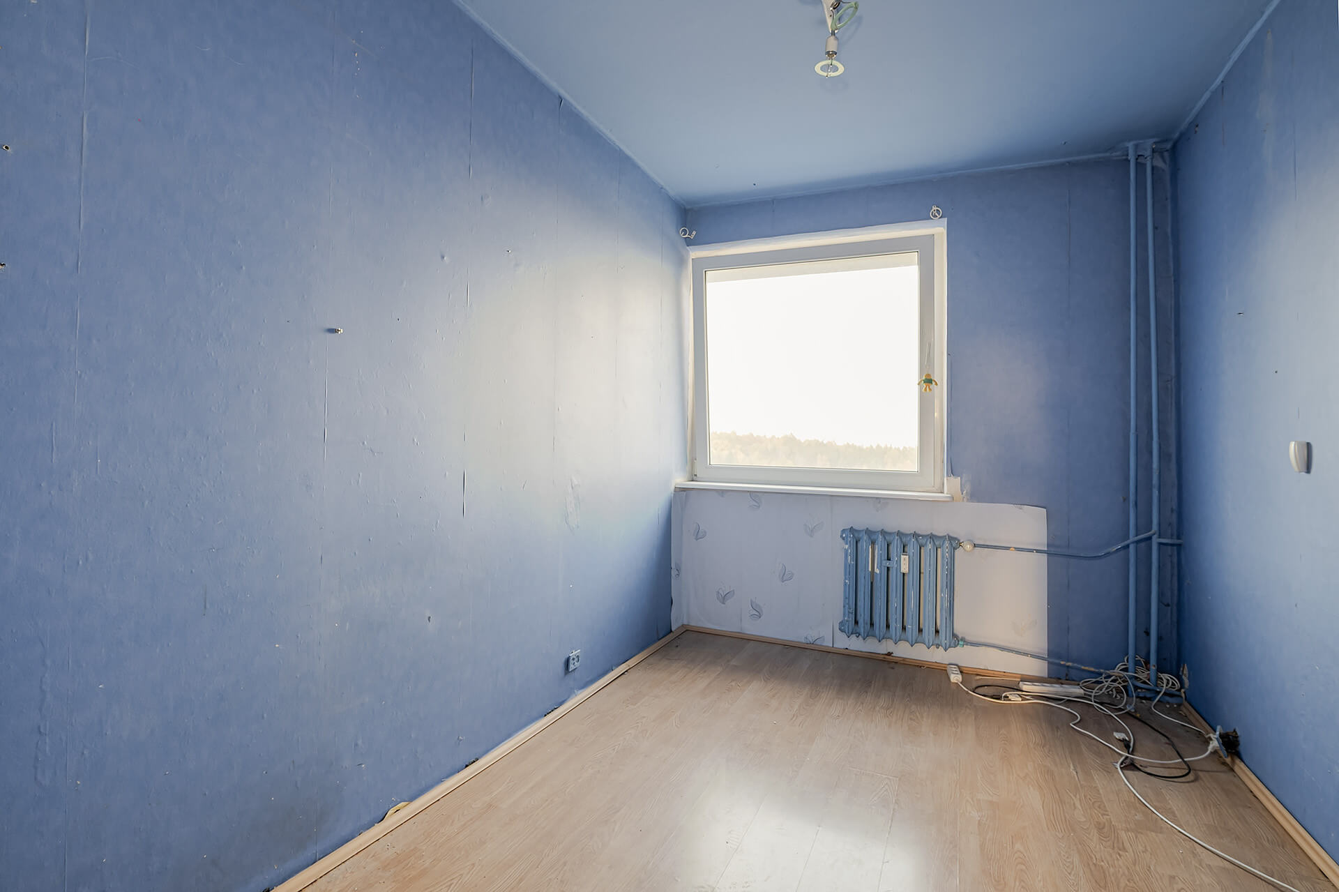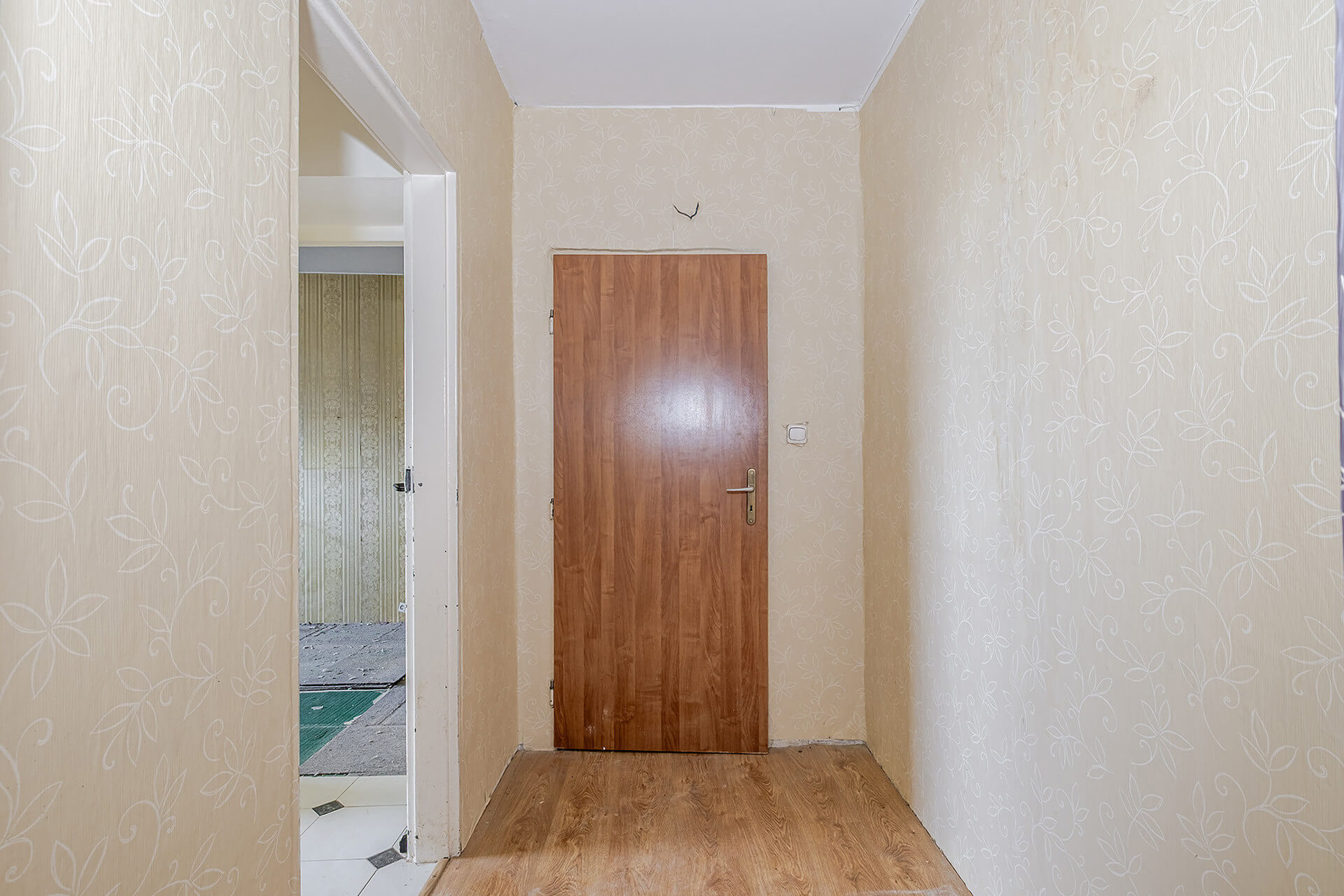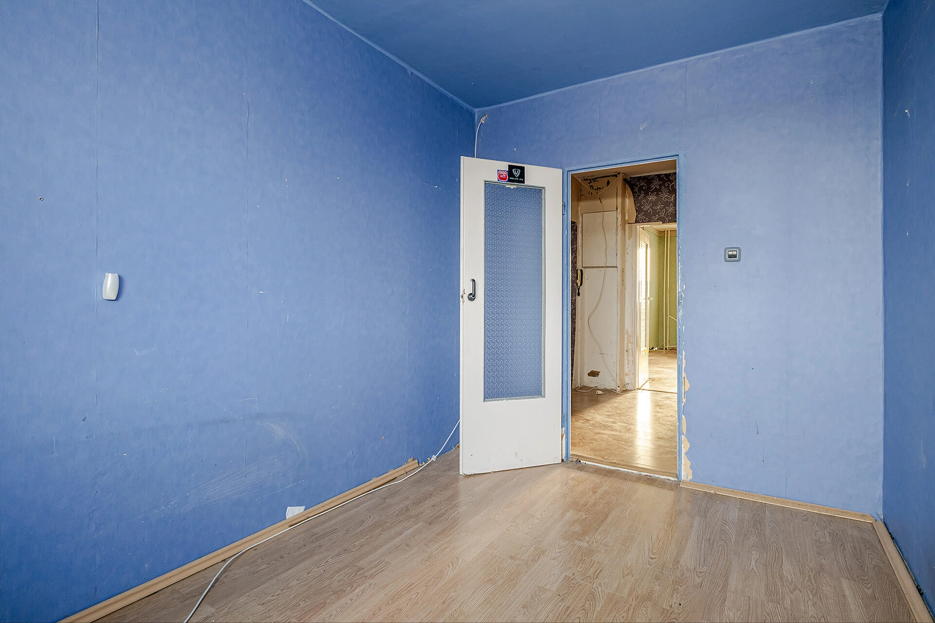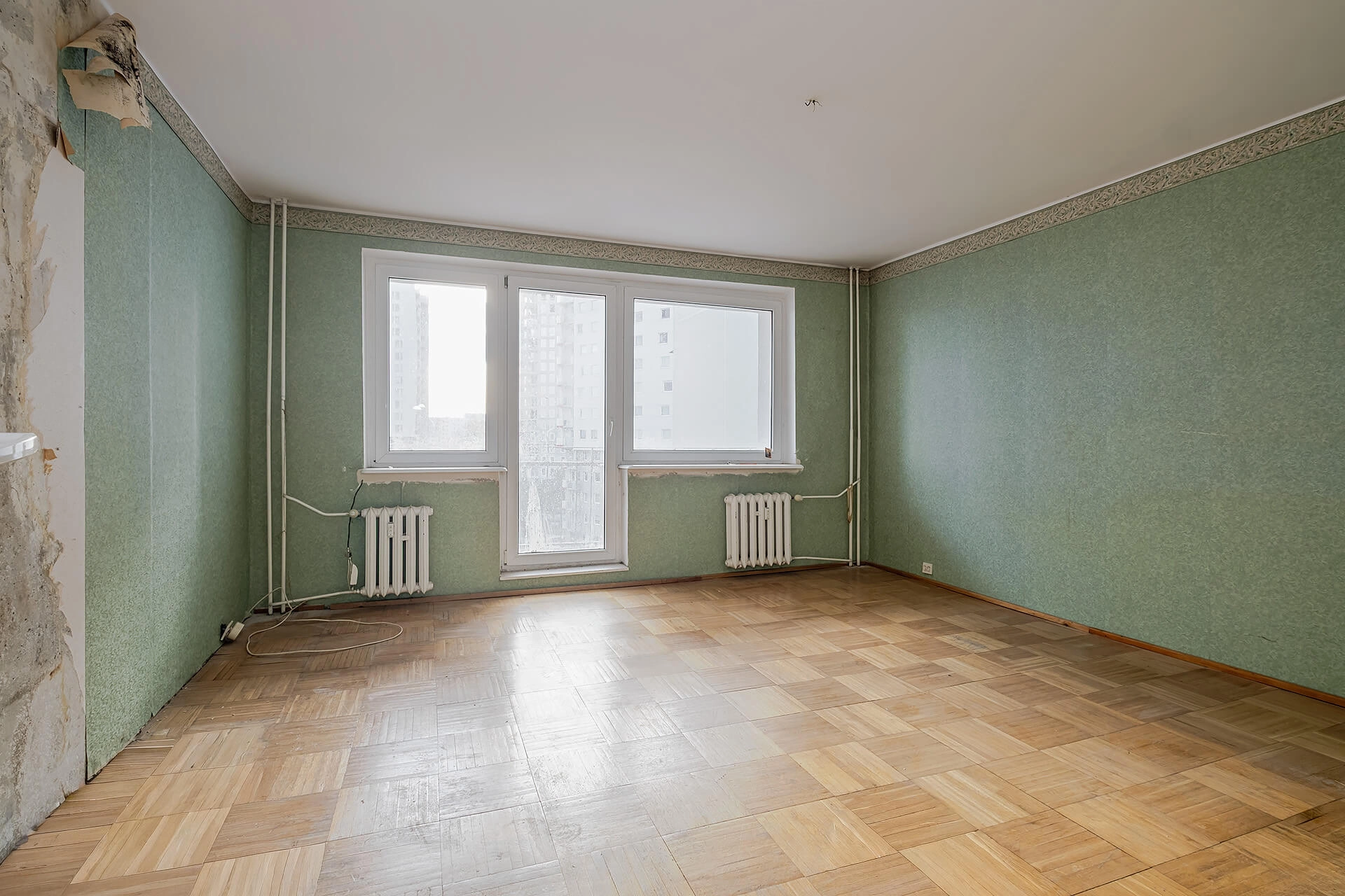 Na podłogach znajdziemy panele, parkiet oraz płytki. Przeznaczone jest do generalnego remontu.