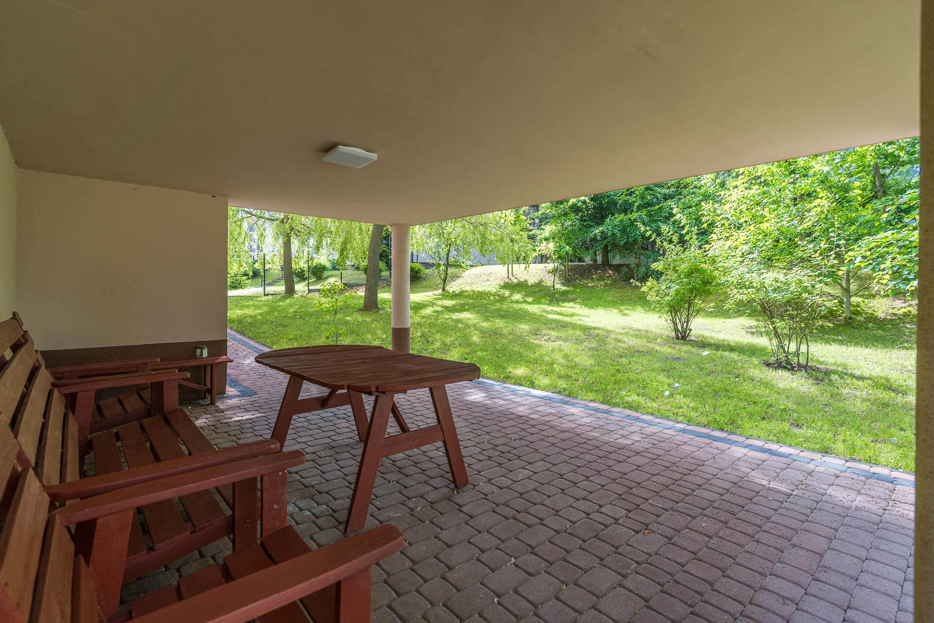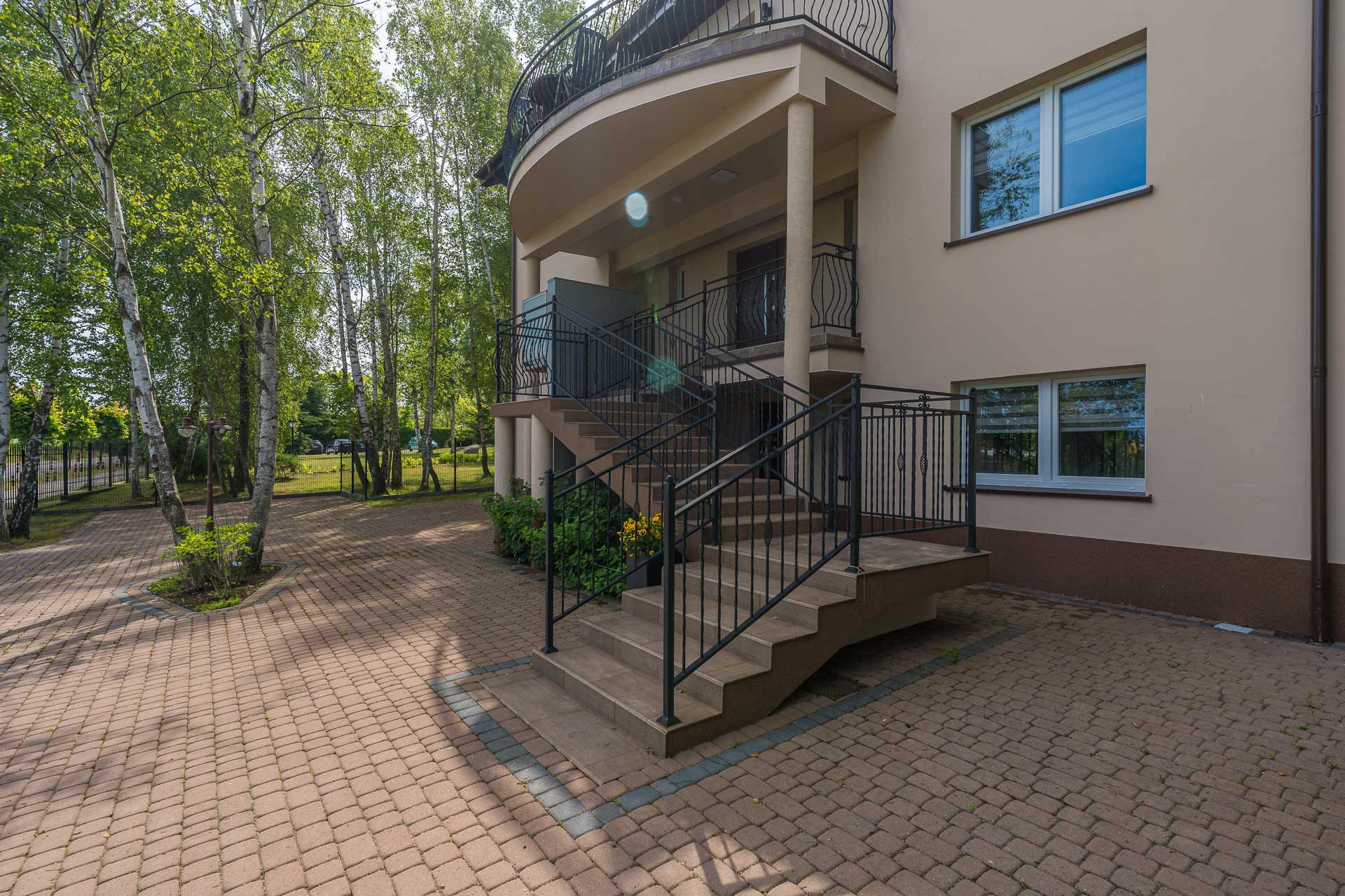 Przed budynkiem wyłożona jest kostka brukowa, gdzie wyznaczone są miejsca parkingowe dla gości. Okna w całym budynku są nowe z pakietem trzyszybowym, a całość ogrzewana jest gazowym kotłem kondensacyjnym BUDERUS nowej generacji, o maksymalnej mocy oraz niskim zużyciu gazu.