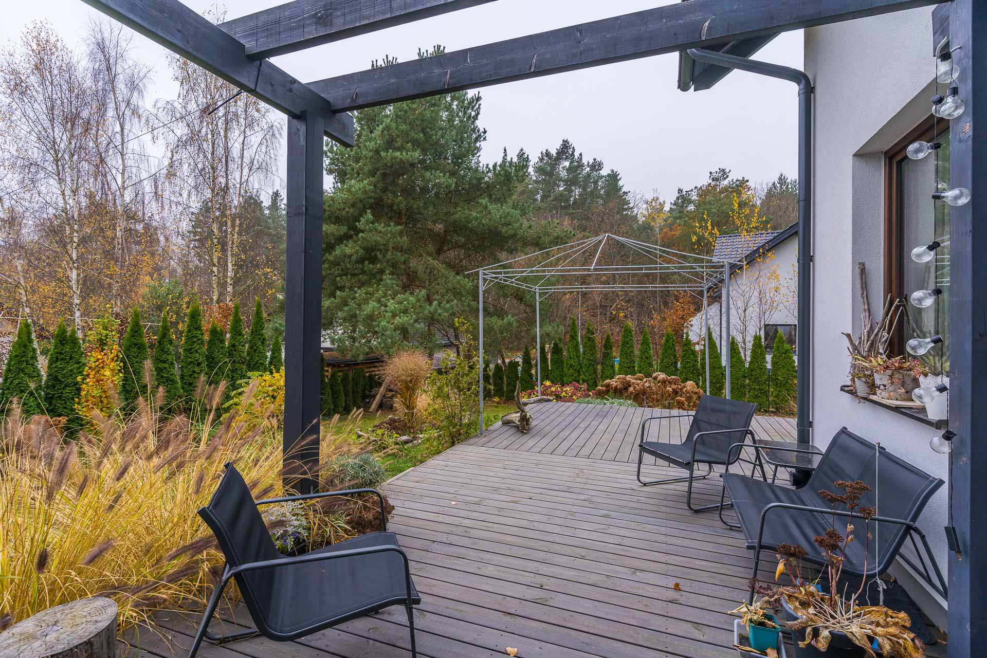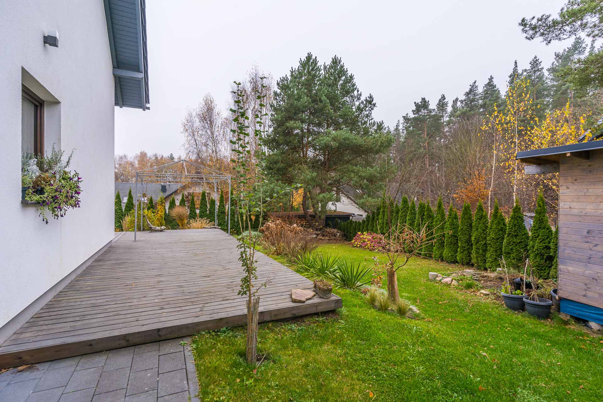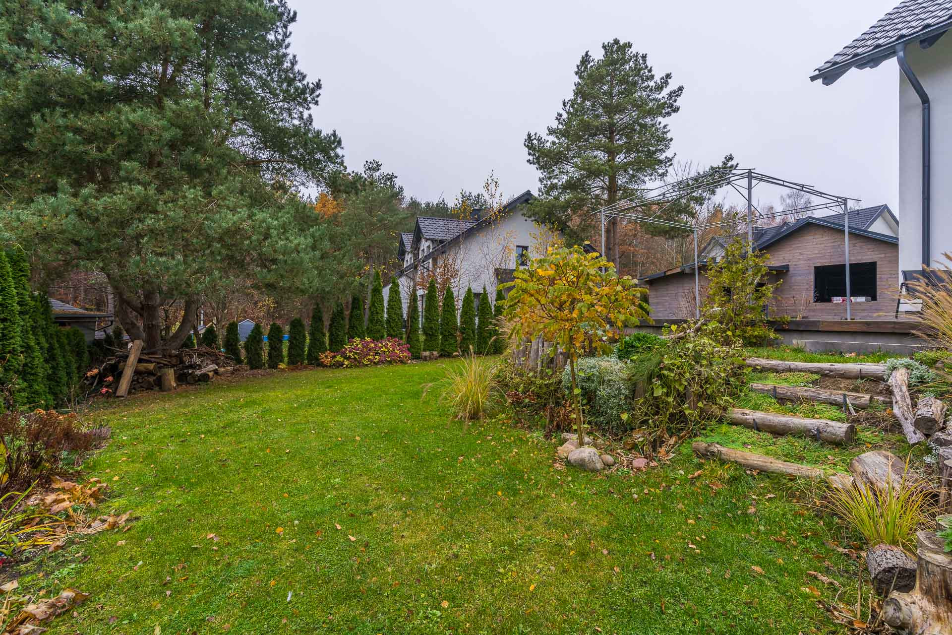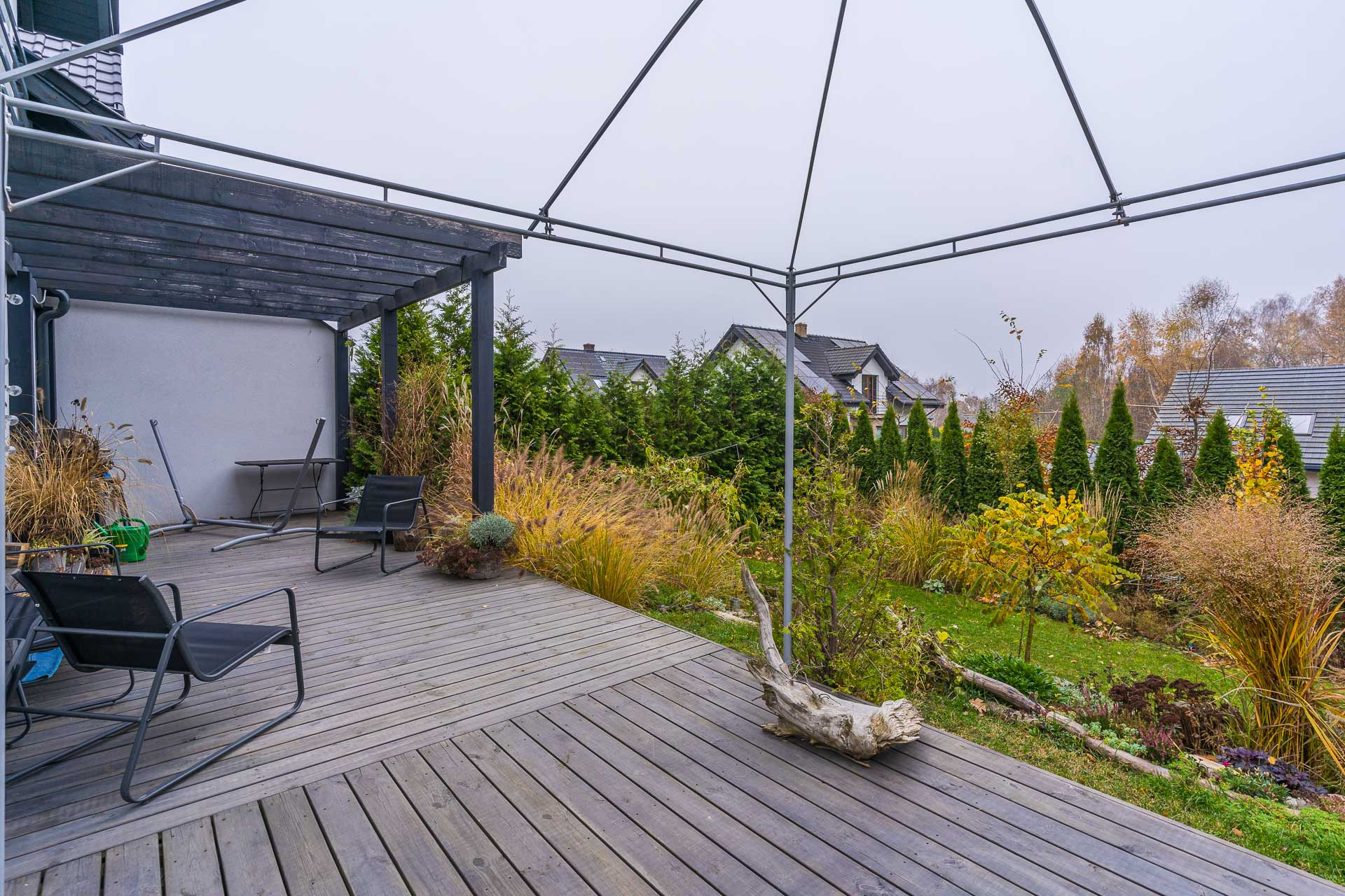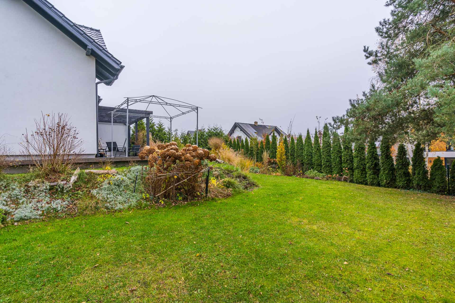 Działka ma powierzchnie596 m2. Jest zagospodarowana, zielona, otoczona drzewami, krzewami oraz licznymi nasadzeniami. Znajdujemy tam też częściowo zadaszony taras o powierzchni 50m2, a przed domem dodatkową zamykaną wiatę garażową na 2 auta.