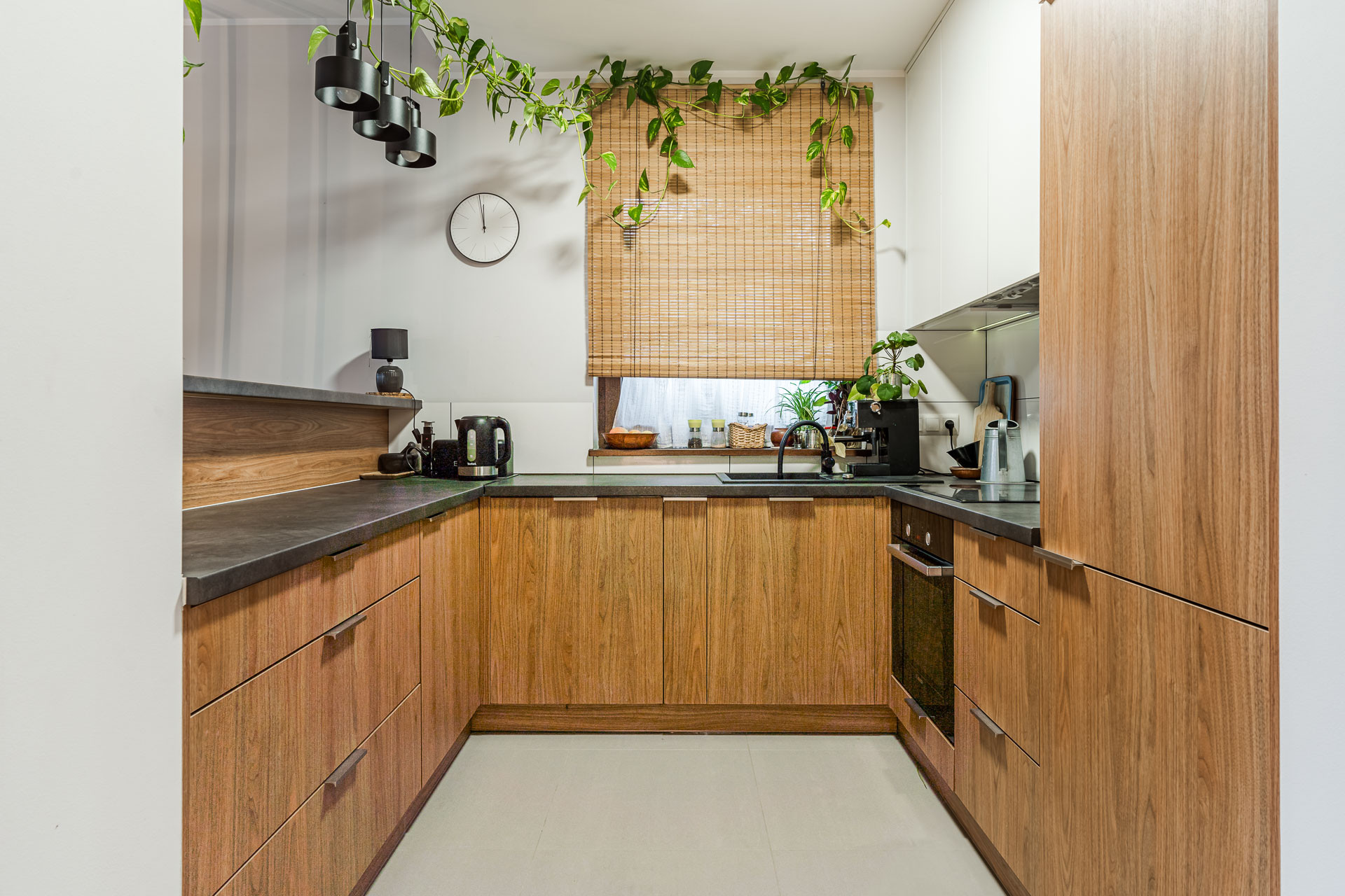 Kuchnia wyposażona w niezbędny sprzęt AGD w zabudowie na zamówienie (zmywarka, okap, kuchenka indukcyjna oraz lodówka).