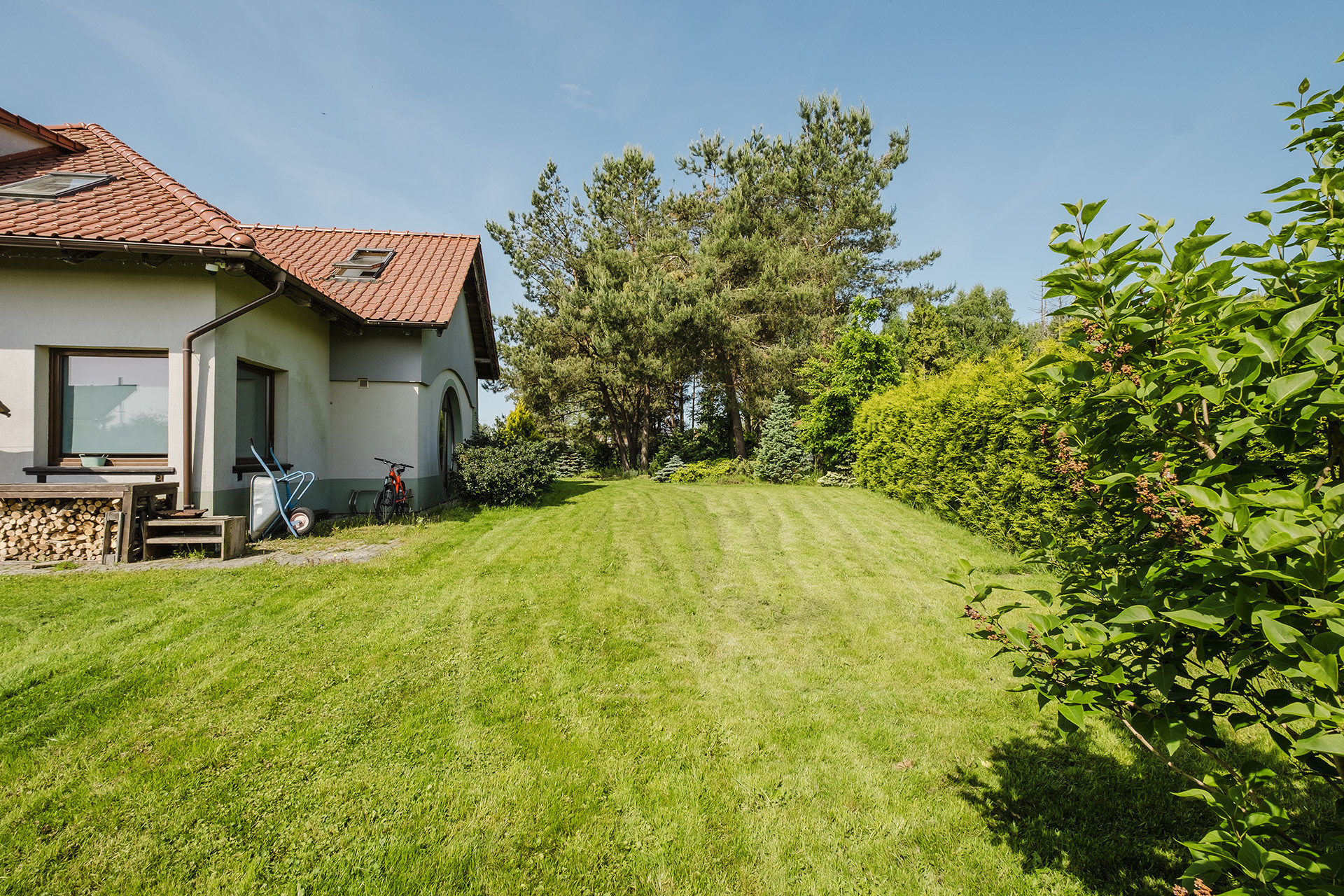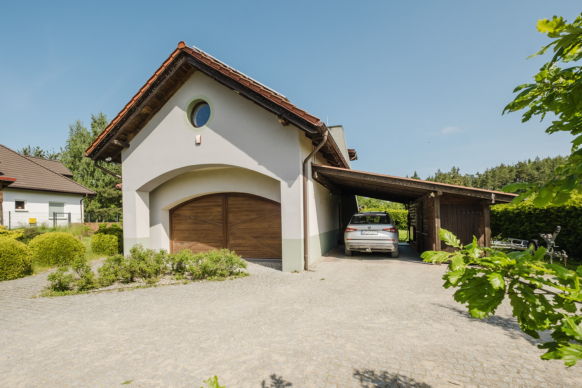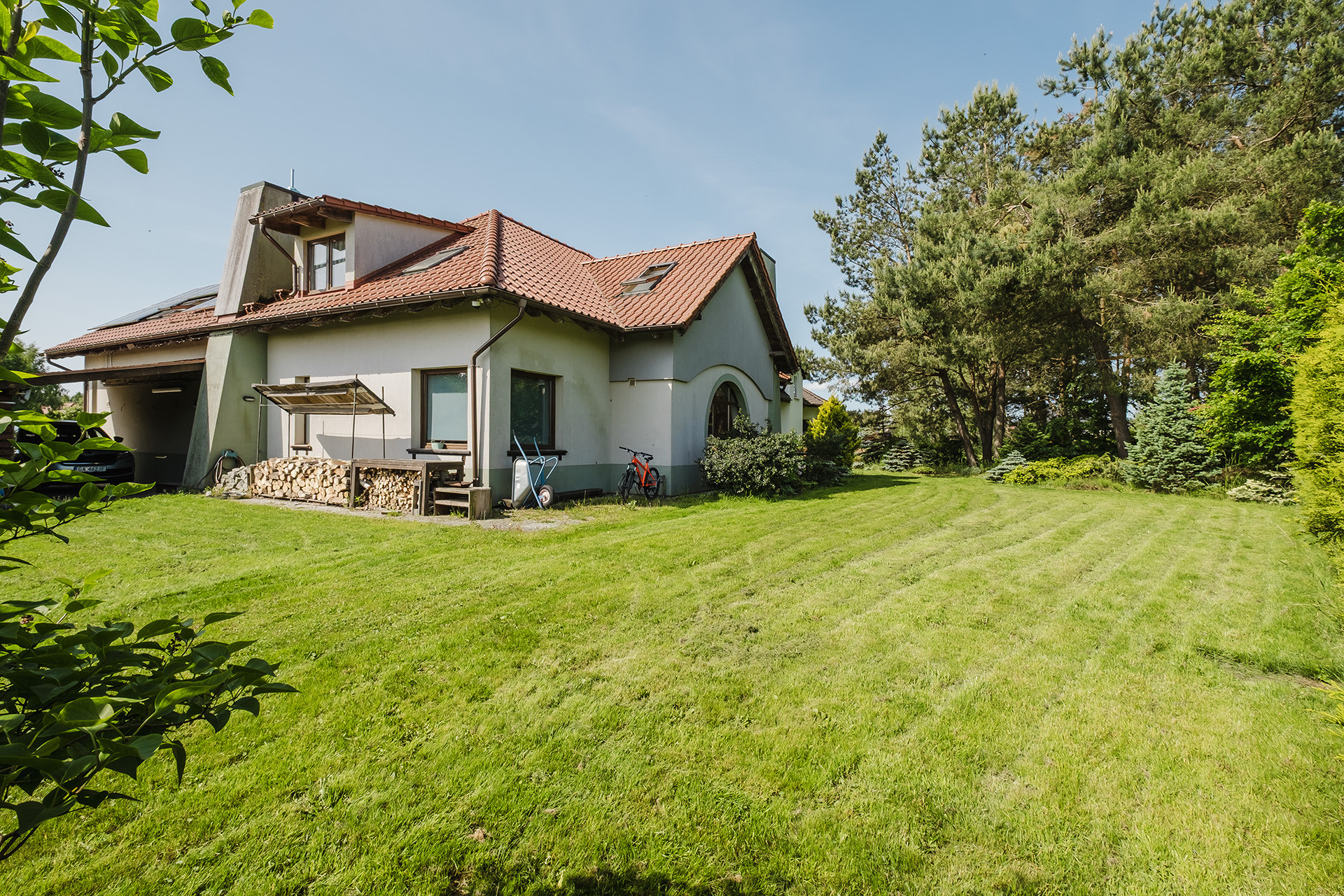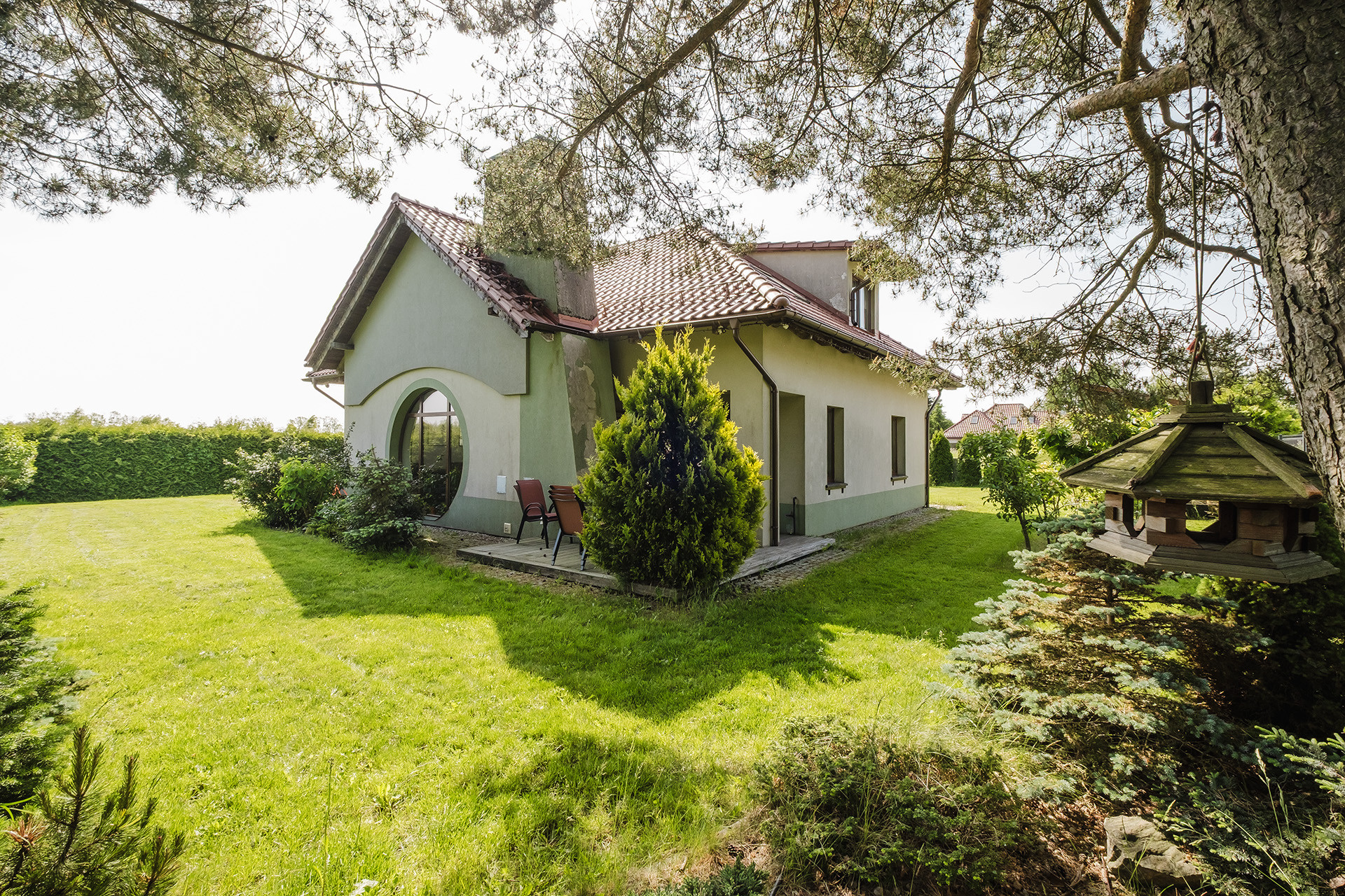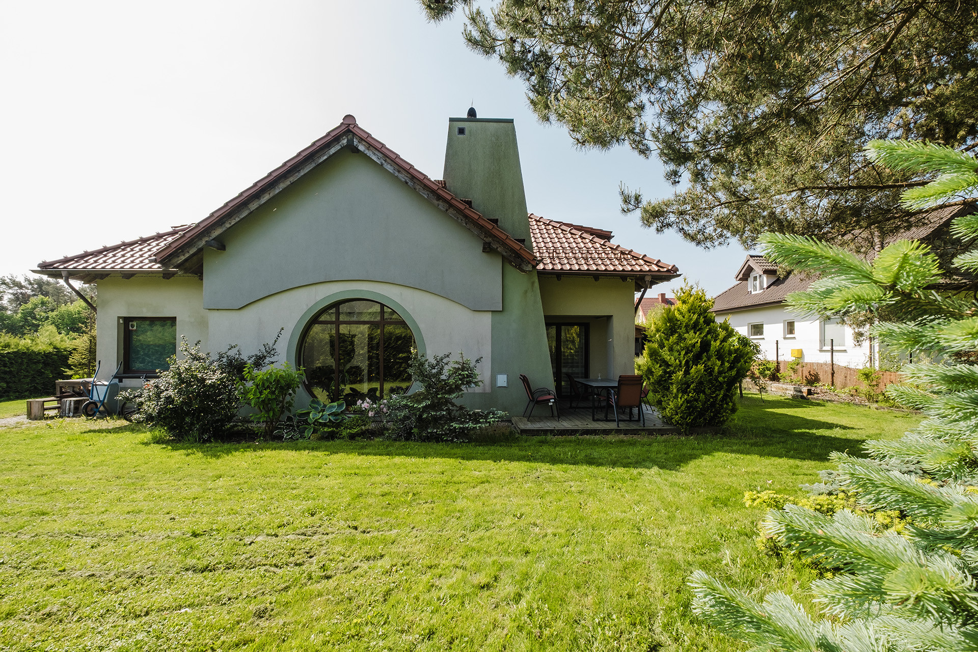 Wolnostojący o powierzchni całkowitej ponad 208,3 m2, usadowiony na narożnej, płaskiej działce o powierzchni 1180 m2 z bezpośrednim jednym sąsiedztwem, polaną leśną i polem nieużytkowanym.