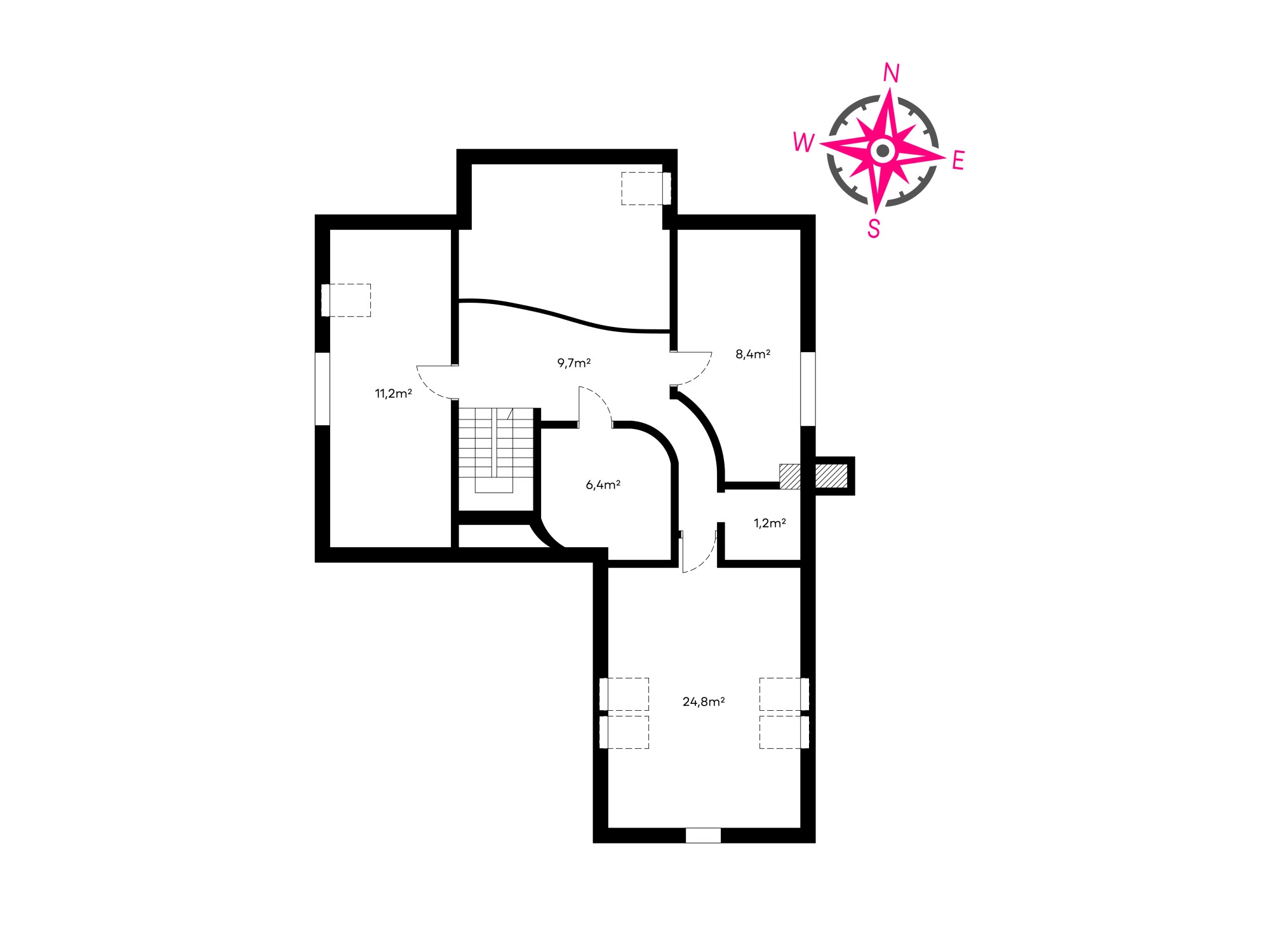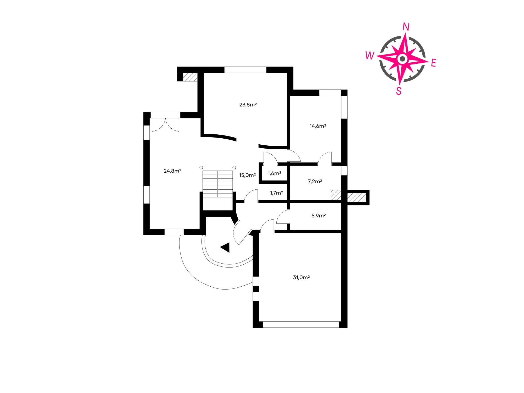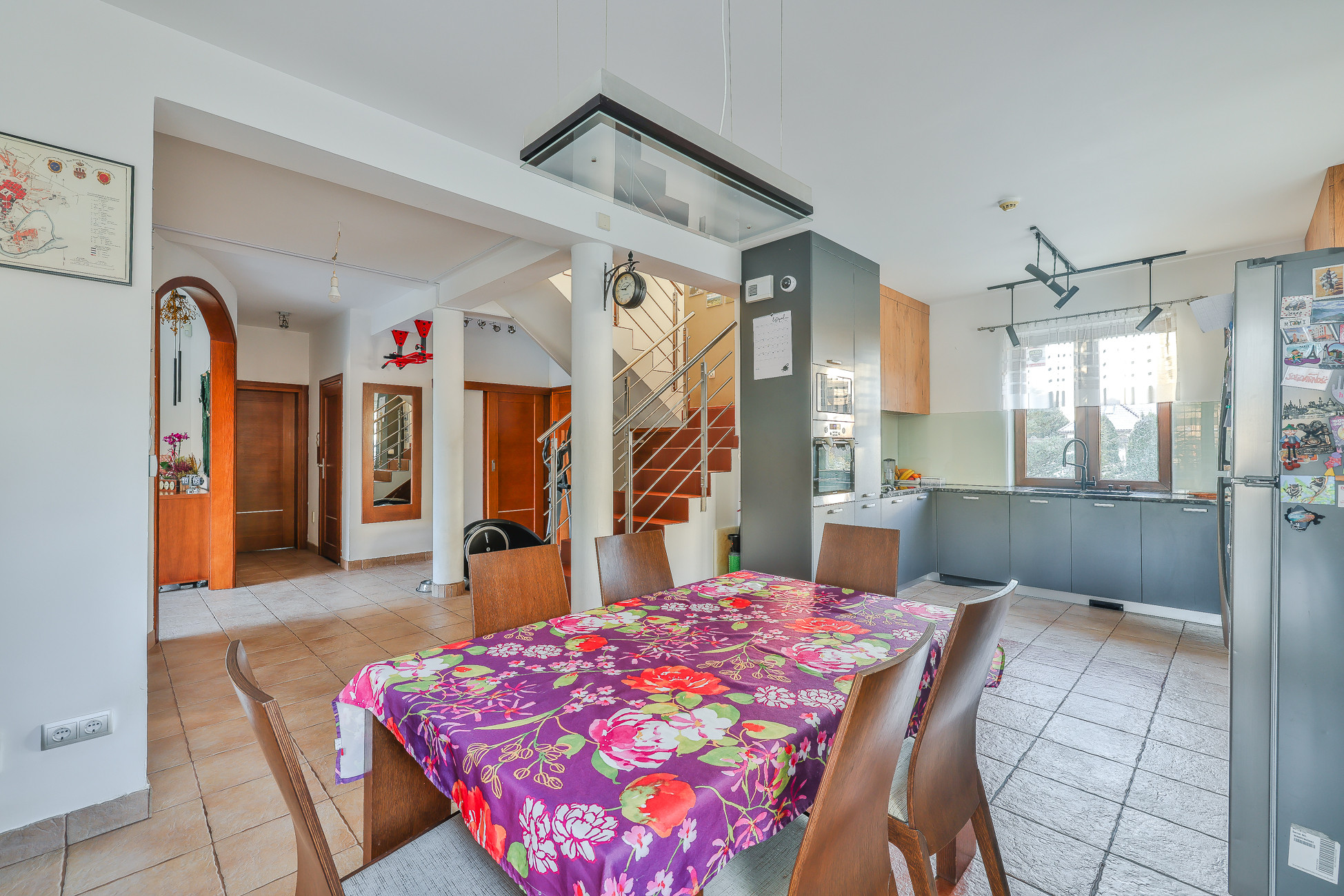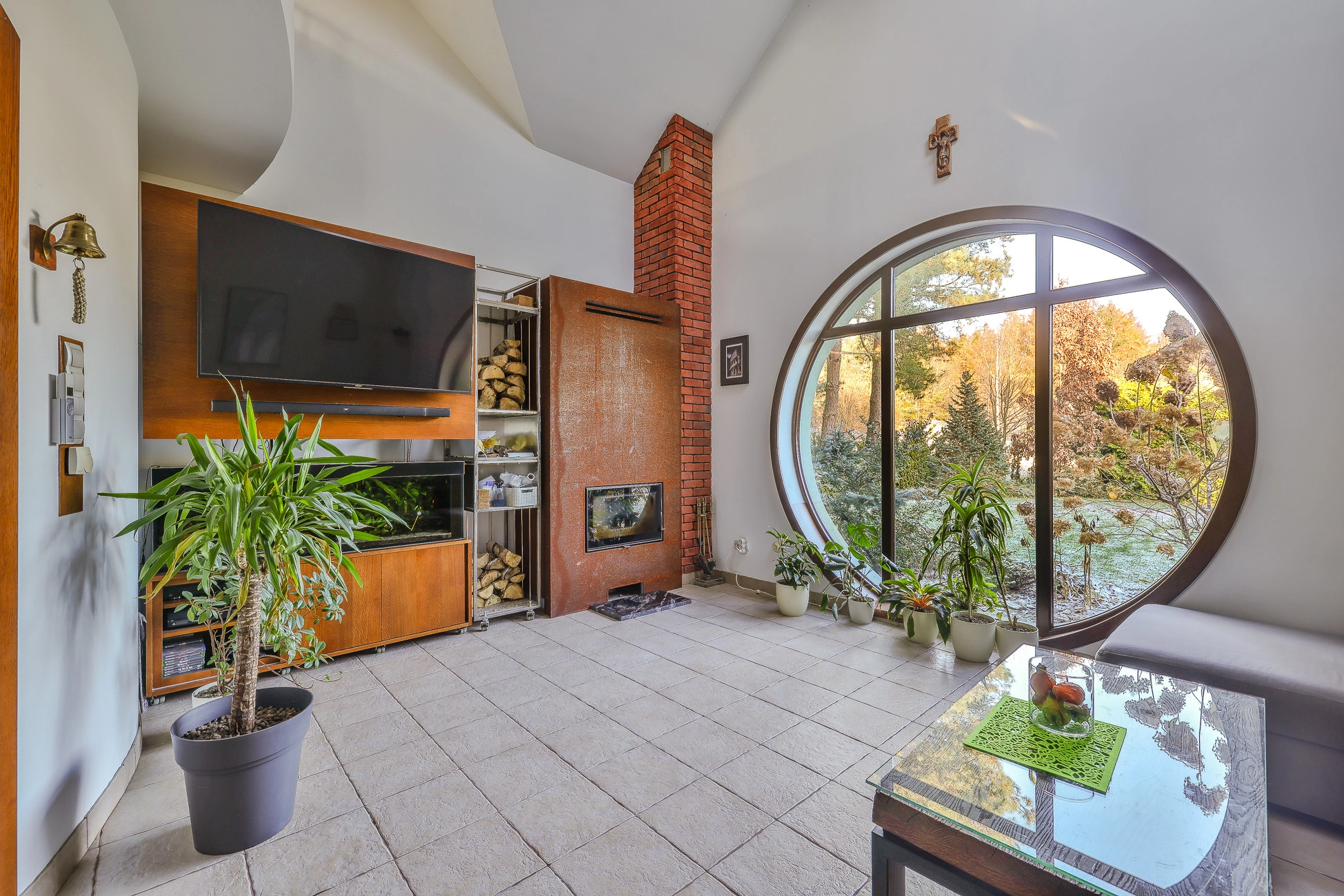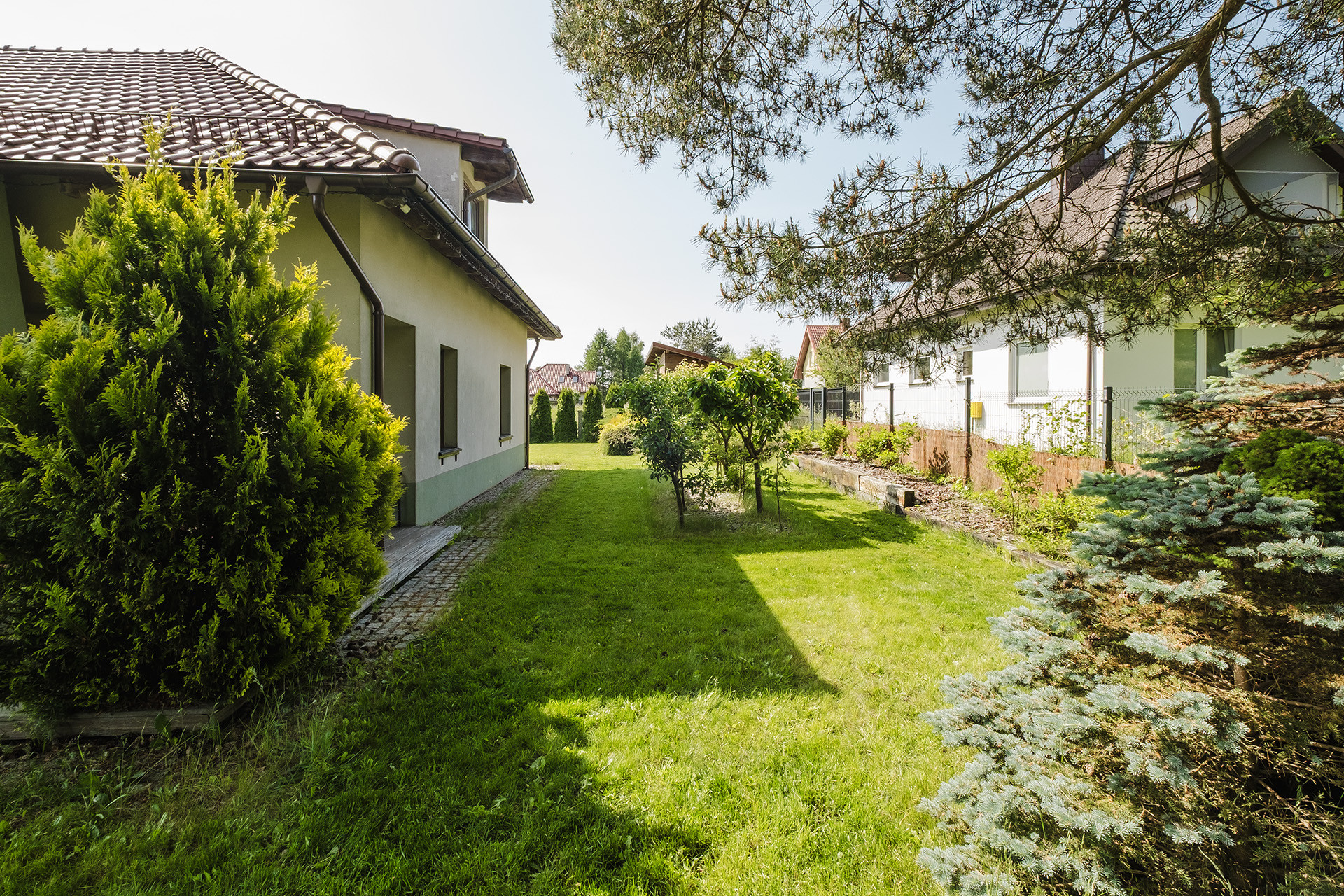 Wolnostojący o powierzchni całkowitej ponad 208,3 m2, usadowiony na narożnej, płaskiej działce o powierzchni 1180 m2 z bezpośrednim jednym sąsiedztwem, polaną leśną i polem nieużytkowanym.