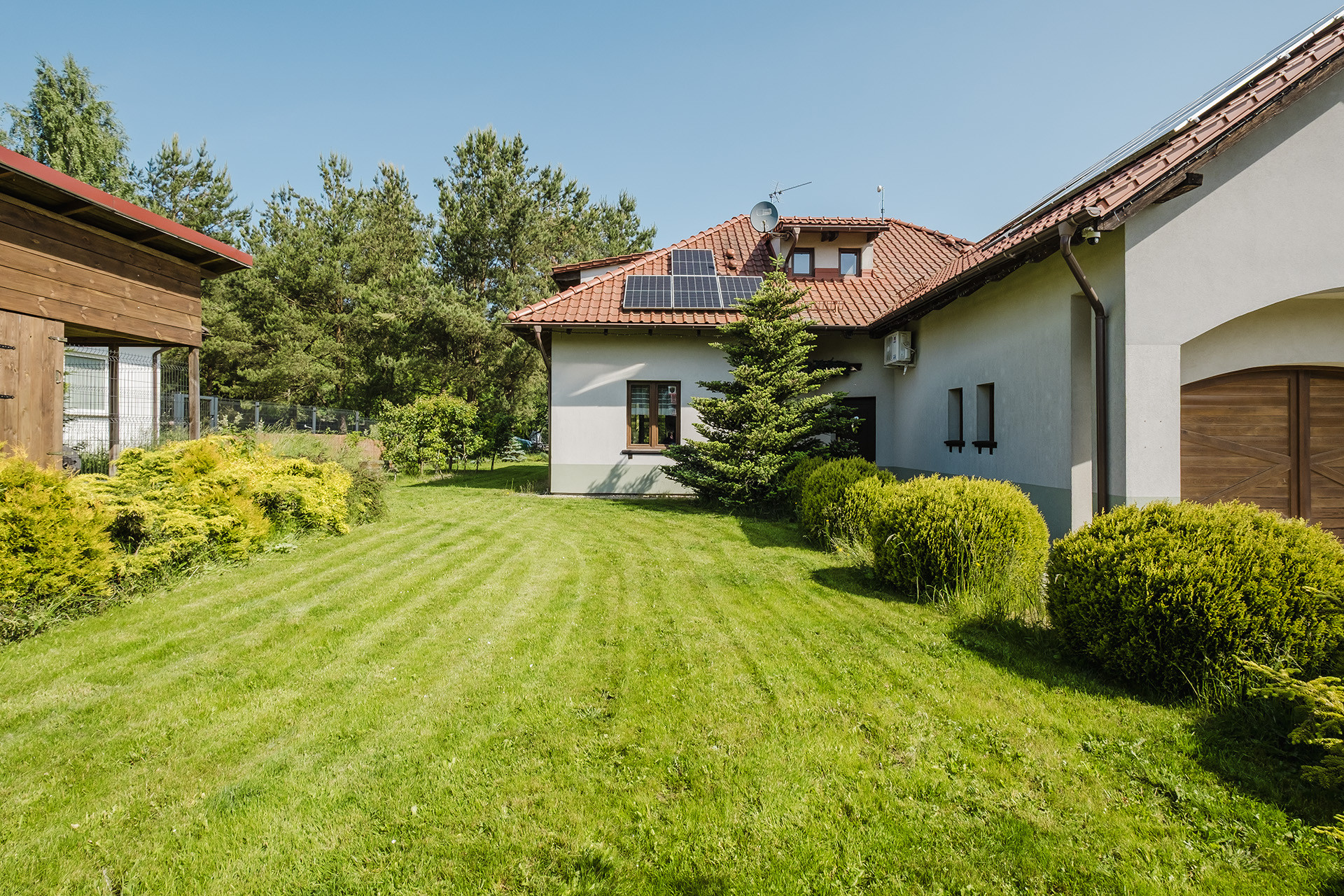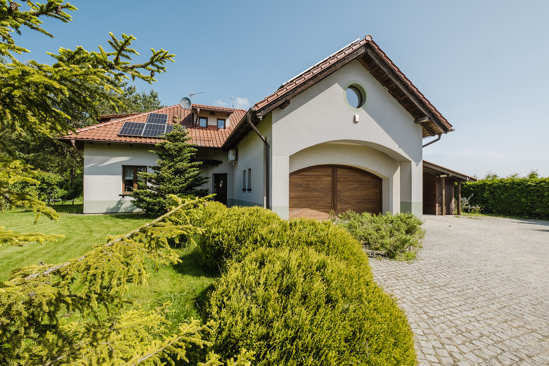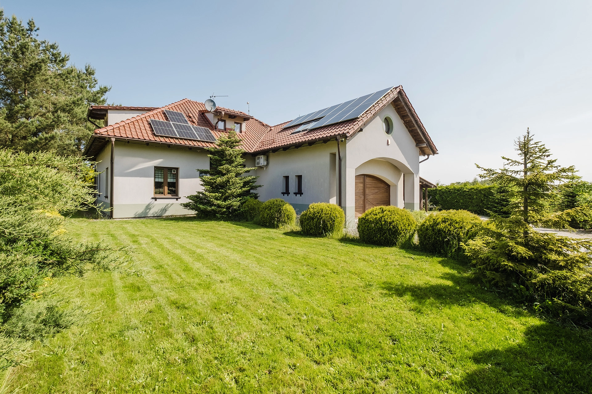 Dom jest podłączony do kanalizacji, jest również wyposażony w instalację fotowoltaiczną