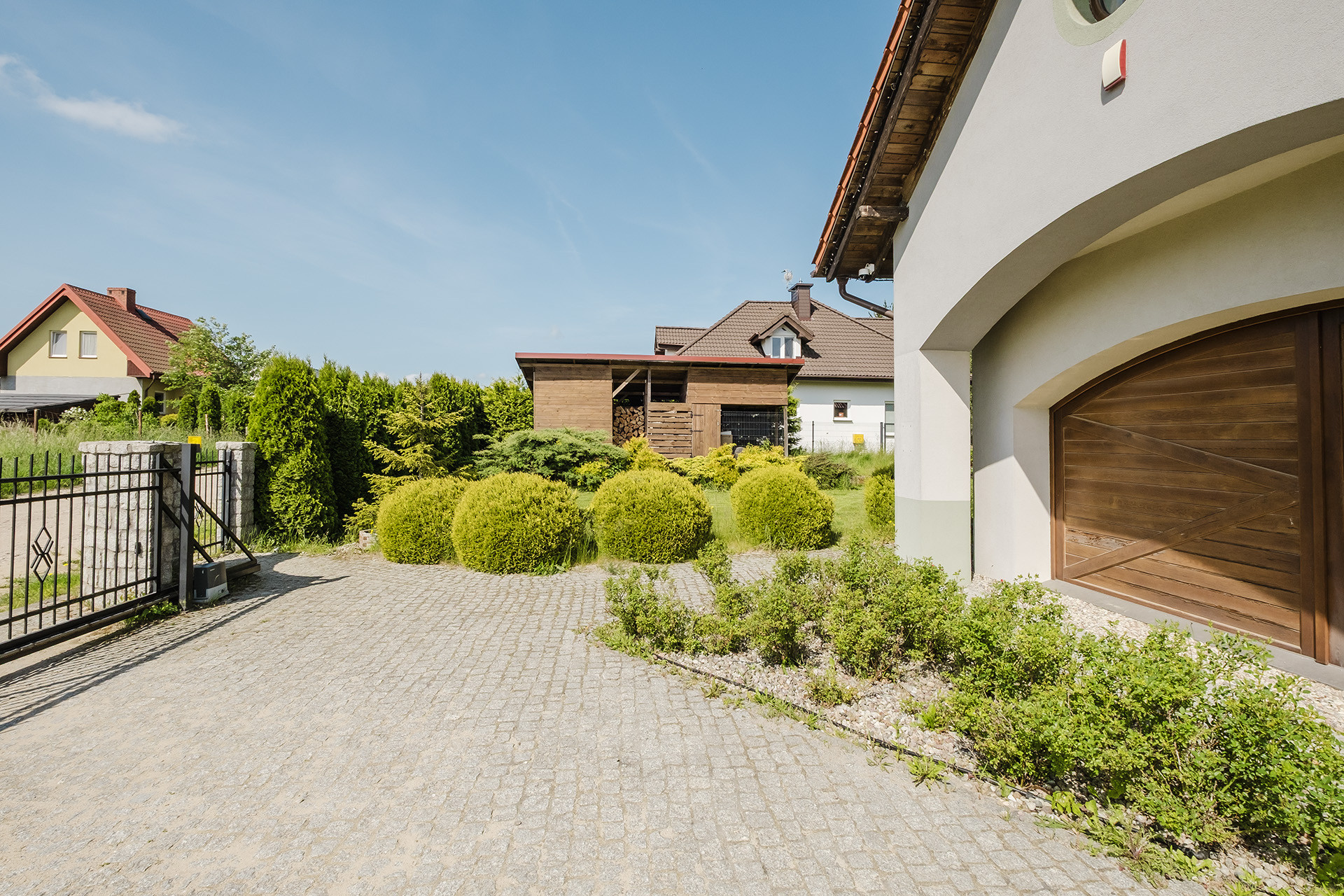 o powierzchni 1180 m2, doskonale zagospodarowana z licznymi nasadzeniami, wiatą garażową z szopą/warsztatem oraz wiatą pełniącą funkcję składu na drewno. Działka jest ogrodzona z trzech strona panelami a od frontu przęsłami stalowymi na podmurówce z kostki granitowej. Wjazd na posesję zapewnia przesuwna brama automatyczna.
