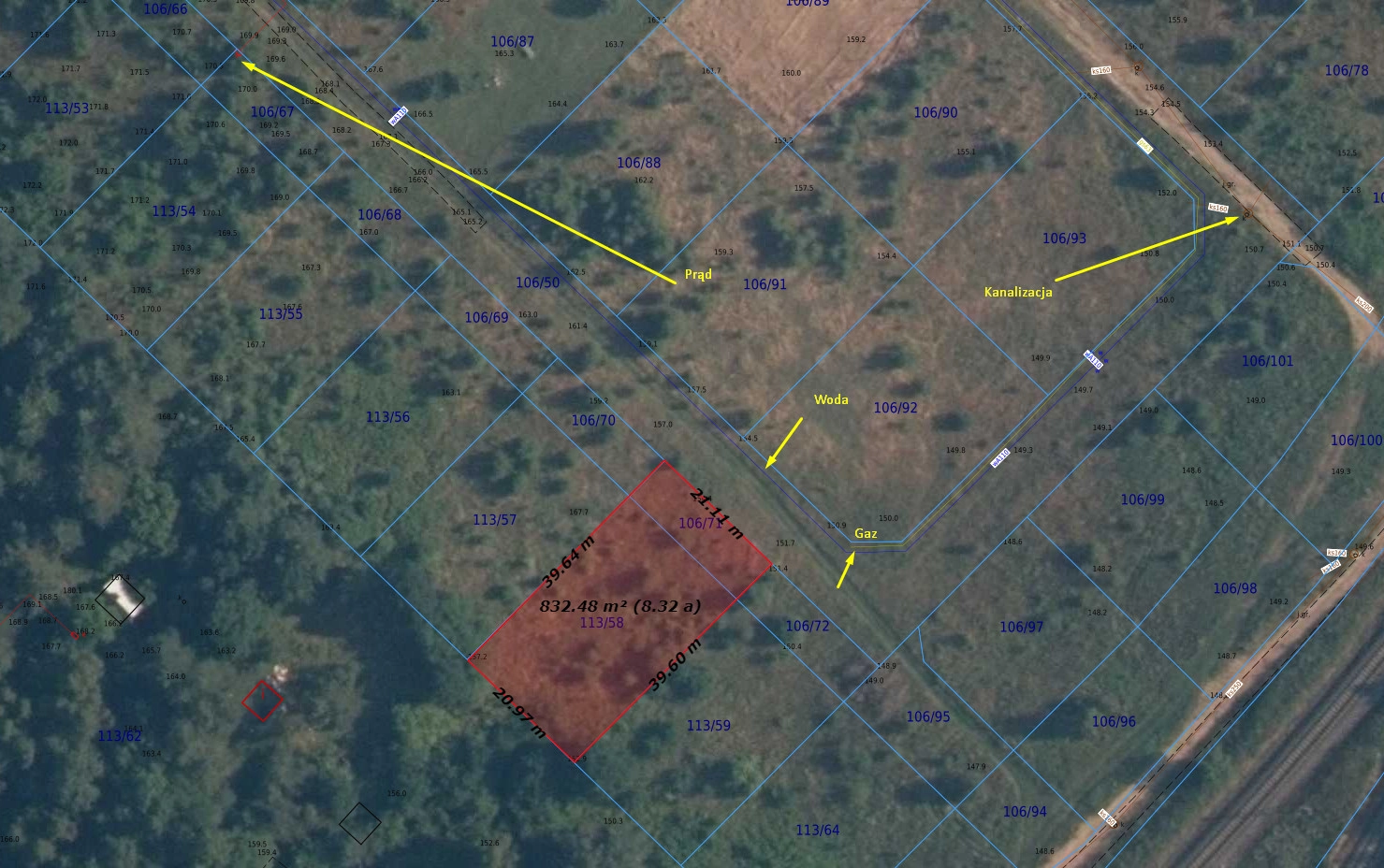 Działka budowlana o powierzchni ok. 833m2. Wymiary udostępniam w galerii zdjęć. Woda i gaz jest w drodze przed działką, prąd 85m od działki a kanalizacja 95 m.