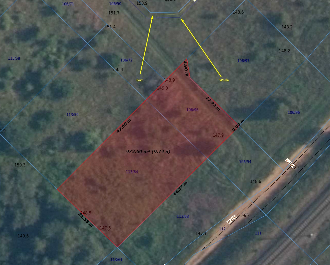 Działka budowlana o powierzchni ok. 918m2. Wymiary udostępniam w galerii zdjęć. Woda i gaz jest w drodze przed działką, prąd 120m od działki a kanalizacja 80 m.