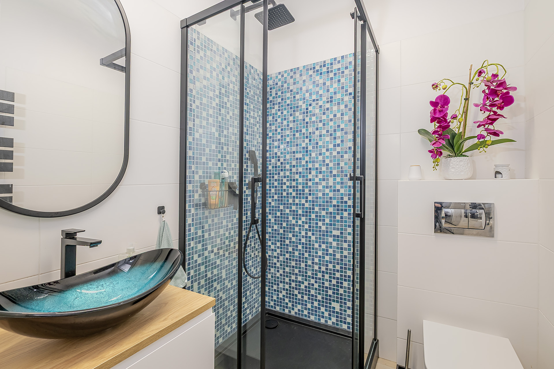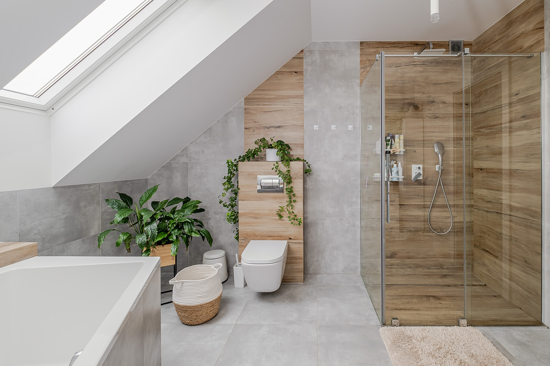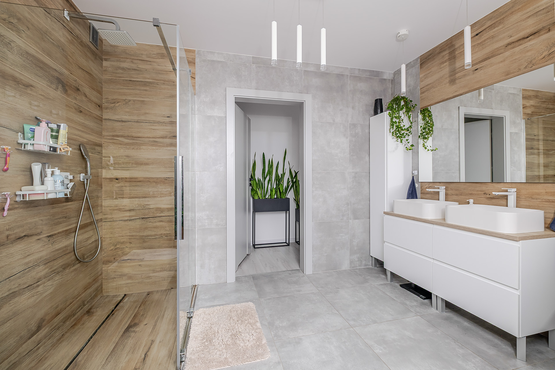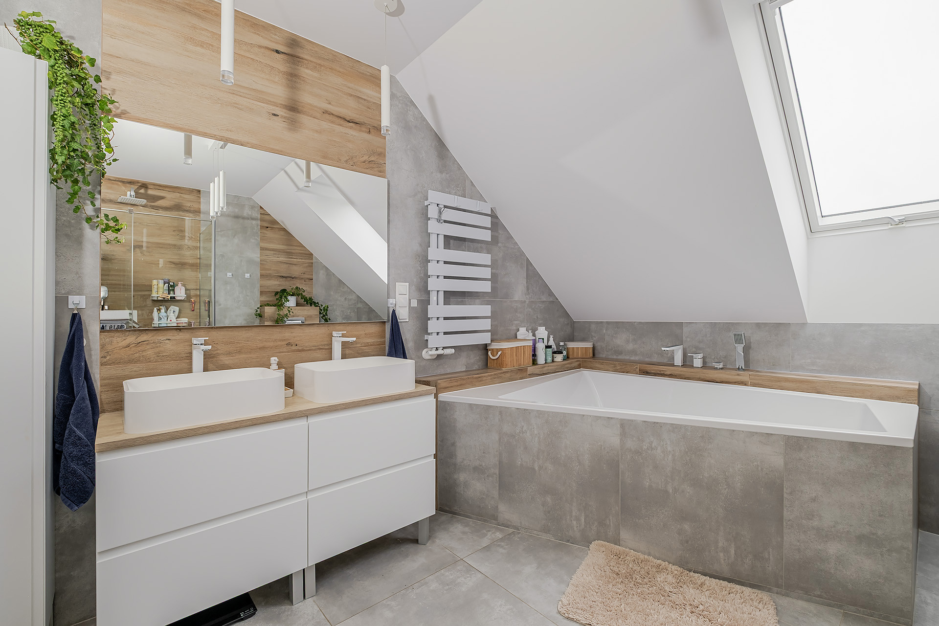 – przestronna łazienka z trapezową wanną i prysznicem;