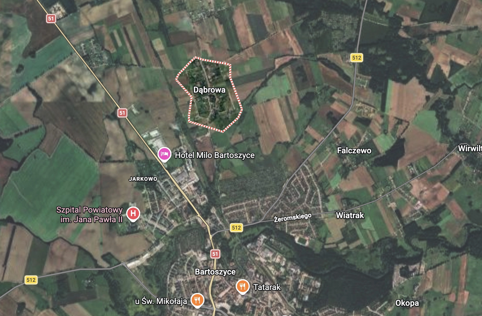 Działka zlokalizowana jest w miejscowości Dąbrowa, w bezpośrednim sąsiedztwie miasta Bartoszyce – ośrodka powiatowego oferującego pełną infrastrukturę handlowo-usługową, edukacyjną oraz administracyjną.