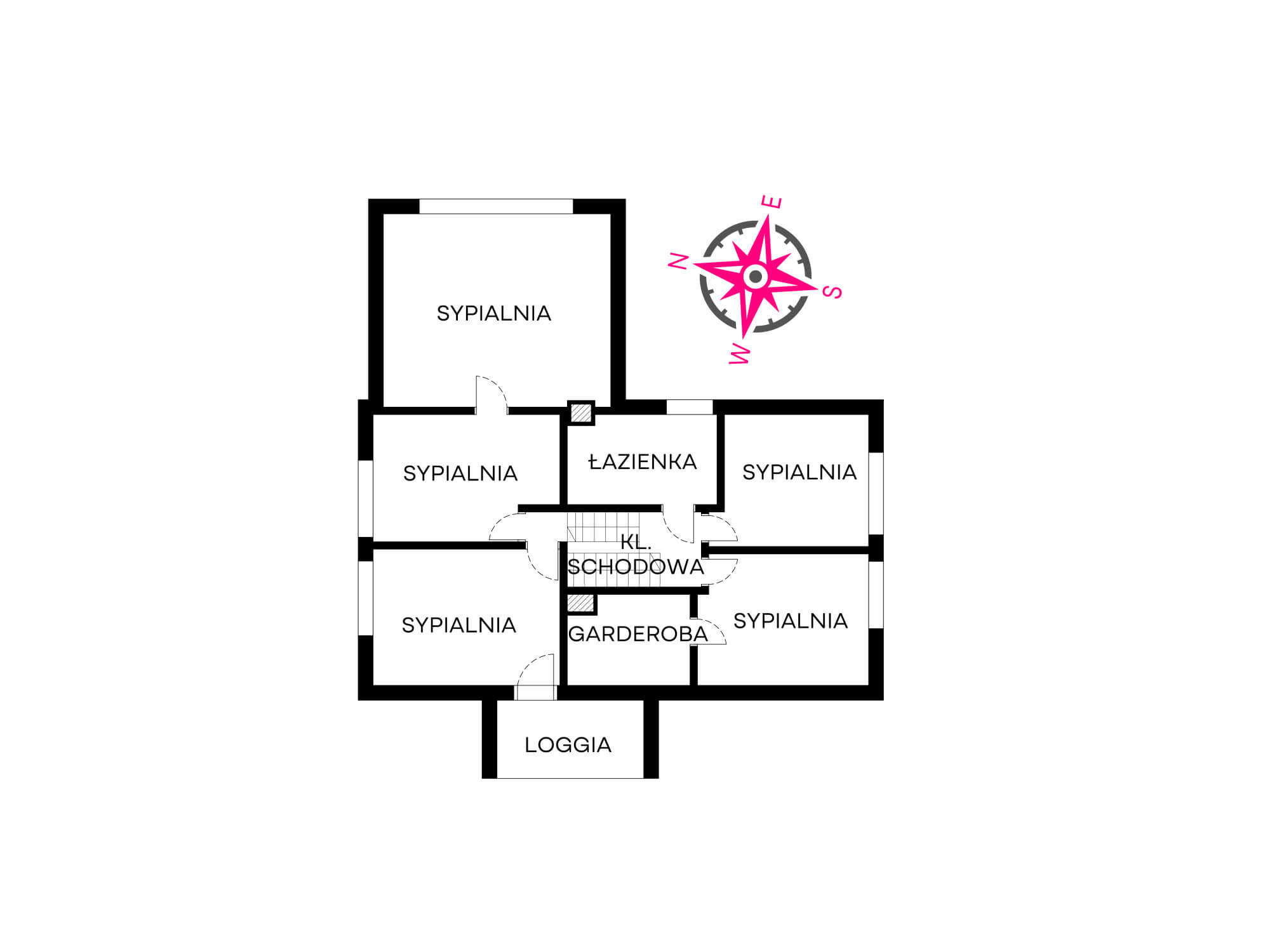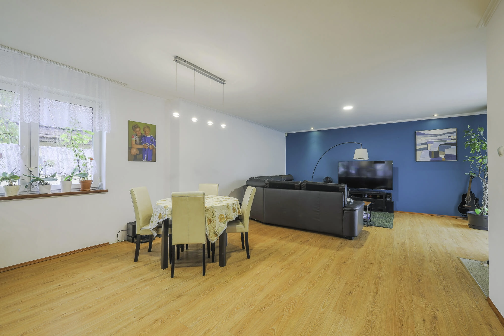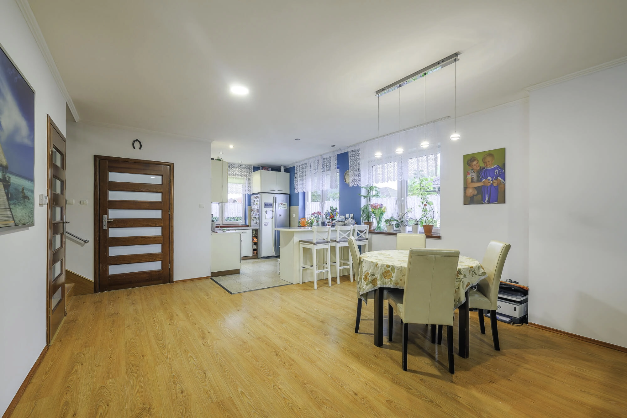 – łącznie aż pięć sypialni w tym jedna z obszerną garderobą (jednej z pokoi przechodni ale jest możliwość oddzielania ścianką działową, a jeden z pokoi jest obecnie połączony w jedną dużą przestrzeń).
