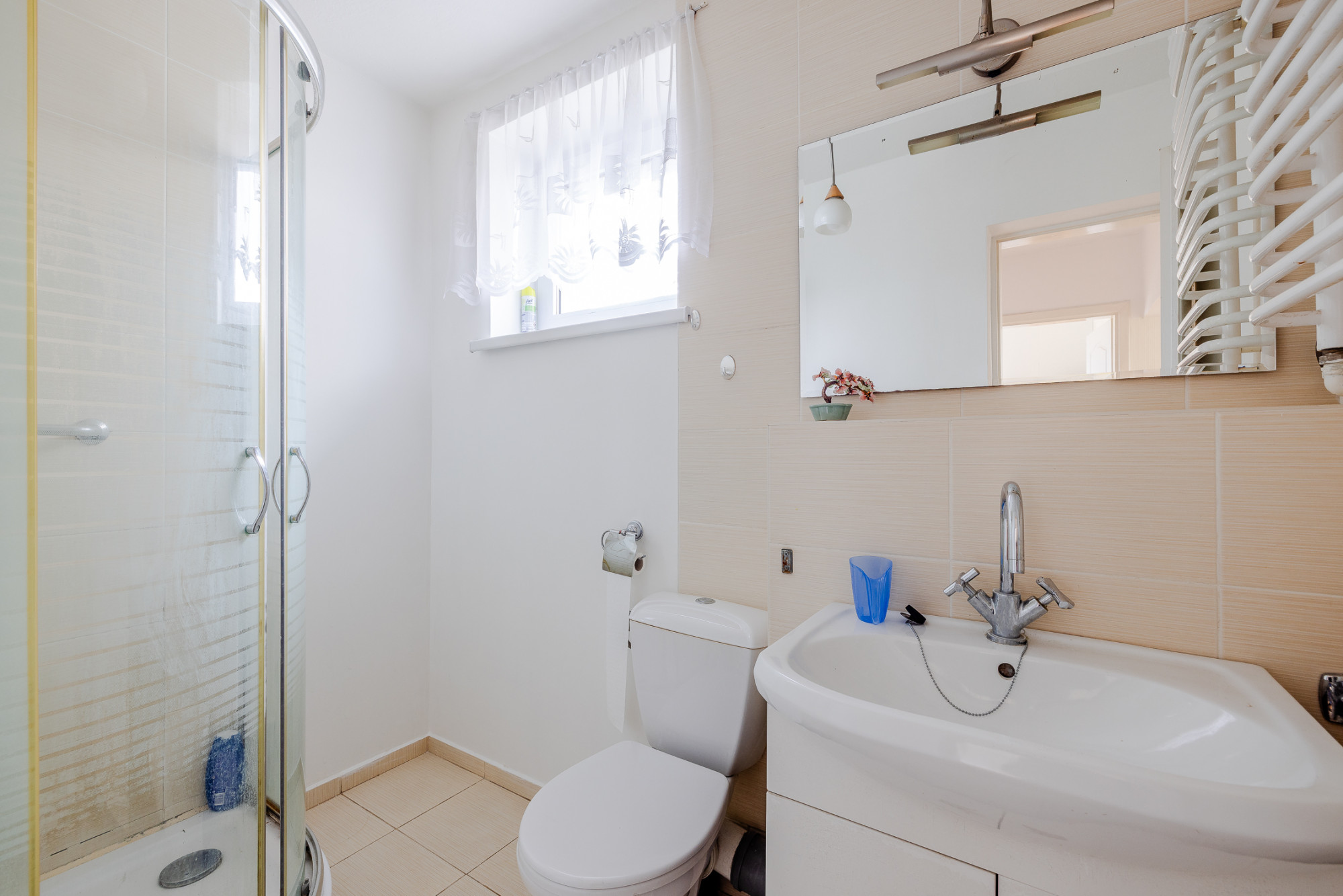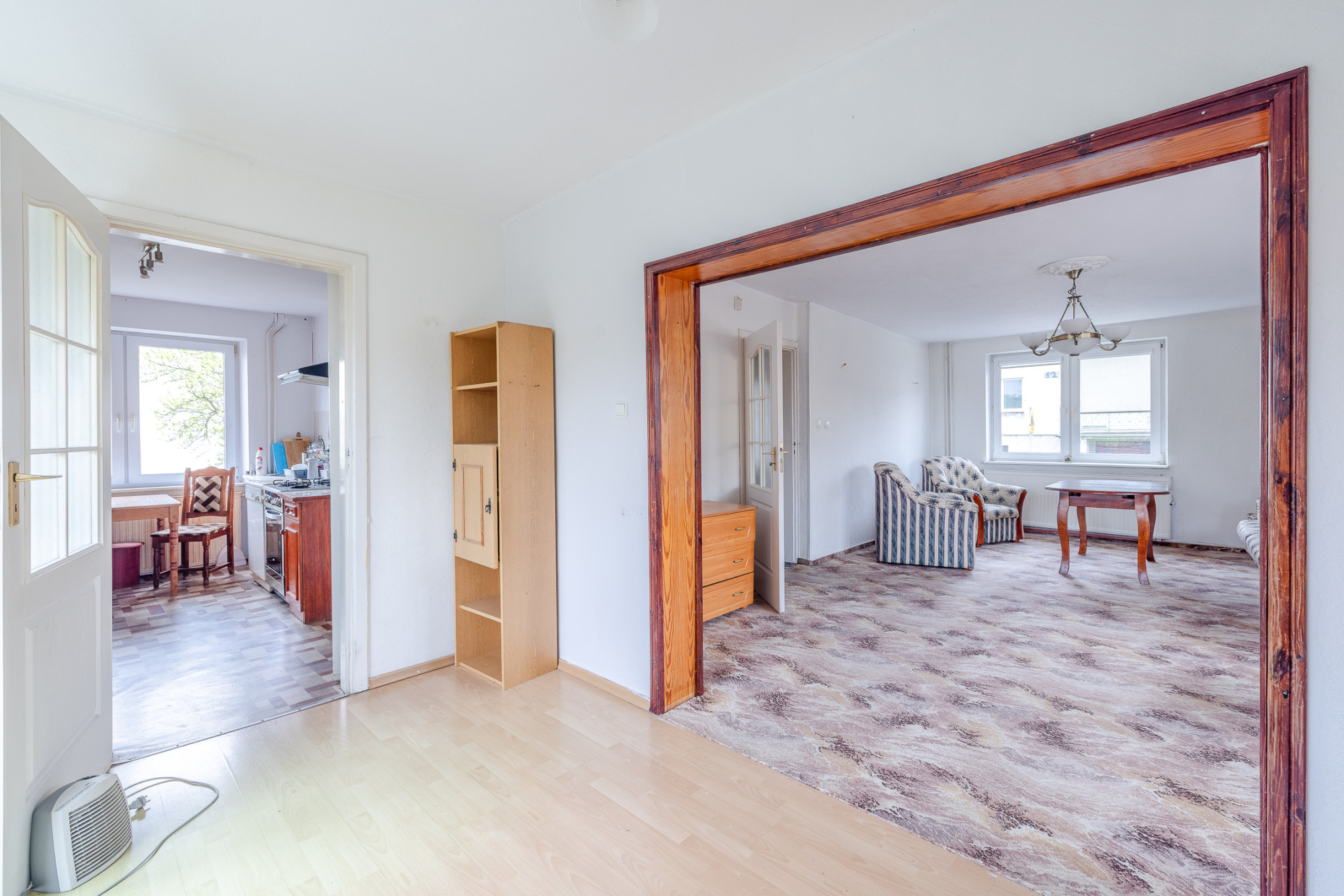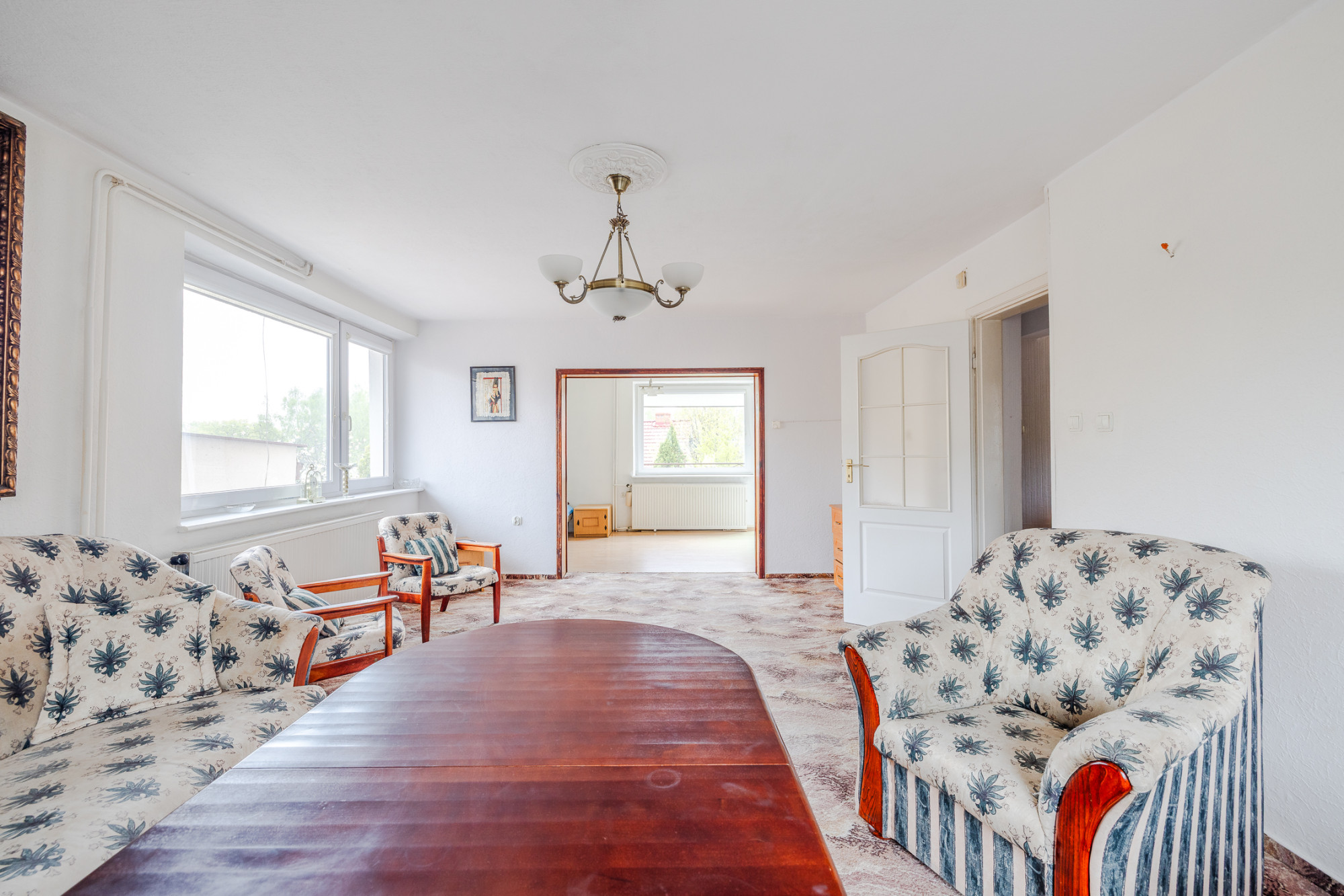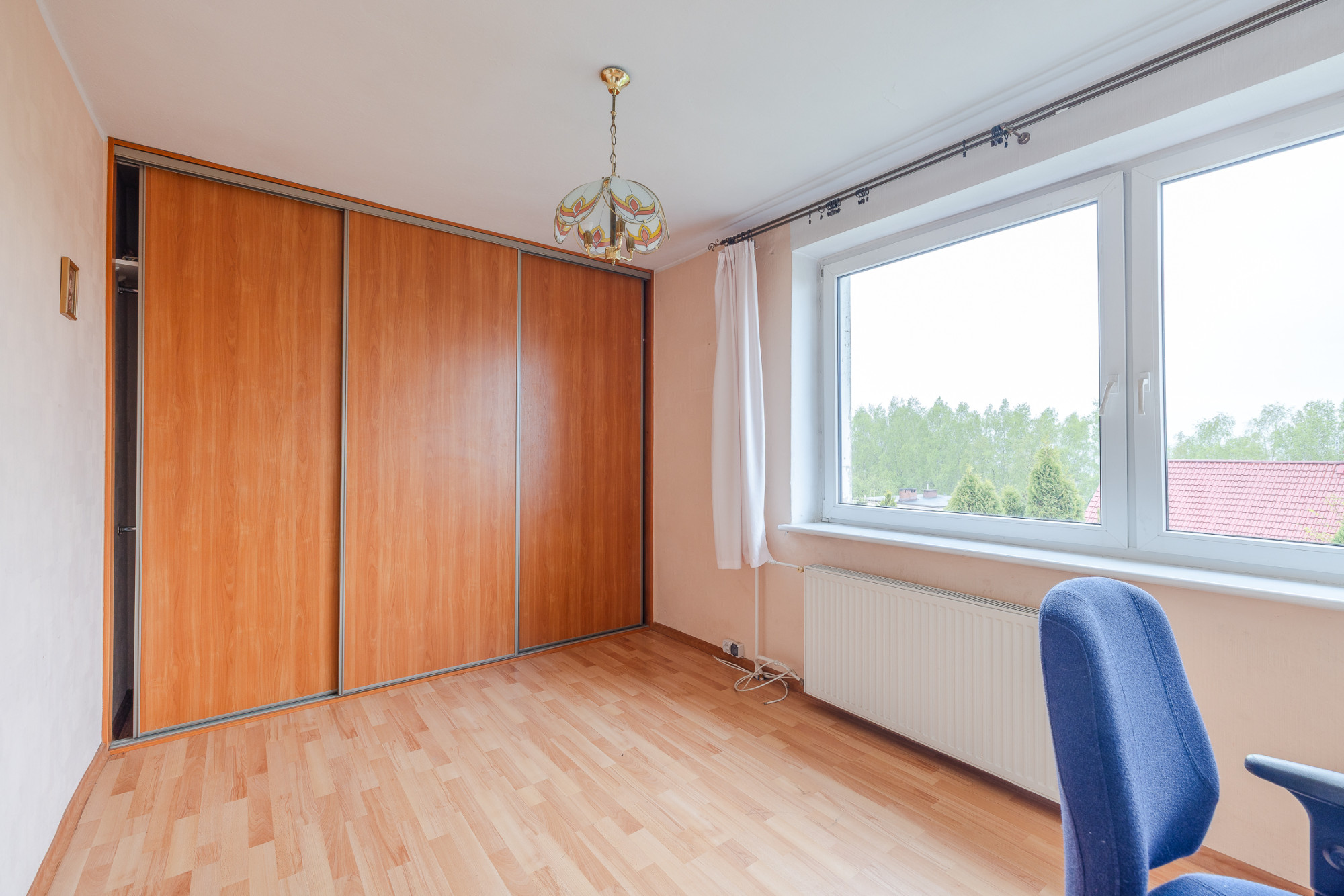 Dom ma bardzo funkcjonalny rozkład pomieszczeń. Na parterze znajduje się hol, salon z jadalnią z wyjściem na taras i odrębną kuchnią oraz toaleta, na piętrze znajdują się 3 ustawne pokoje (ok. 20 m2, 15 m2, 15 m2) z widokiem na ogród oraz balkon i łazienka. Jasna piwnica z oknami i oddzielnym wejściem daje możliwość wydzielenia odrębnego mieszkania lub pokoi.
