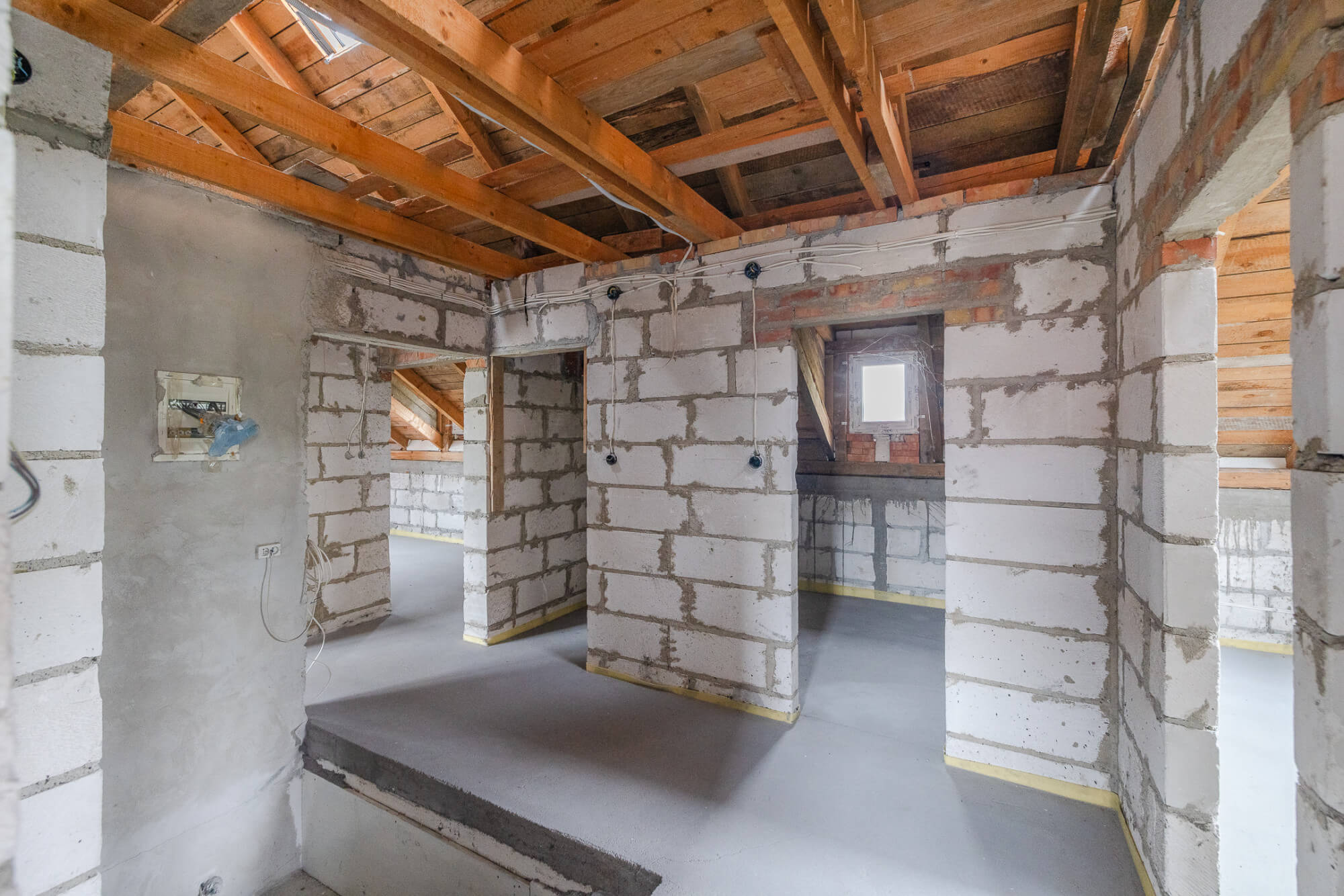 Dom nie ma formalnie zakończonej budowy (brak elewacji i wykończenia piętra), co daje możliwość rejestracji jako nowy właściciel kończący proces budowy