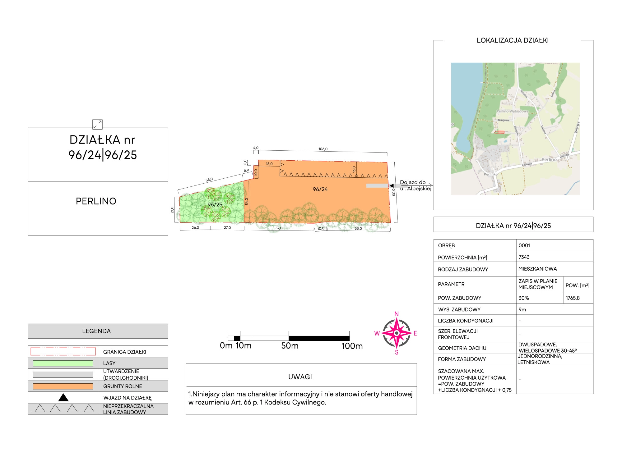 Działka położona jest w kameralnej i spokojnej kaszubskiej wsi- Perlino, w powiecie wejherowskim, w gminie Gniewino. W okolicy znajdują się głównie domki letniskowe. Miejsce to ma wiele atutów- lasy, tereny zielone, kontakt z naturą, bliskość Jeziora Choczewskiego, do którego przez las spacerkiem można dojść w kilka minut; do morza około 12 kilometrów, a do Jeziora Żarnowieckiego- 10 kilometrów. Perlino zlokalizowane jest w odległości 3,2 km od znanej wsi Gniewino, 26 km od popularnego turystycznego kurortu Łeba i 22 km od Wejherowa.