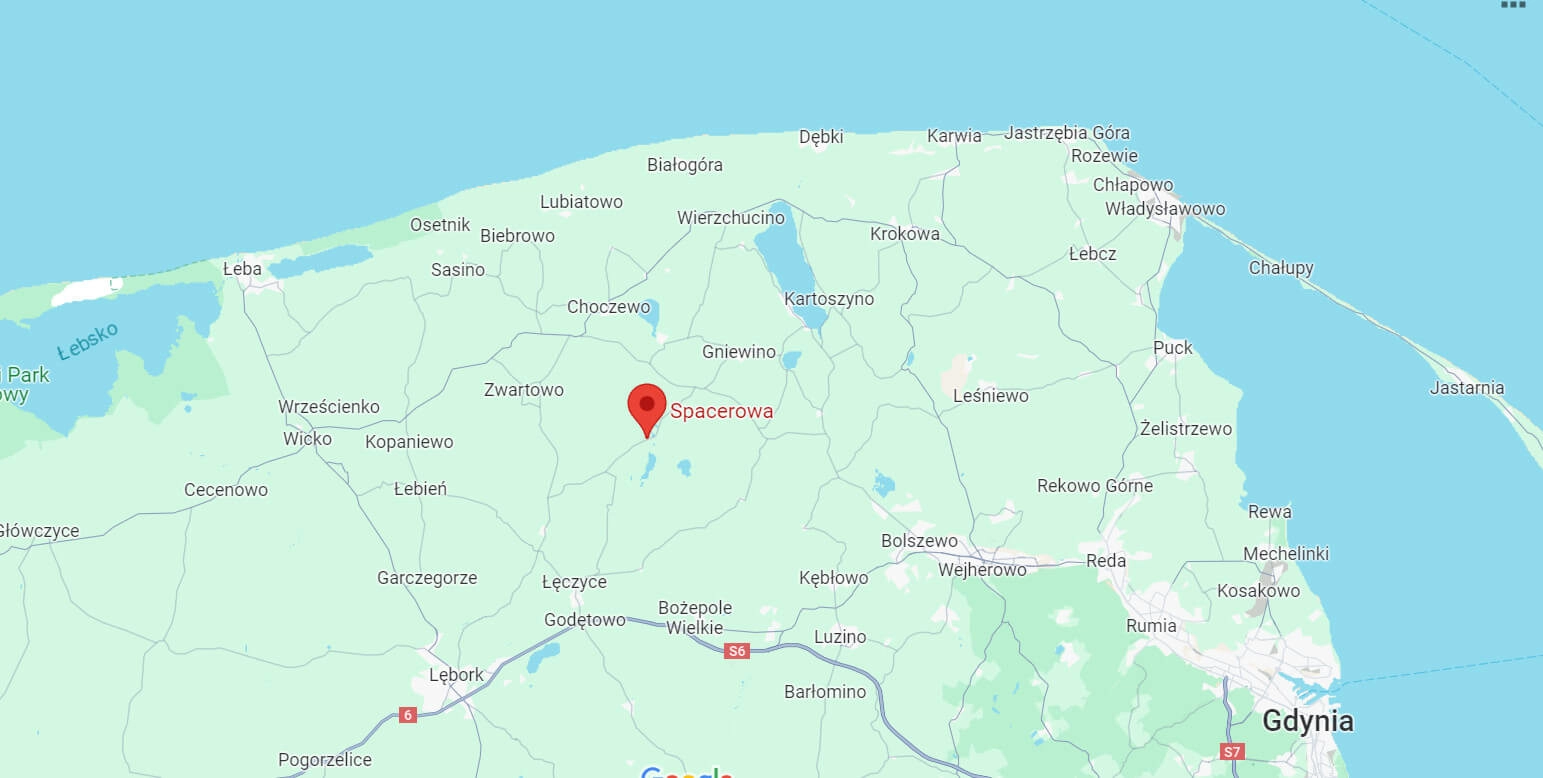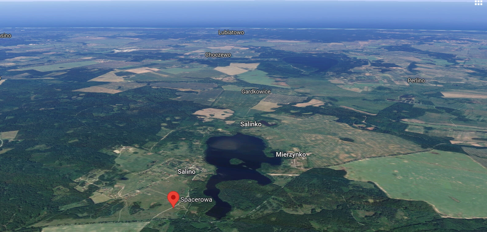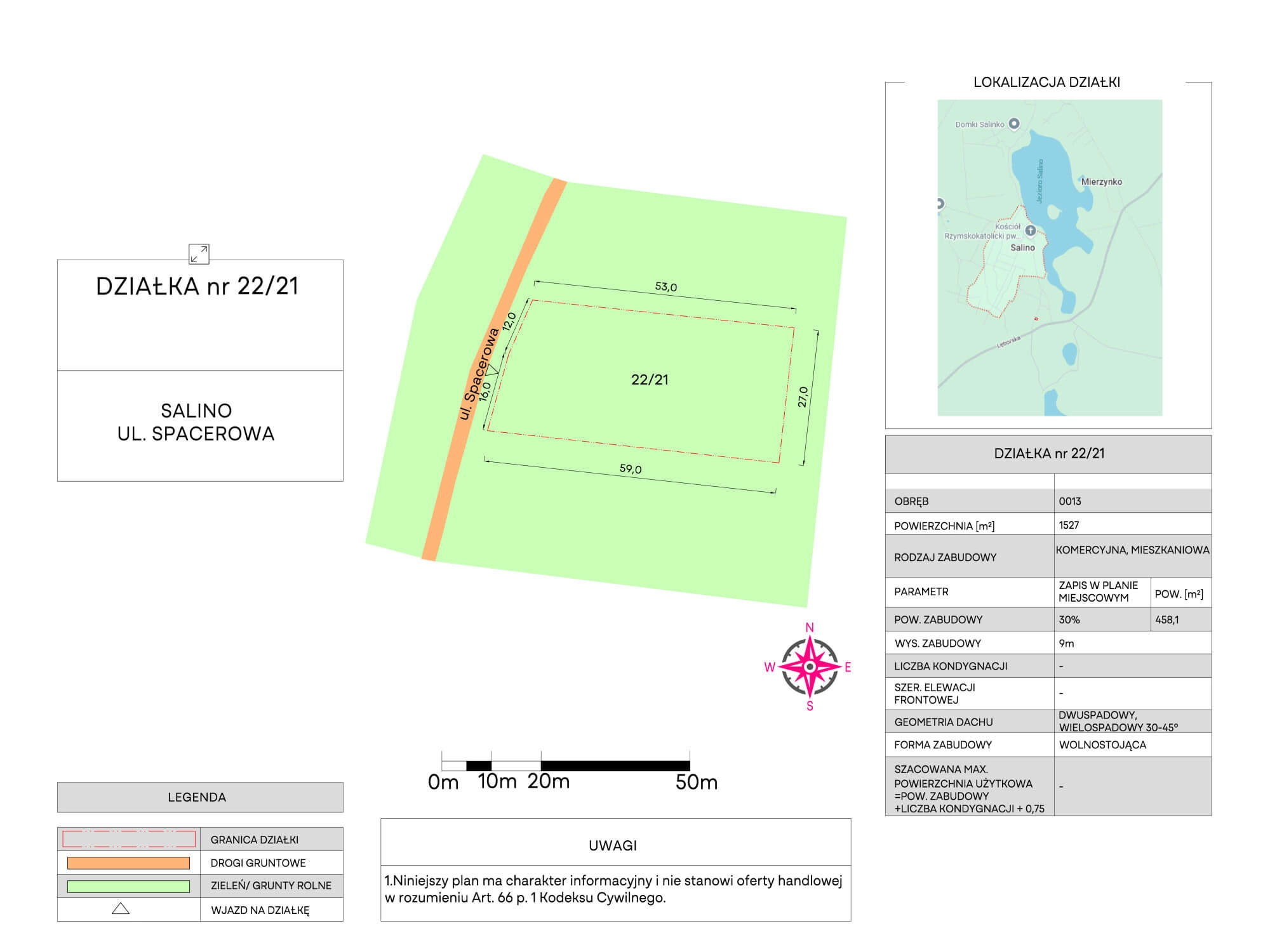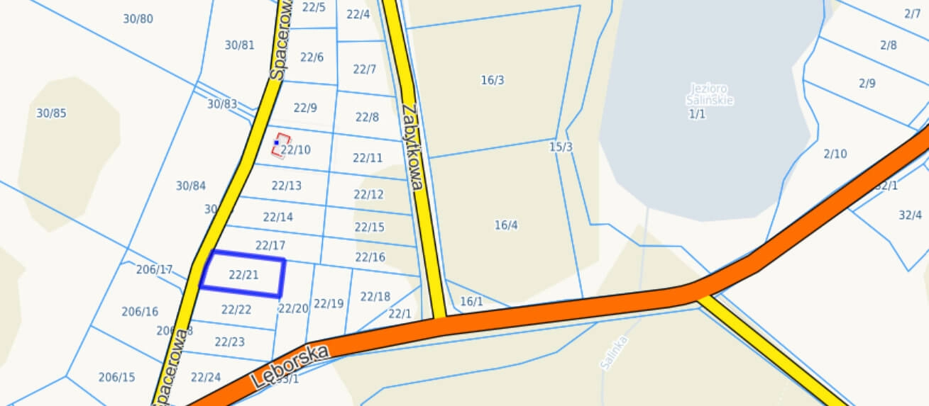 Działka o numerze 22/21 położona przy ul. Spacerowej, o powierzchni 1.527 m2, w kształcie prostokąta i z wjazdem od strony zachodniej. Teren płaski. Odległość od Jeziora Salino w linii prostej to ok. 250 m. Blisko także tereny leśne oraz drugie piękne jezioro Jezioro Czarne (piękne i kameralne śródleśne jezioro rynnowe położone na terenie Puszczy Wierzchucińskiej).