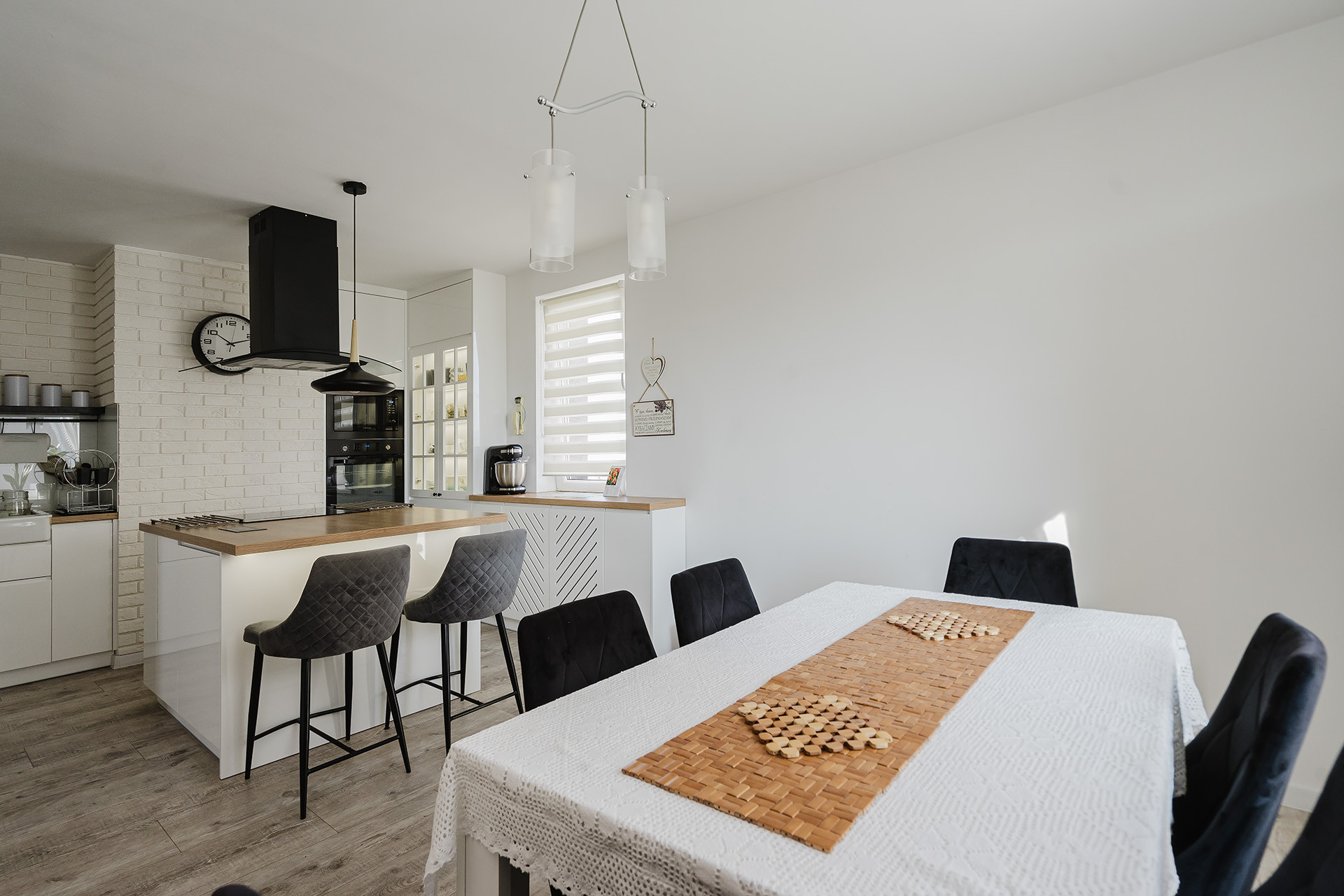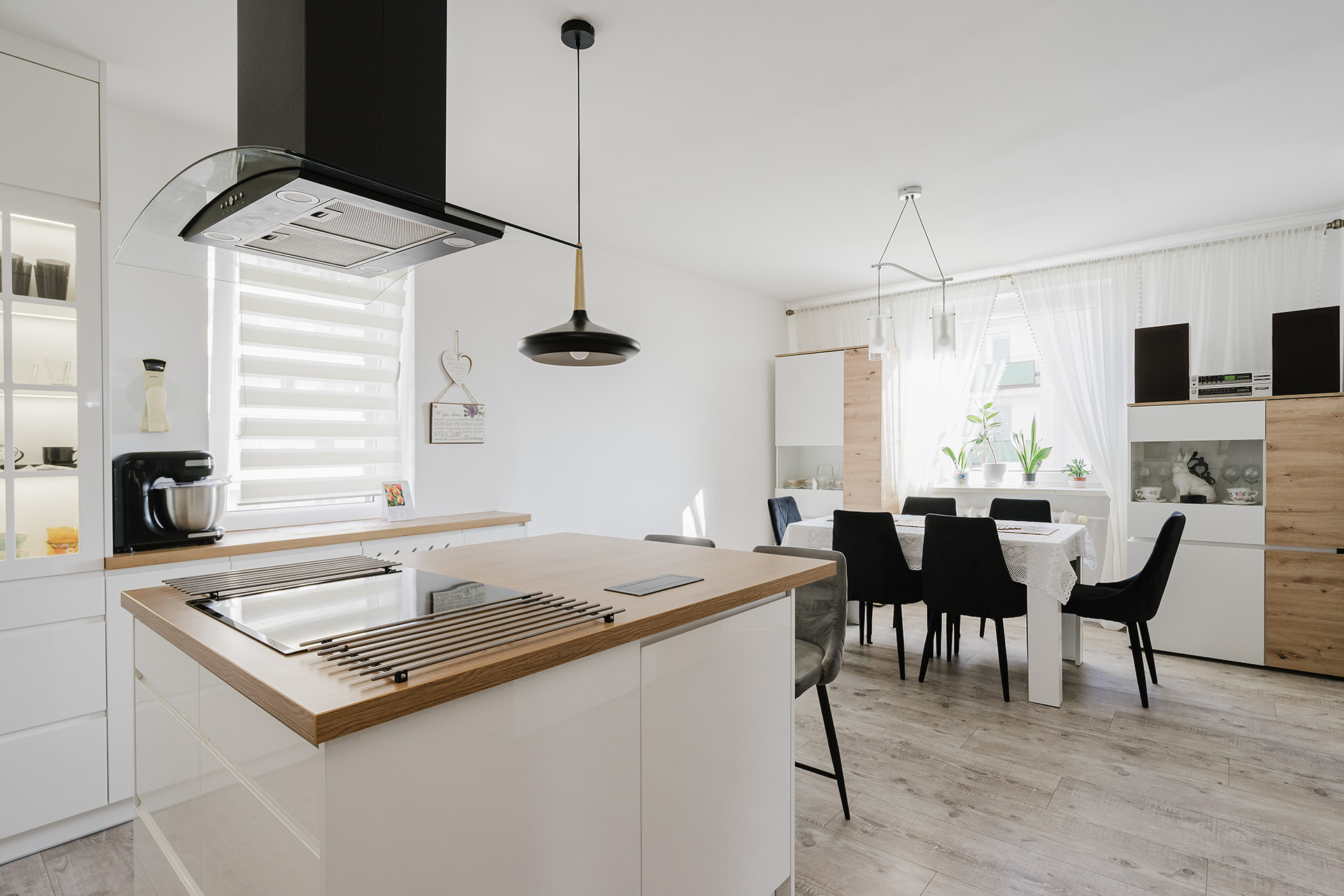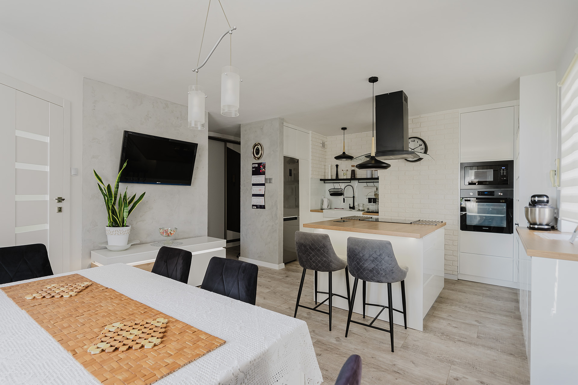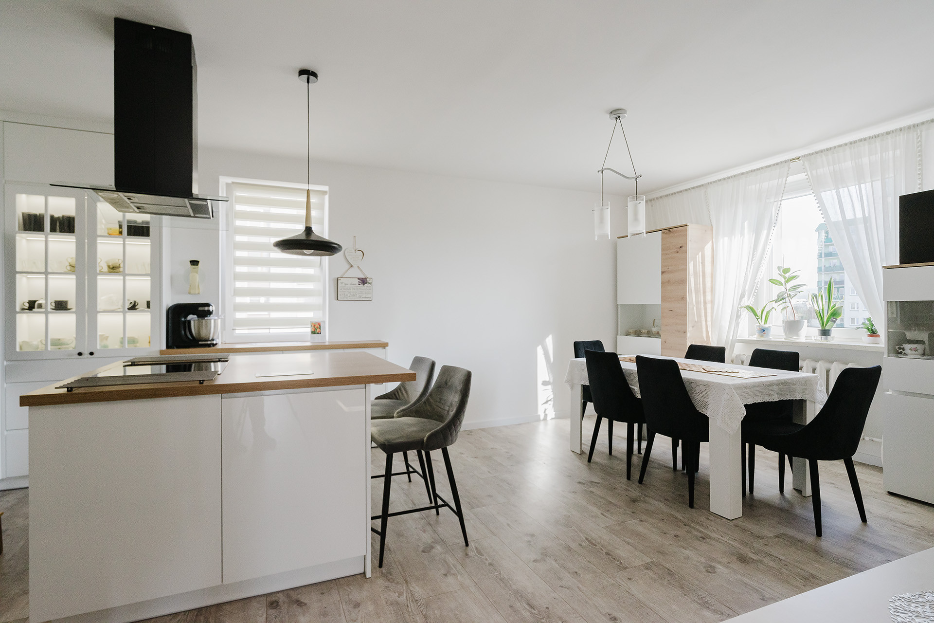 • Salonu z otwartą kuchnia, która posiada dużą wyspę i okno