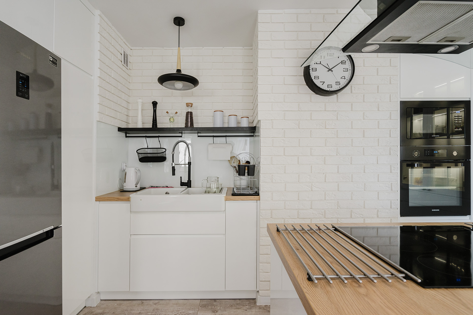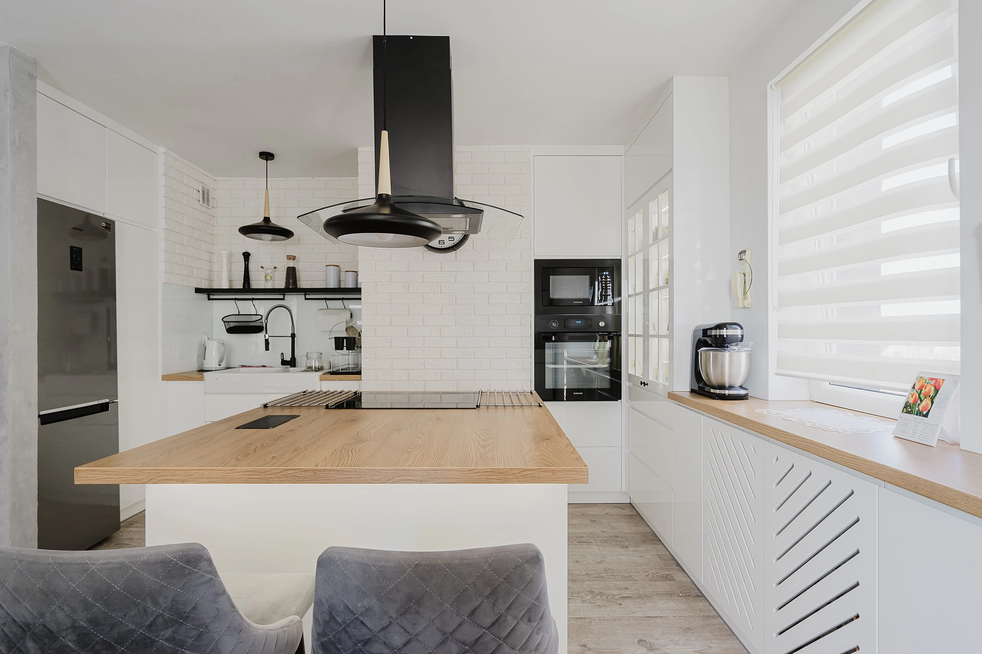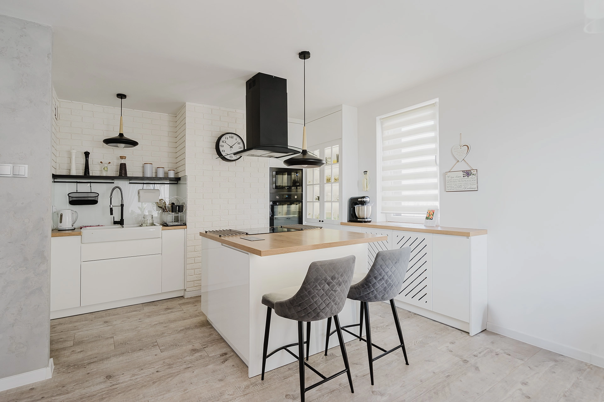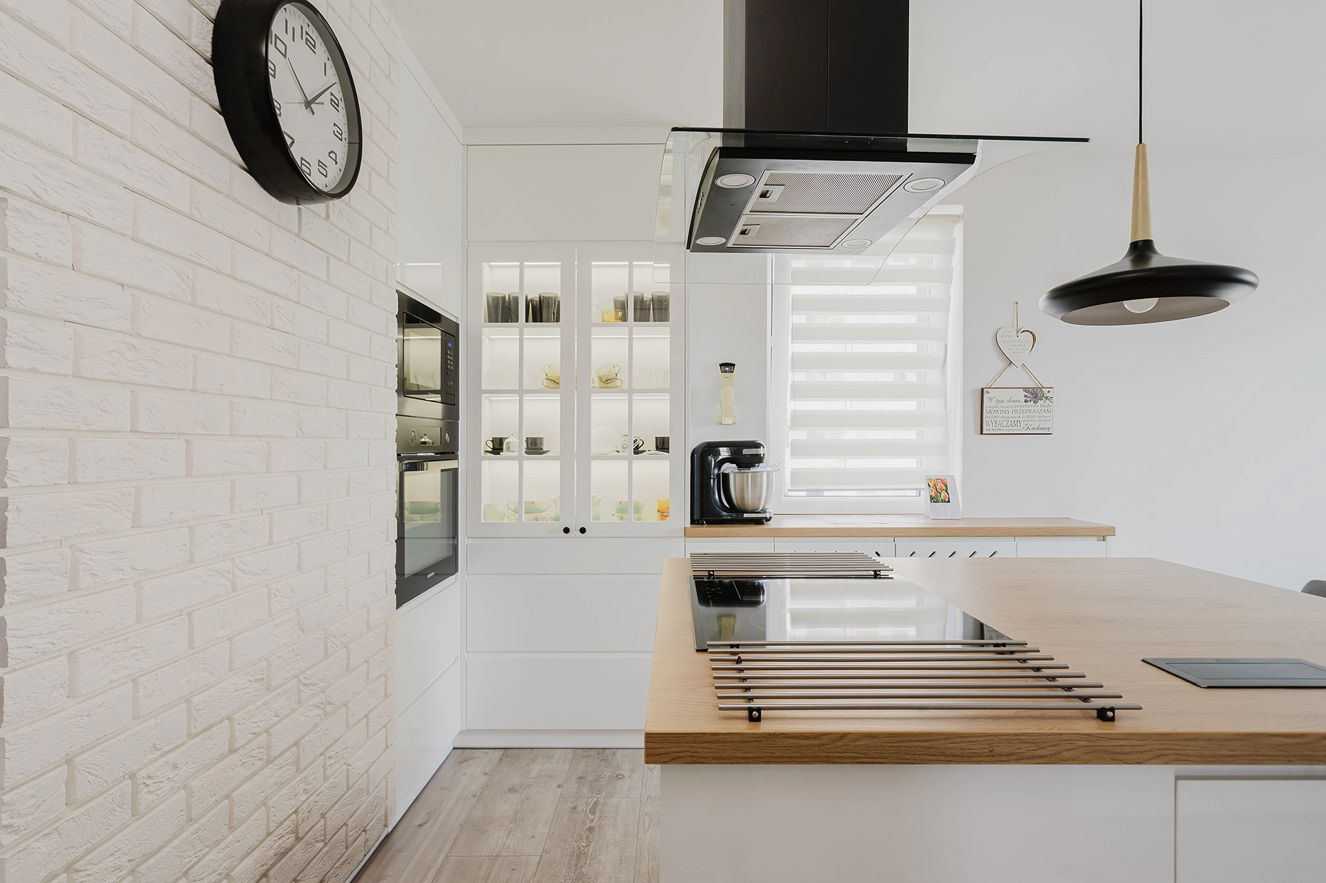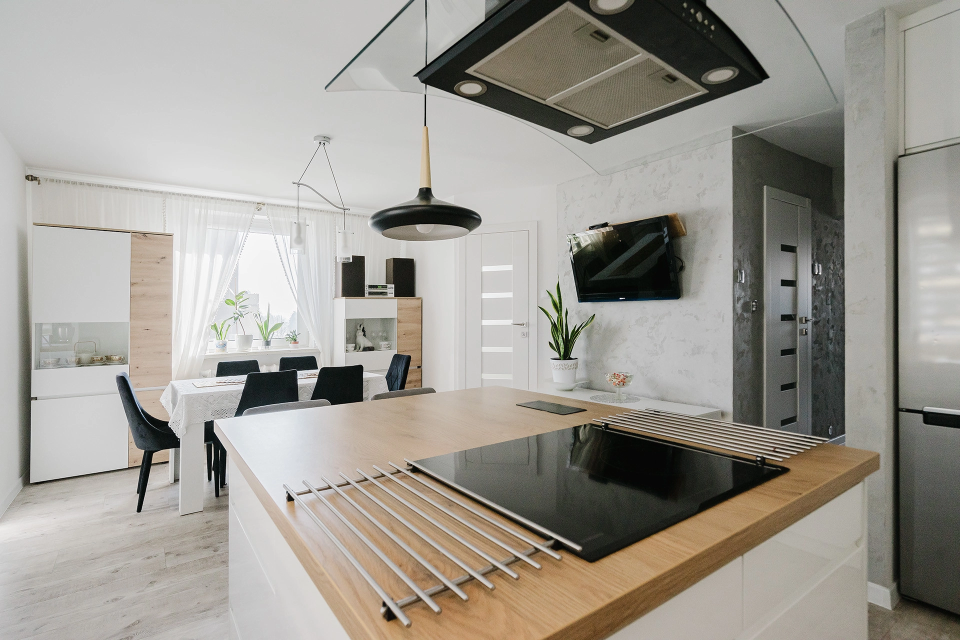 • Salonu z otwartą kuchnia, która posiada dużą wyspę i okno