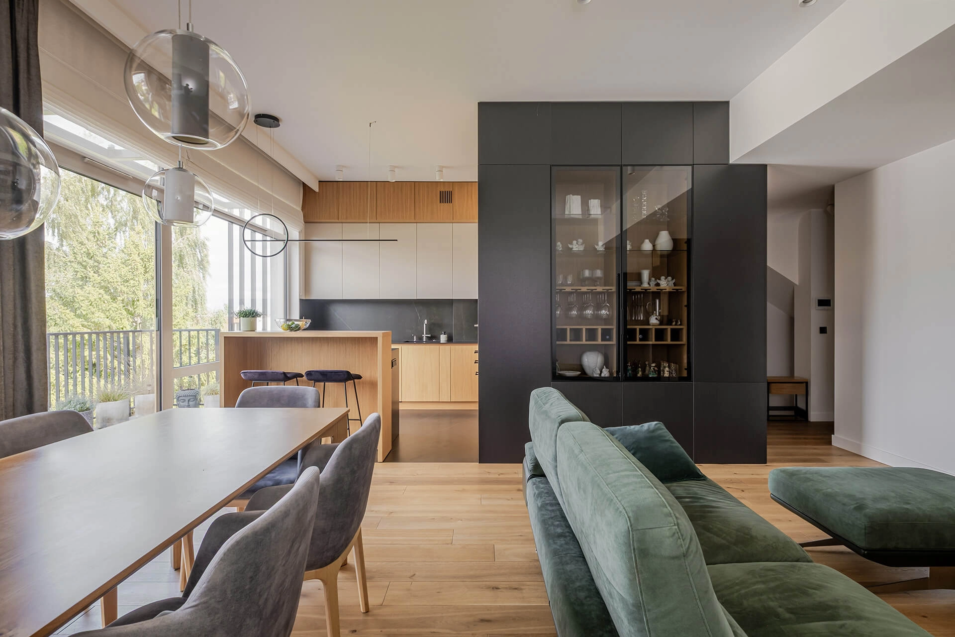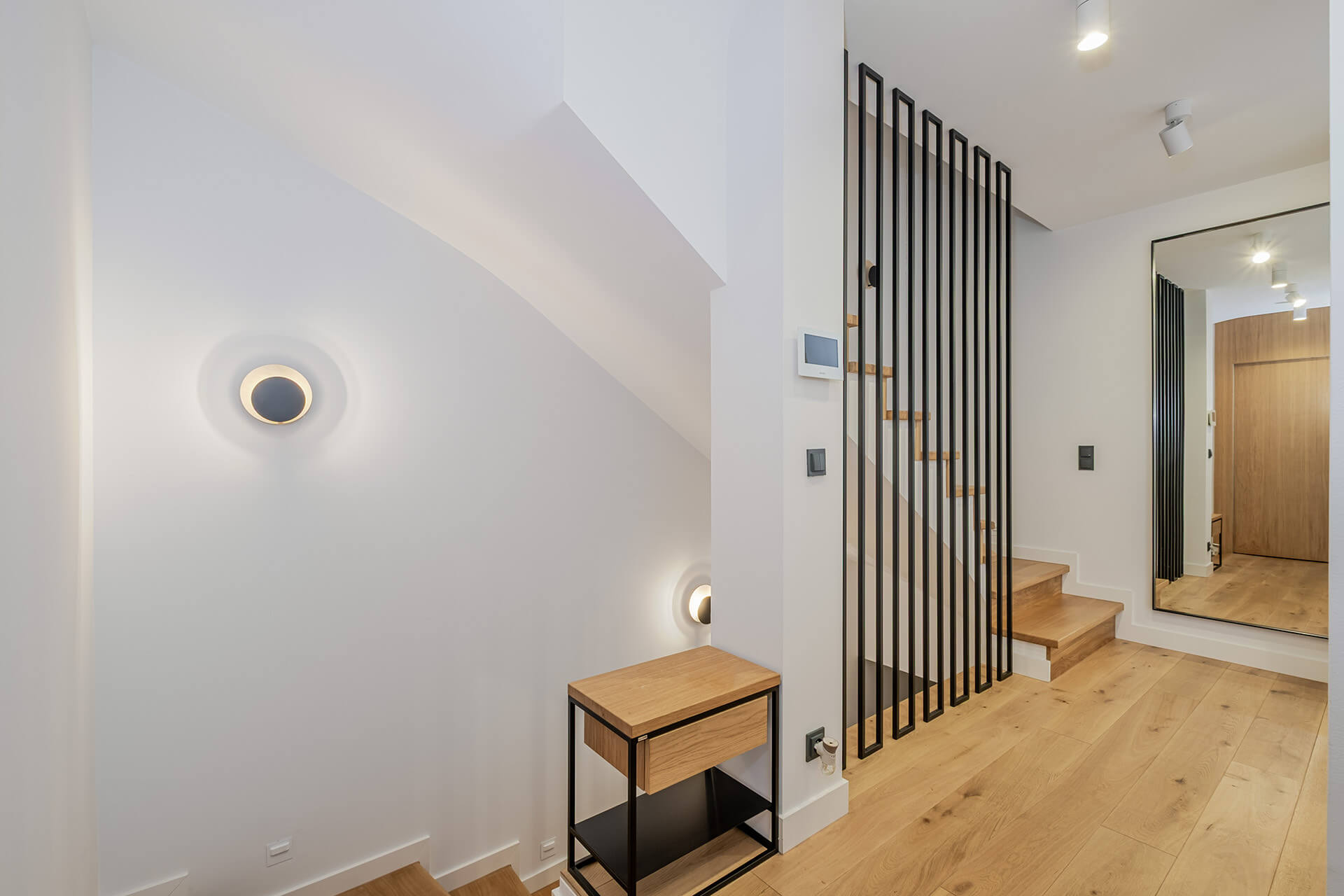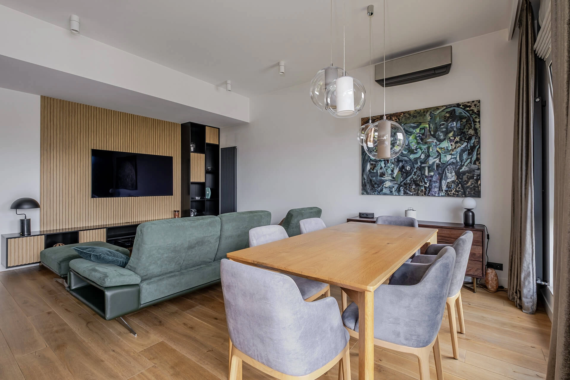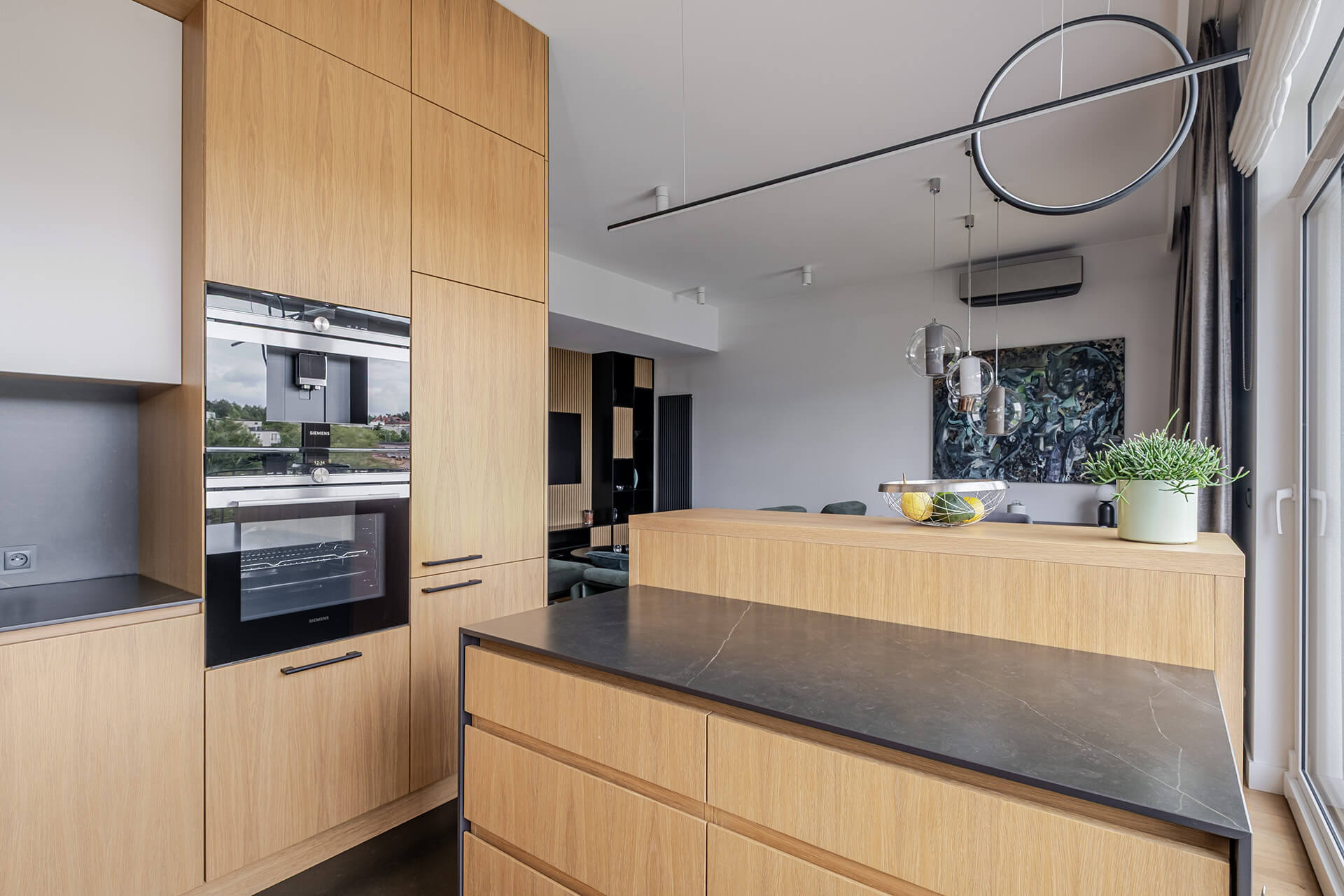 Cały apartament wykończony w najwyższym standardzie, a jego rozkład i funkcjonalność zapewnia wysoki standard i komfort życia codziennego. Wszystkie elementy drewniane są wykonane z dębu a kuchnia jest ze spieku kwarcowego.