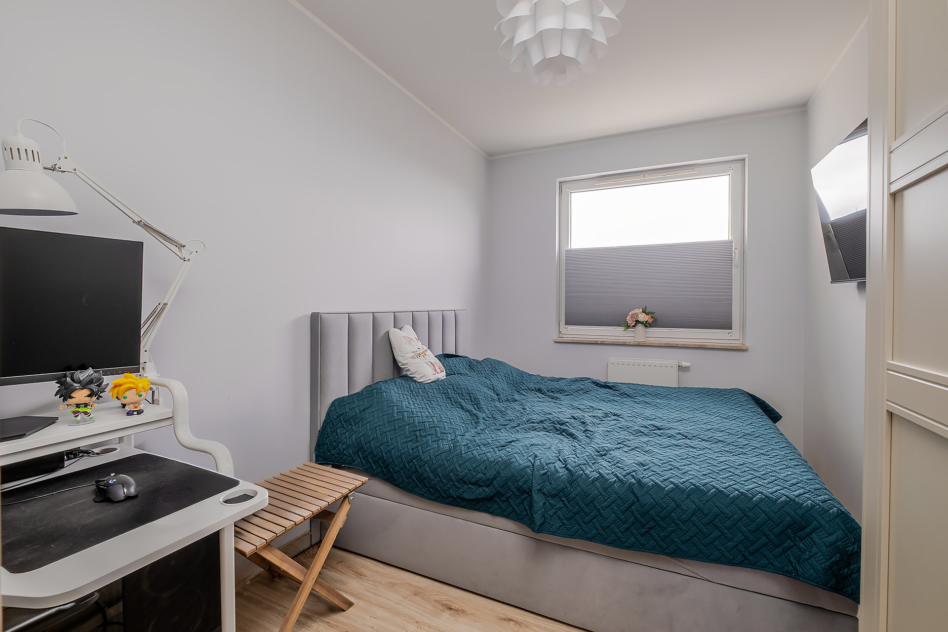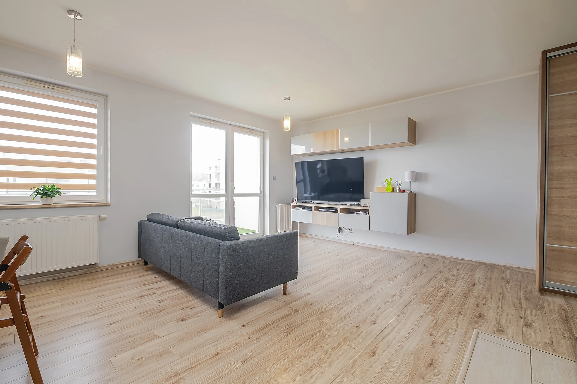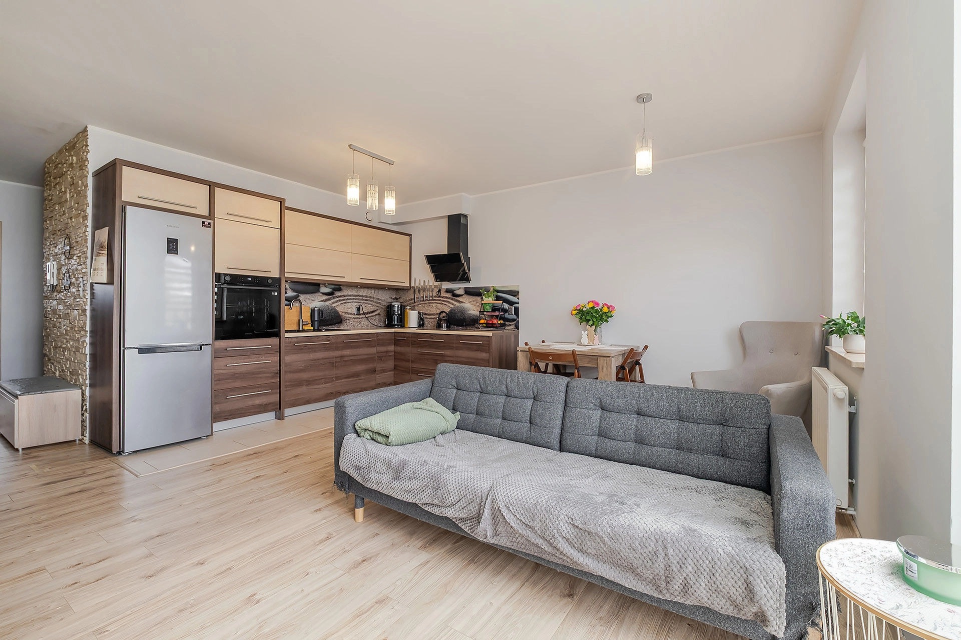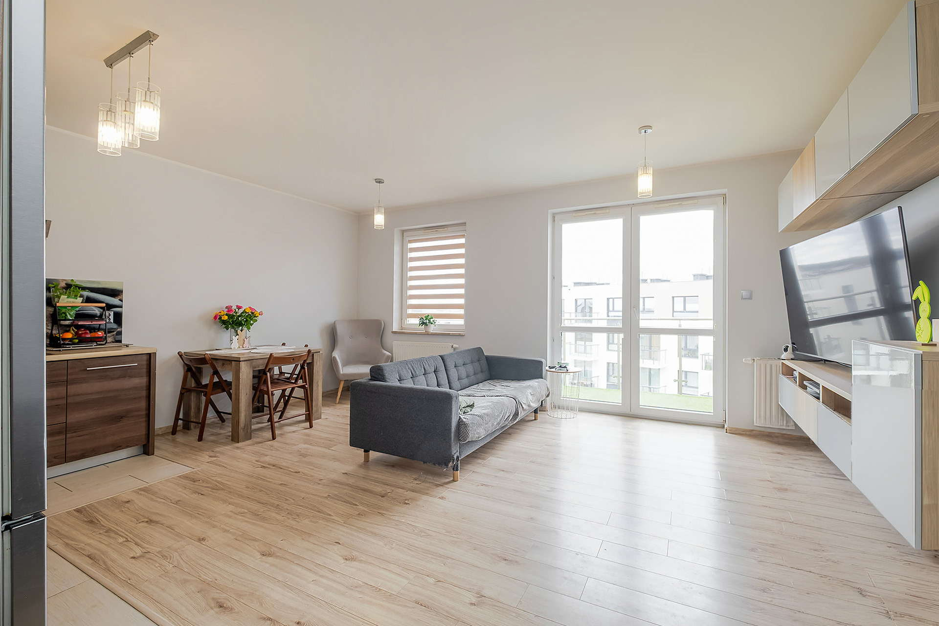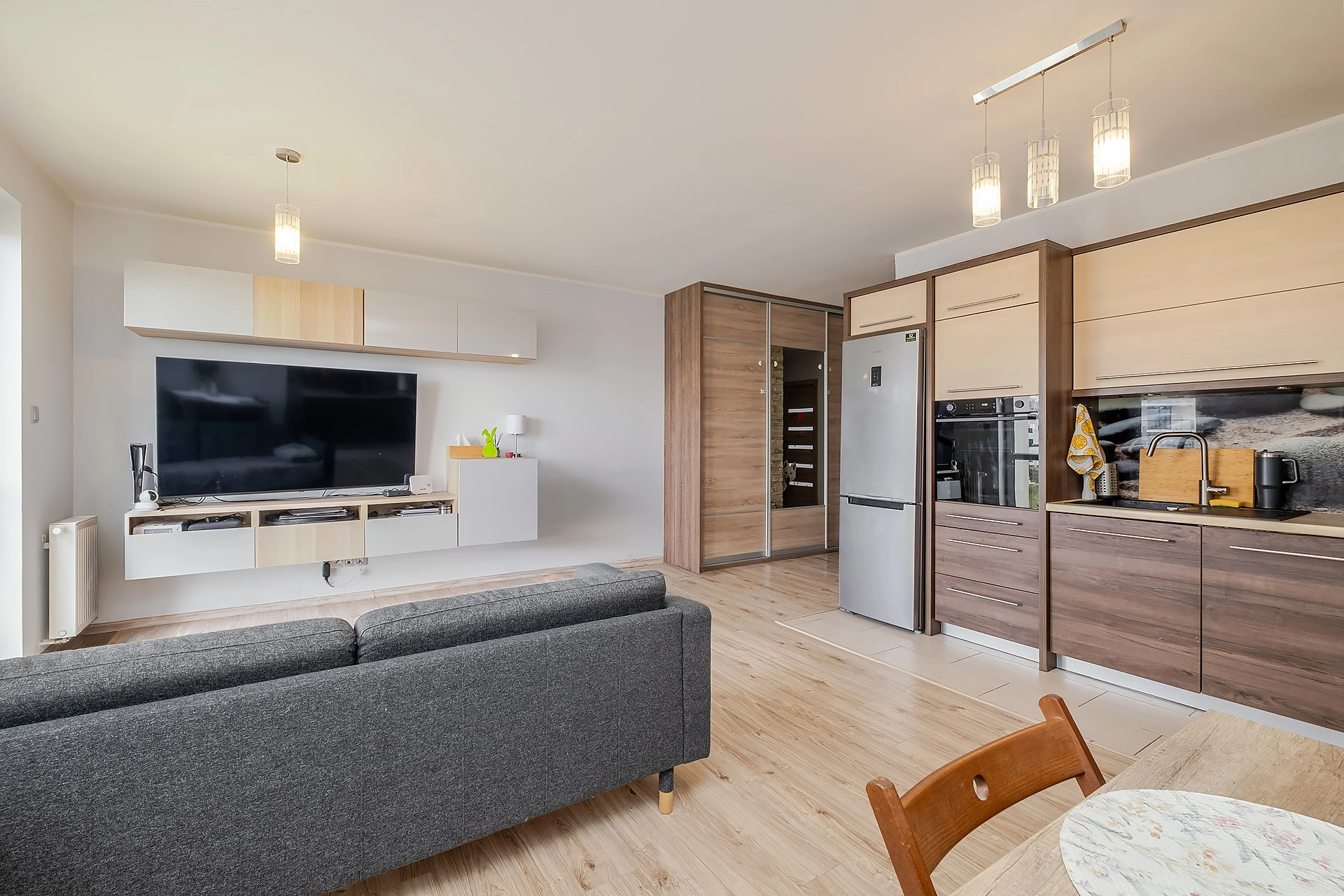 – Dużego salonu z aneksem kuchennym oraz wyjściem na balkon