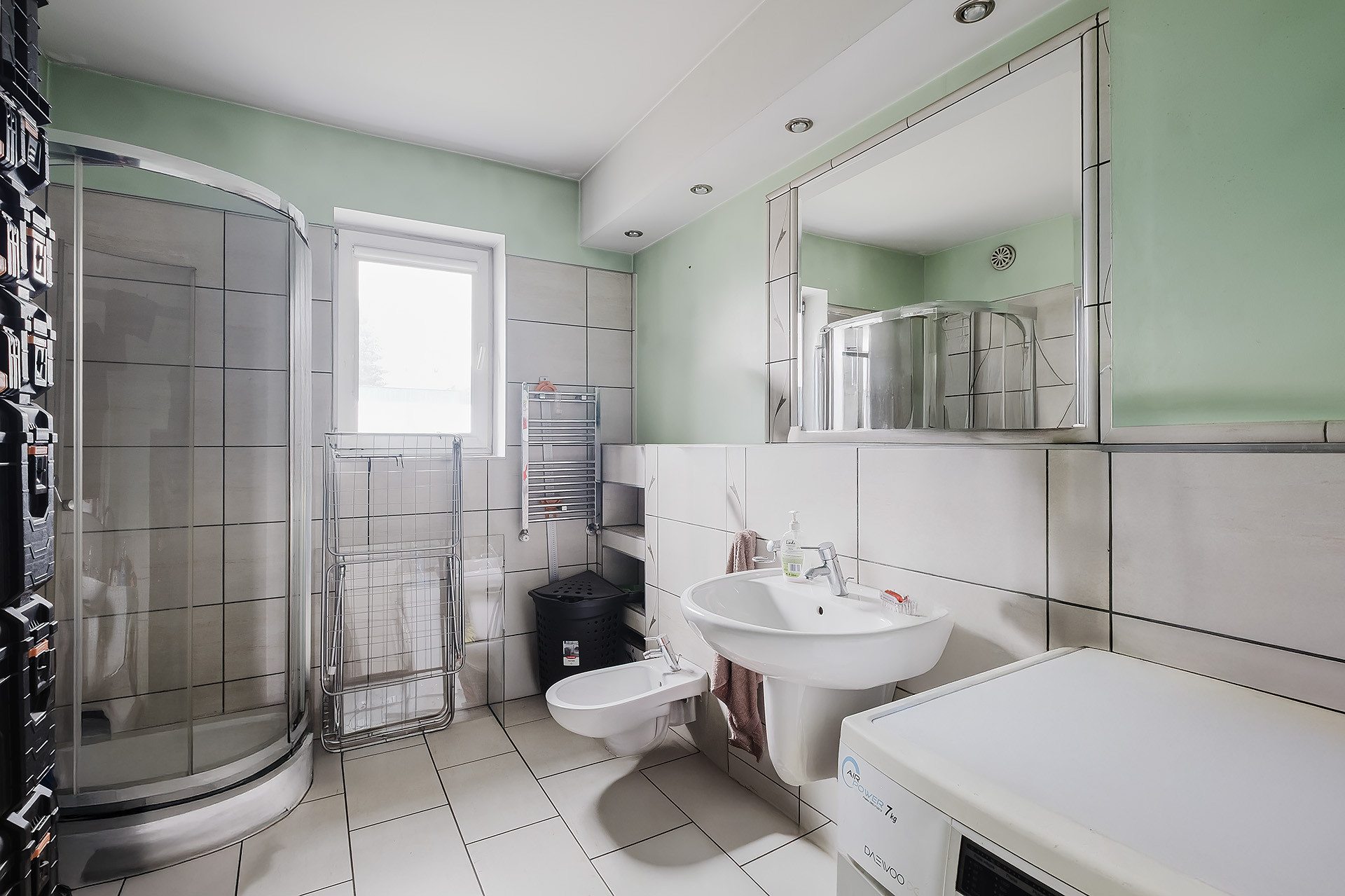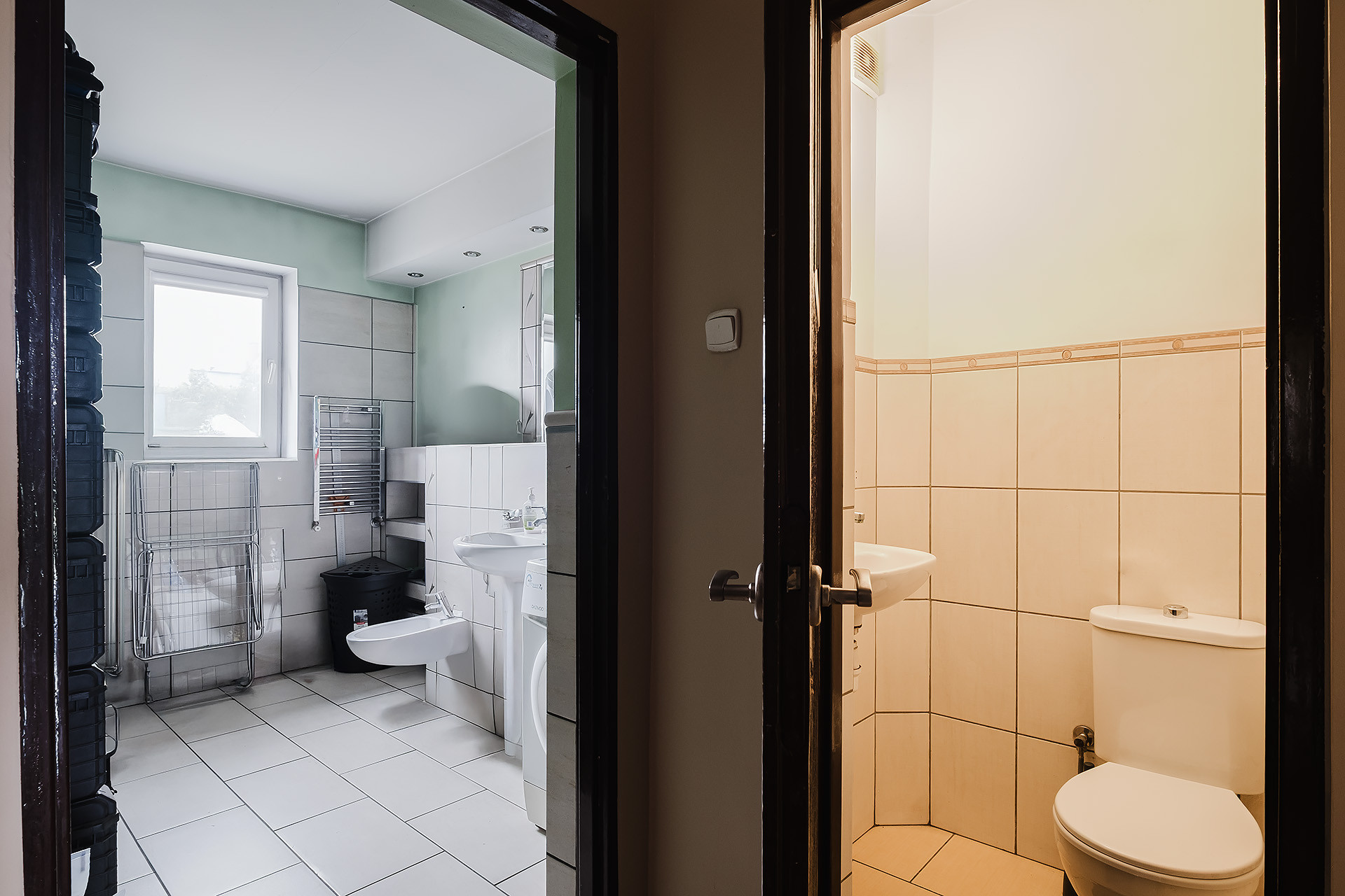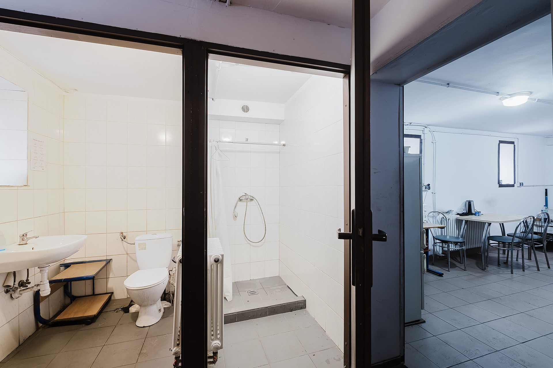 – łazienka (7,38 m2) z prysznicem, bidetem, pralką, umywalką, lustrem, grzejnikiem drabinkowym i oknem (dla pracowników),