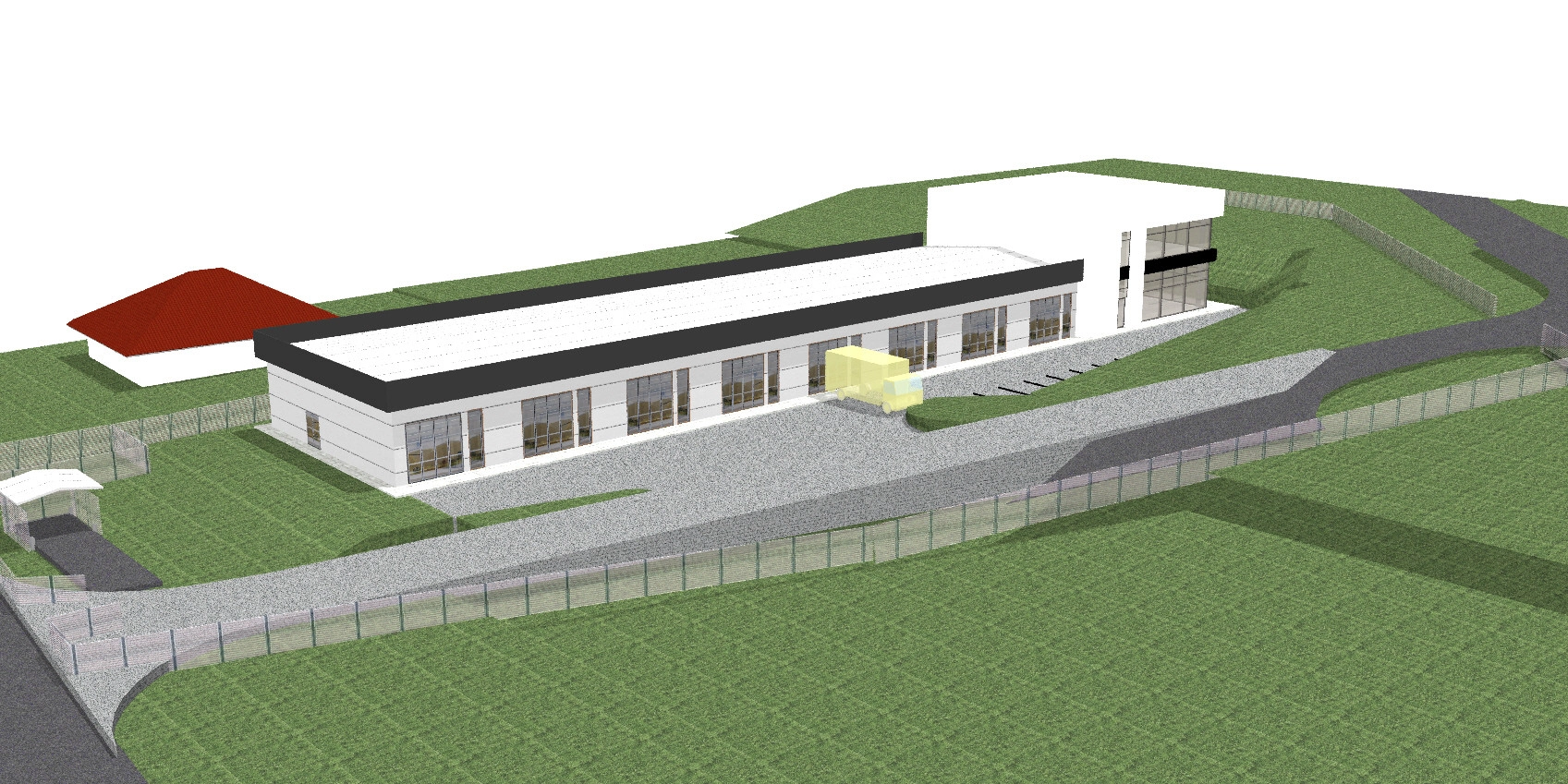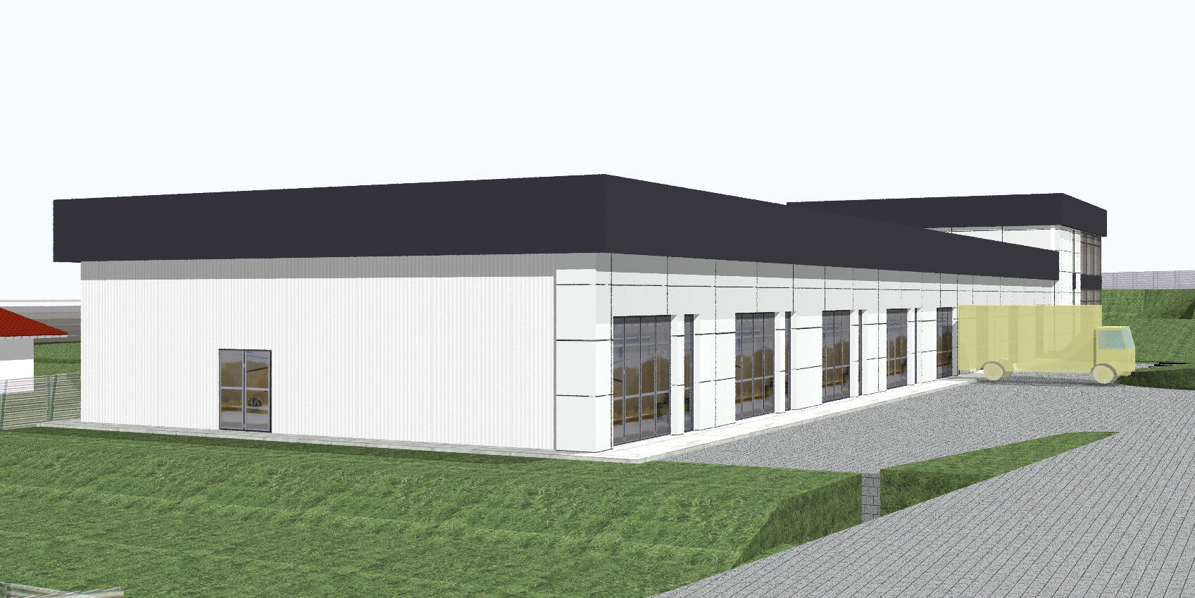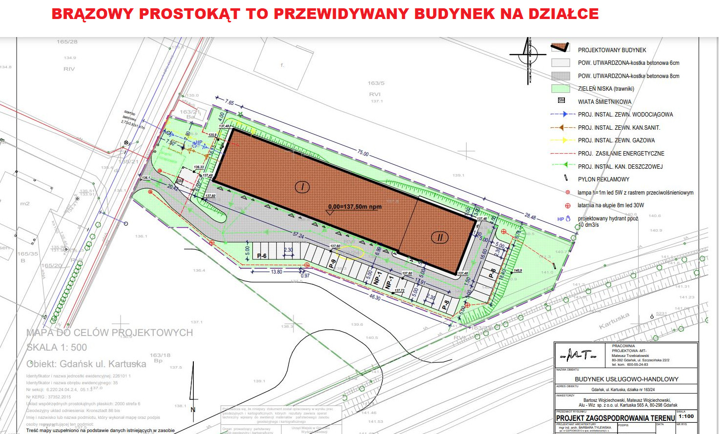 Działka posiada pozwolenie na budowę oraz dziennik budowy (wydano warunki zabudowy). Projekt zakłada budynek HANDLOWO-USŁUGOWY o łącznej powierzchni ok. 1192 m2, z czego pow. magazynowa to ok. 912 m2, oraz cześć biurowa ok. 280 m2. Na zdjęciach jest wizualizacja budynku. Plan przewiduje utwardzenie terenu kostką betonową pod wjazd i parkingi, oraz zieleń niską w postaci trawników.