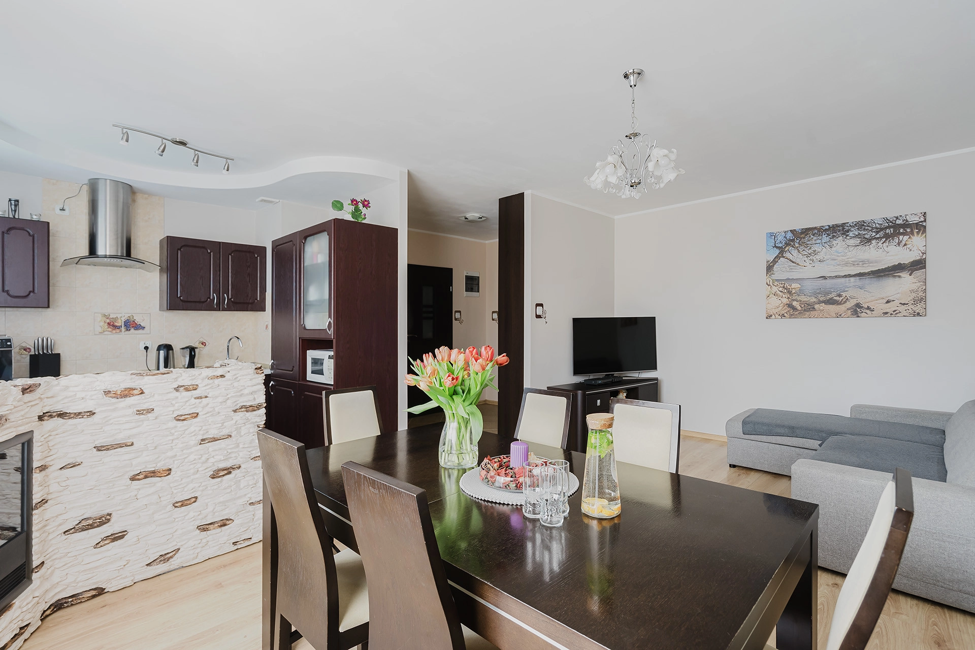 słoneczny salon z aneksem kuchennym, idealny do wspólnego spędzania czasu, z wyjściem na balkon o powierzchni 5,5 m² – doskonałe miejsce na poranną kawę,