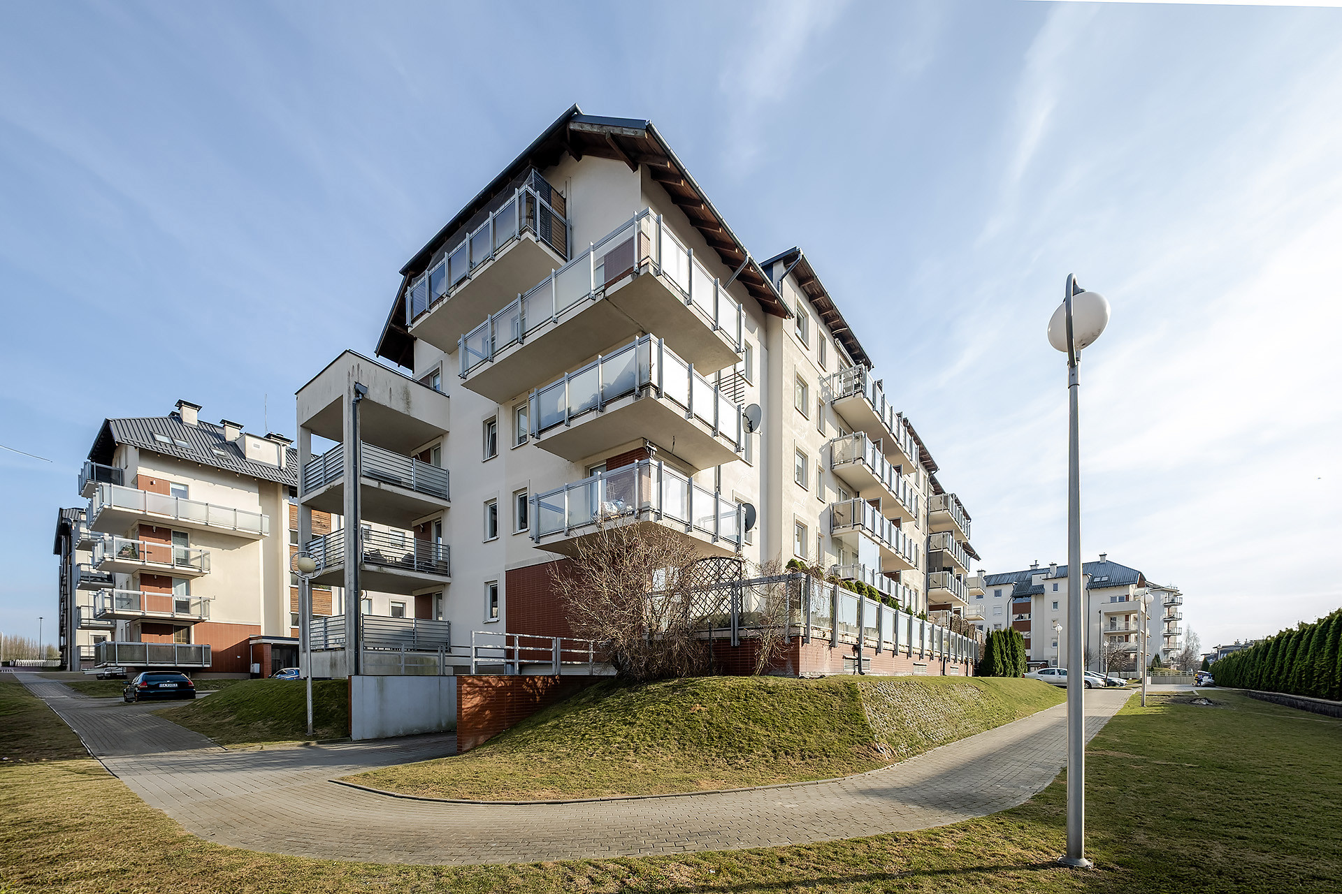 Budynek wybudowany w 2008 roku z pustaka, dach pokryty dachówką ceramiczną. Wejście do budynku zabezpieczone domofonem, szeroka klatka schodowa, dostosowana do potrzeb osób niepełnosprawnych. Na osiedlu plac zabaw, wjazd na parking zabezpieczony szlabanem.