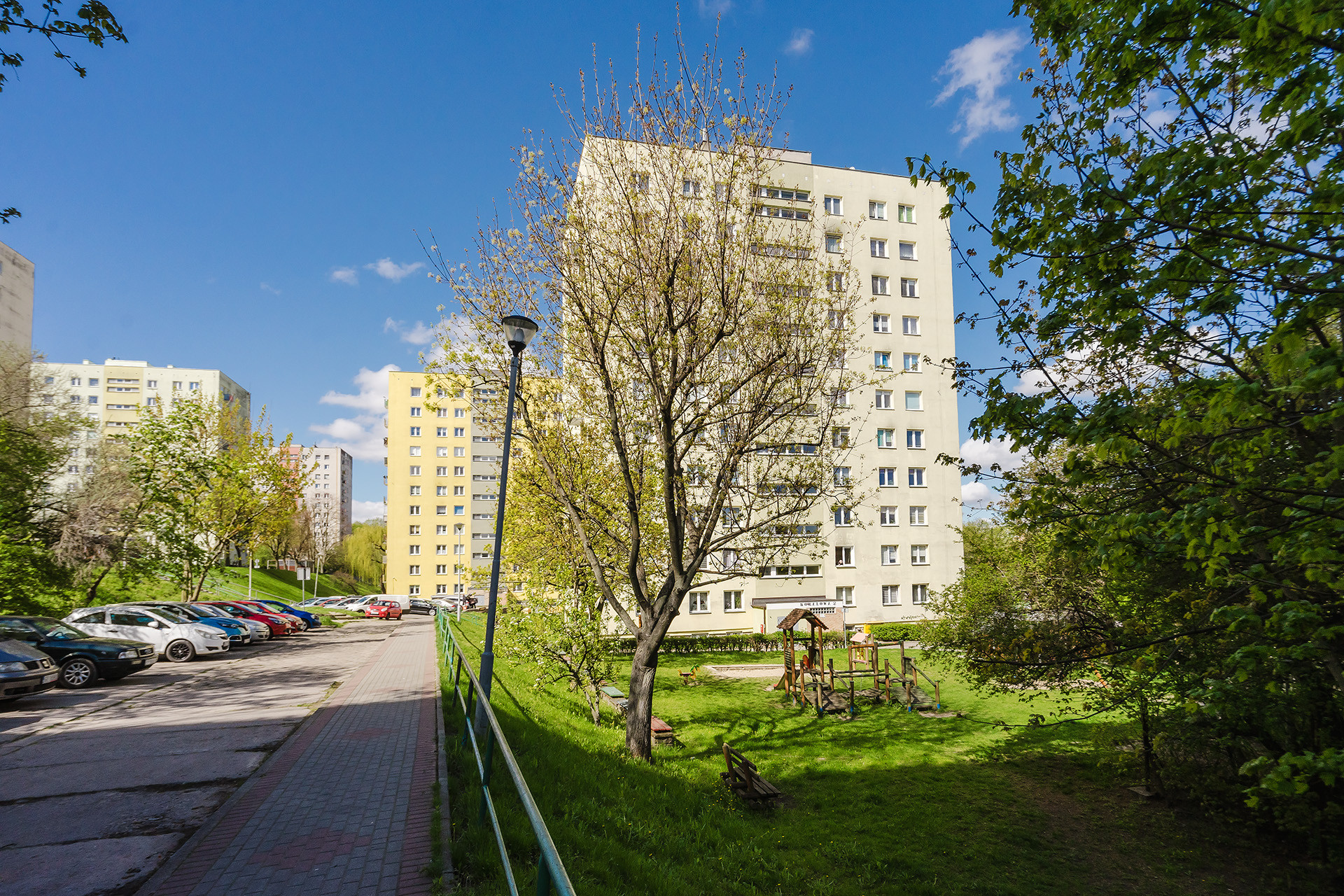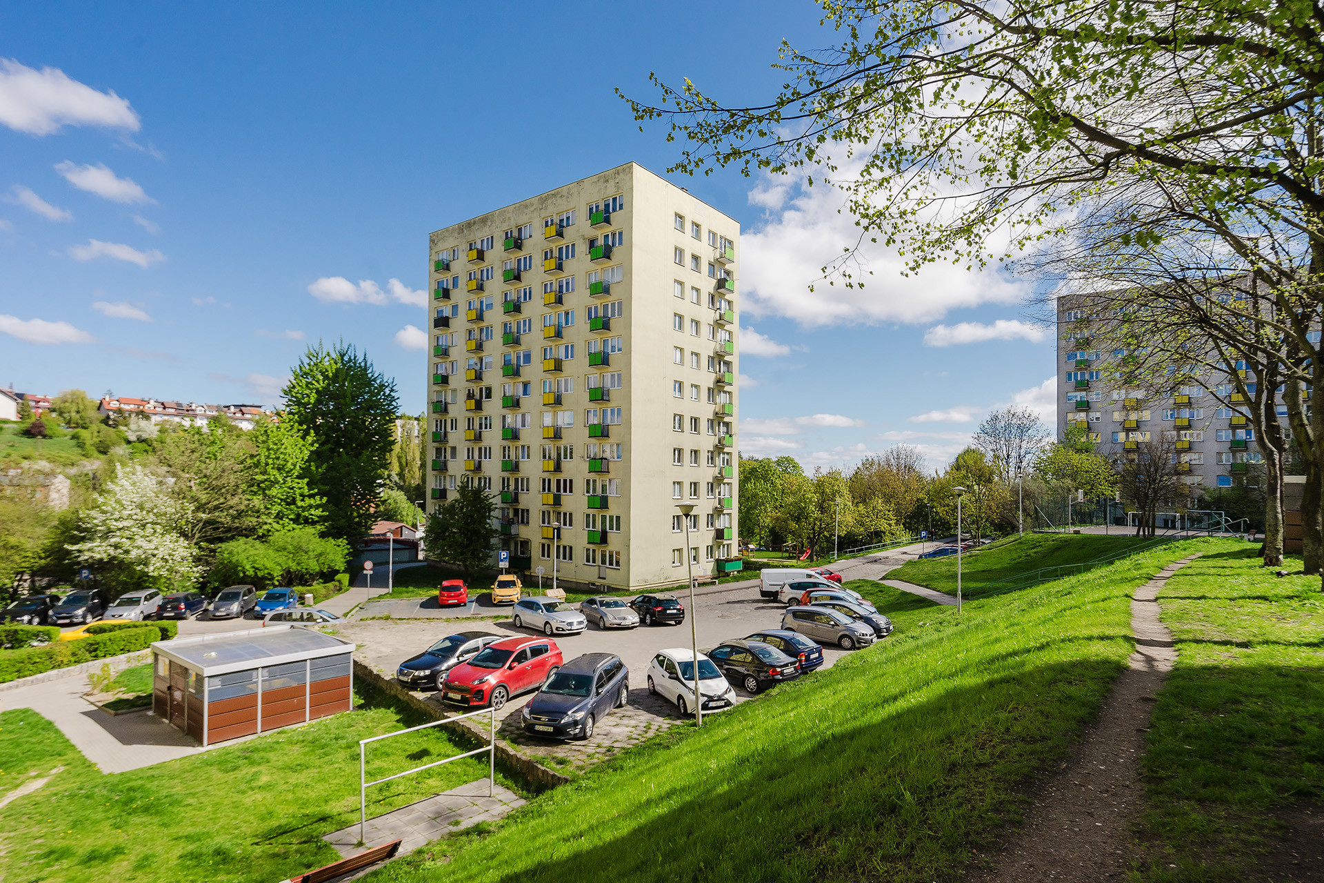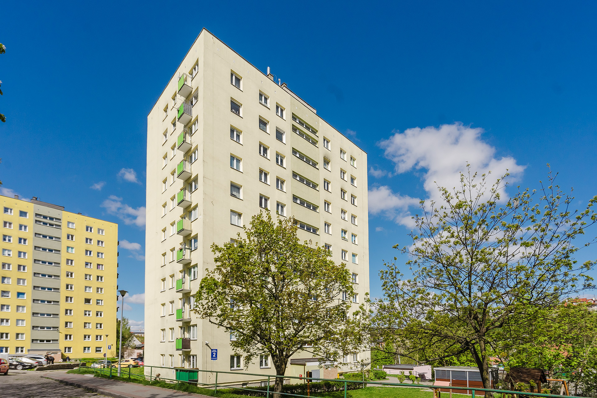 Mieszkanie mieści się w 10-piętrowym budynku wybudowanym w latach 70 z wielkiej płyty. Stan budynku jest dobry, a wejście do klatki schodowej zabezpieczone jest domofonem. Wewnątrz budynku winda, którą wymieniono w 2022 roku. Wokół liczne miejsca parkingowe dostępne tylko dla mieszkańców.