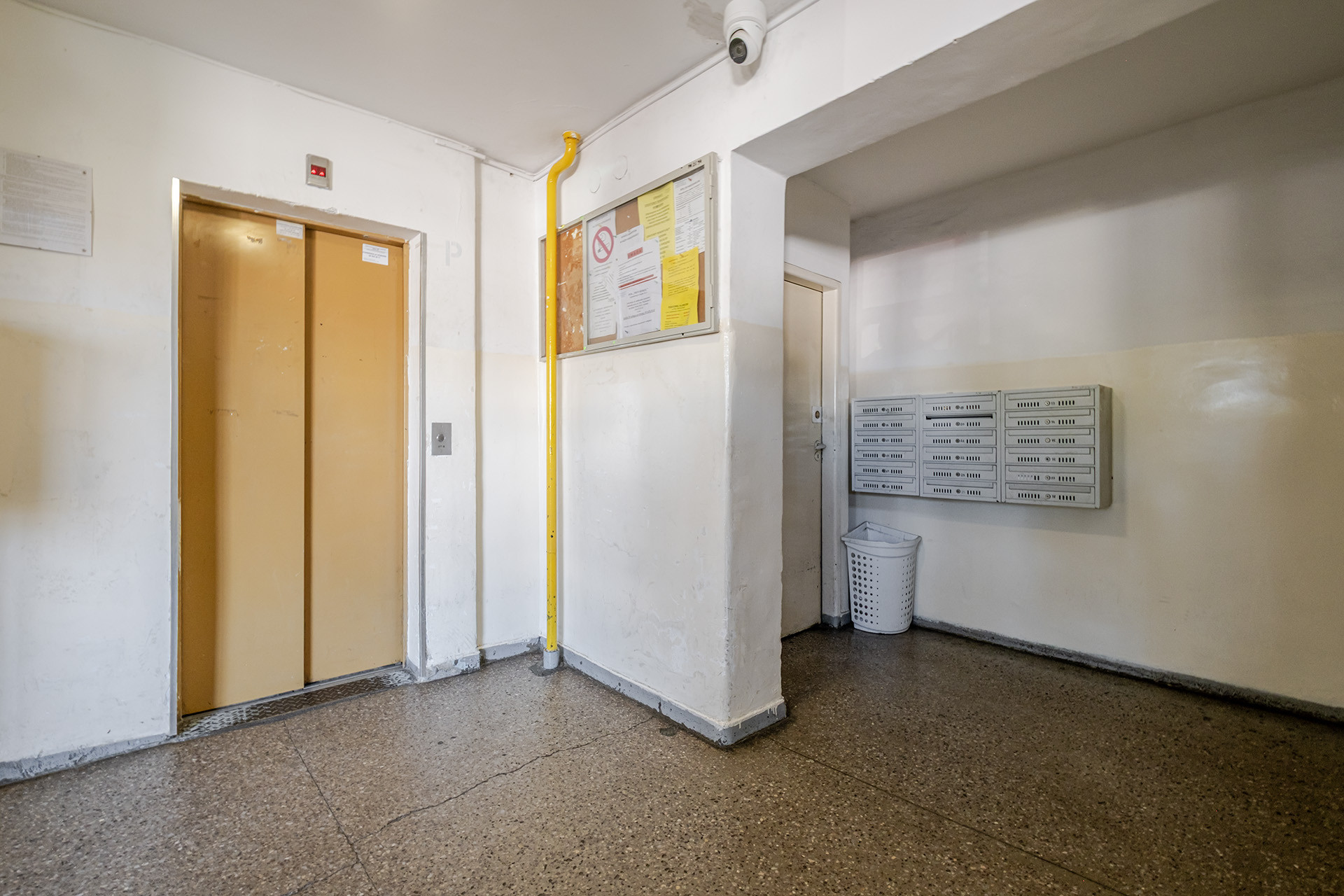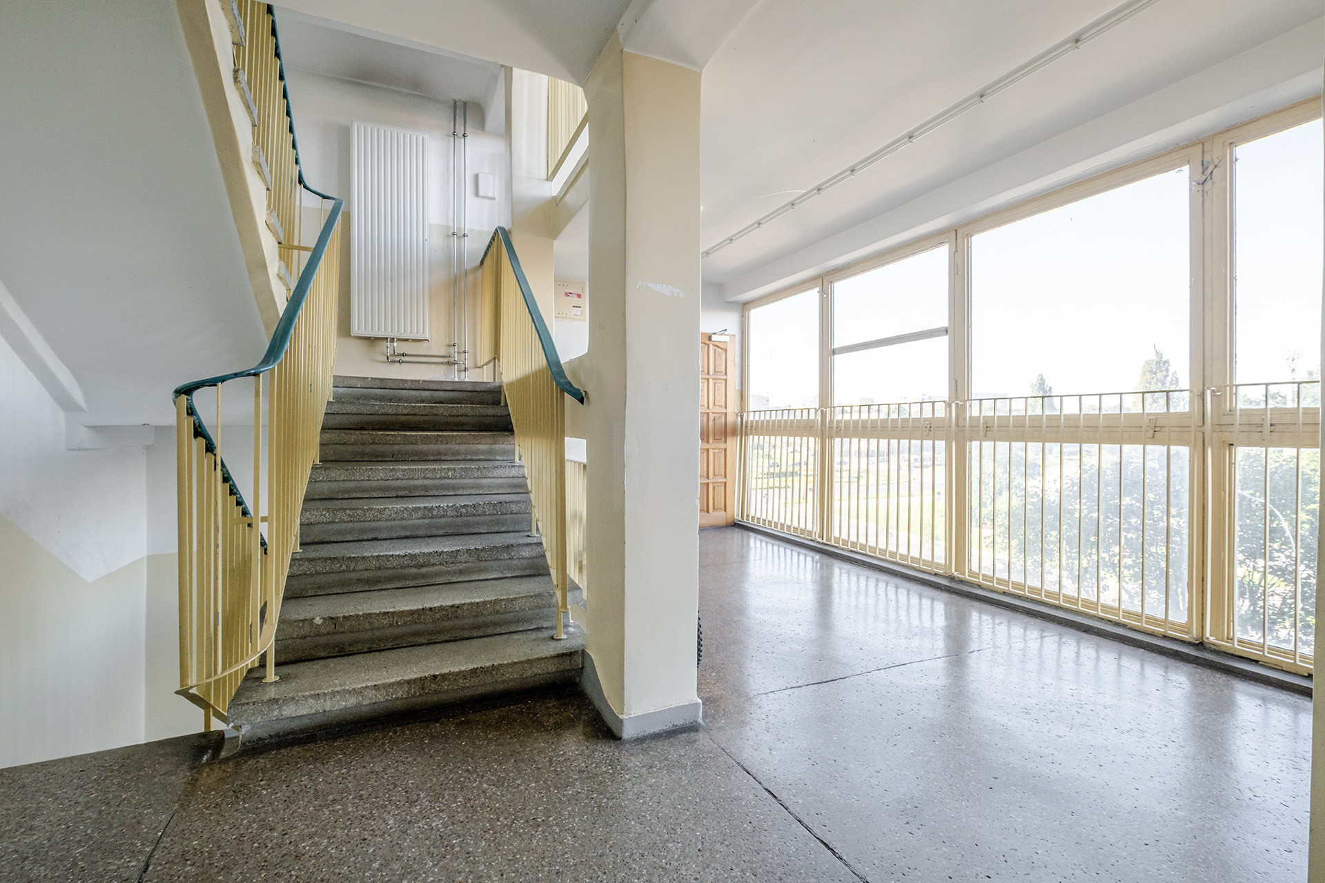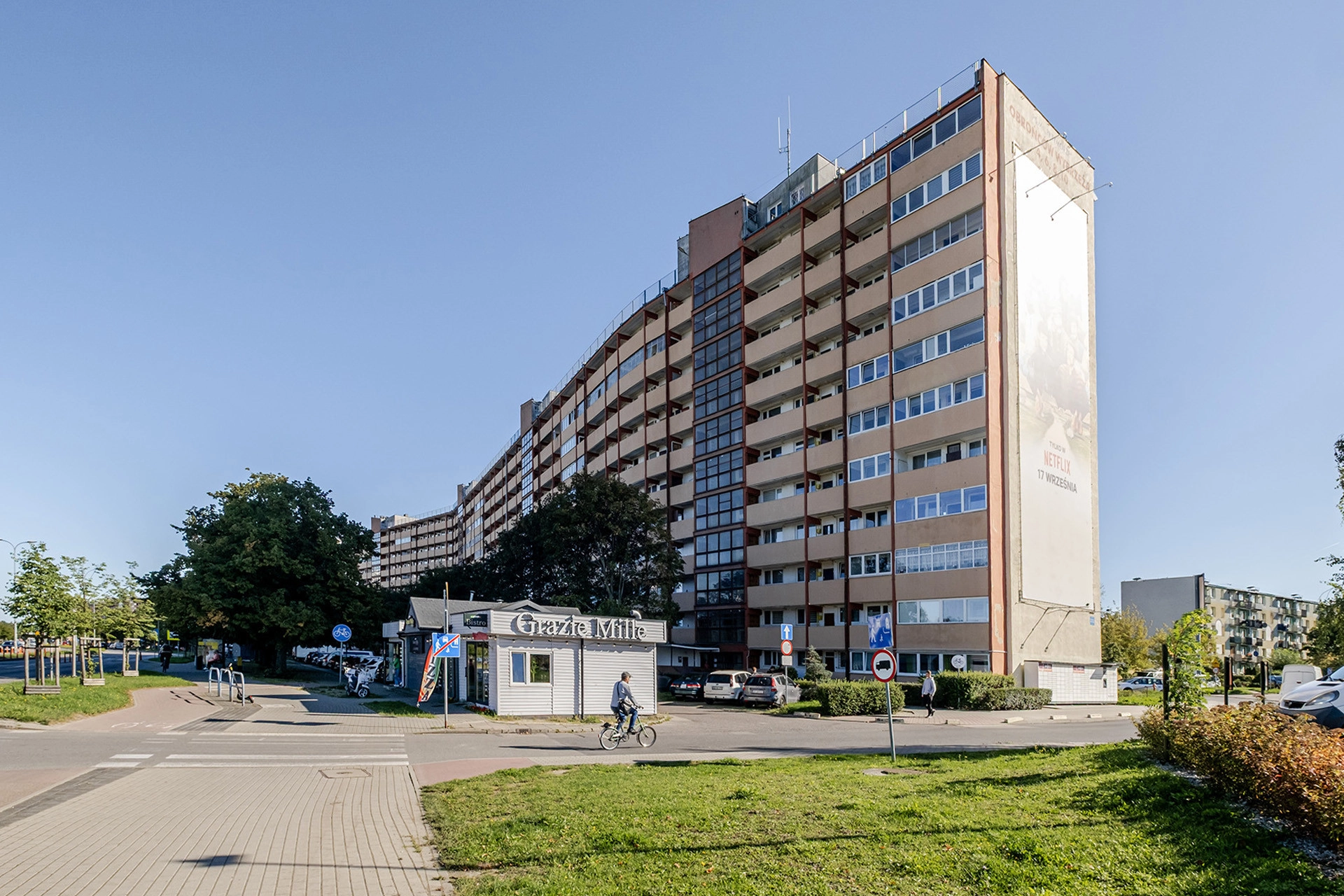 Mieszkanie mieści się na ostatnim piętrze w 11-piętrowym FALOWIECU wzniesiony w latach siedemdziesiątych, który wykonano z wielkiej płyty. Ogólny stan całej nieruchomości należy uznać za dobry. Wejście do klatki schodowej zabezpieczone jest domofonem. Klatka jest czysta, szeroka i zadbana. Nieruchomość posiada windę, a przed budynkiem znajdziemy mnóstwo ogólnodostępnych miejsc parkingowych.