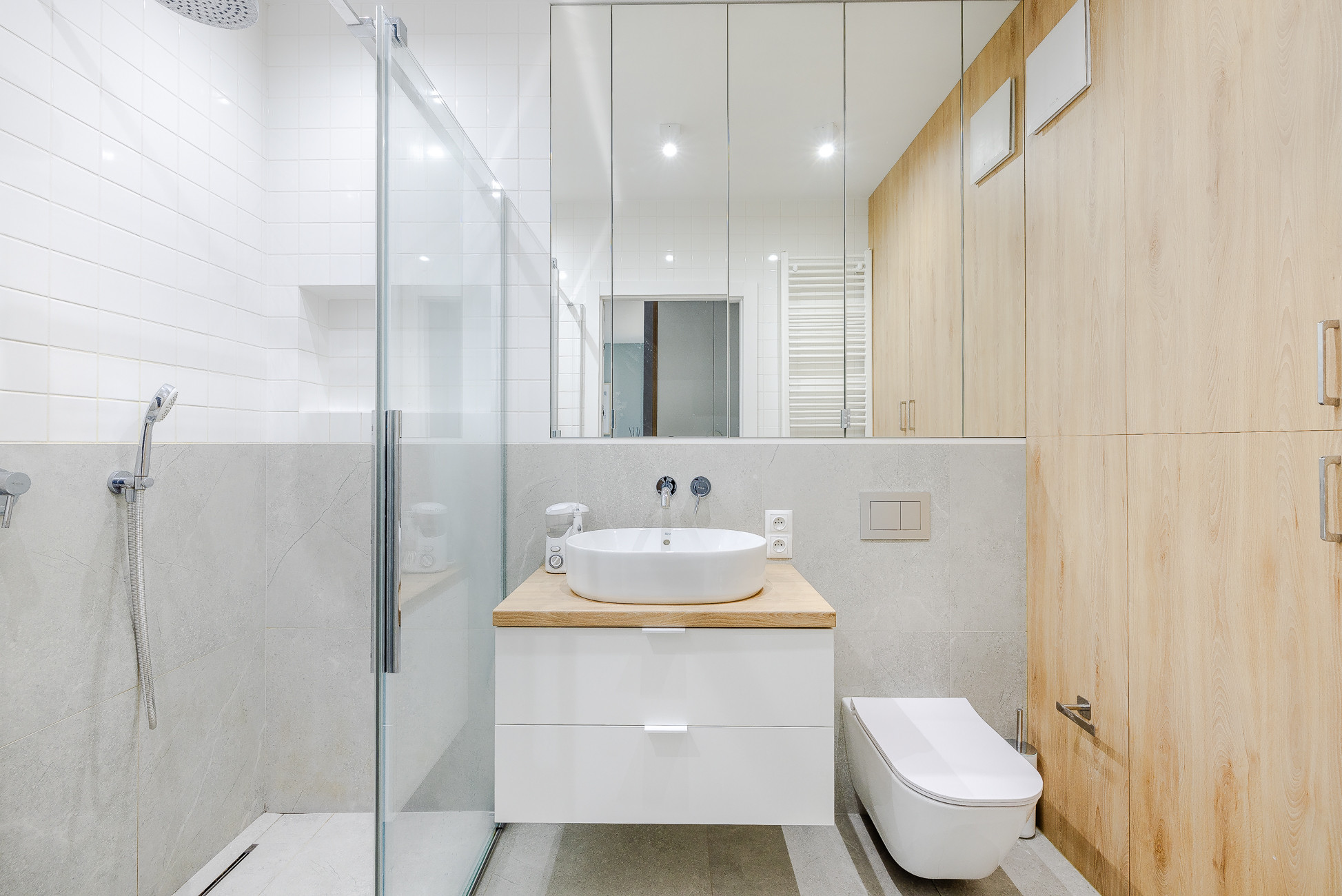 – łazienka (4,97 m2) z WC, prysznicem bezprogowym, umywalką, lustrem, grzejnikiem drabinkowym,