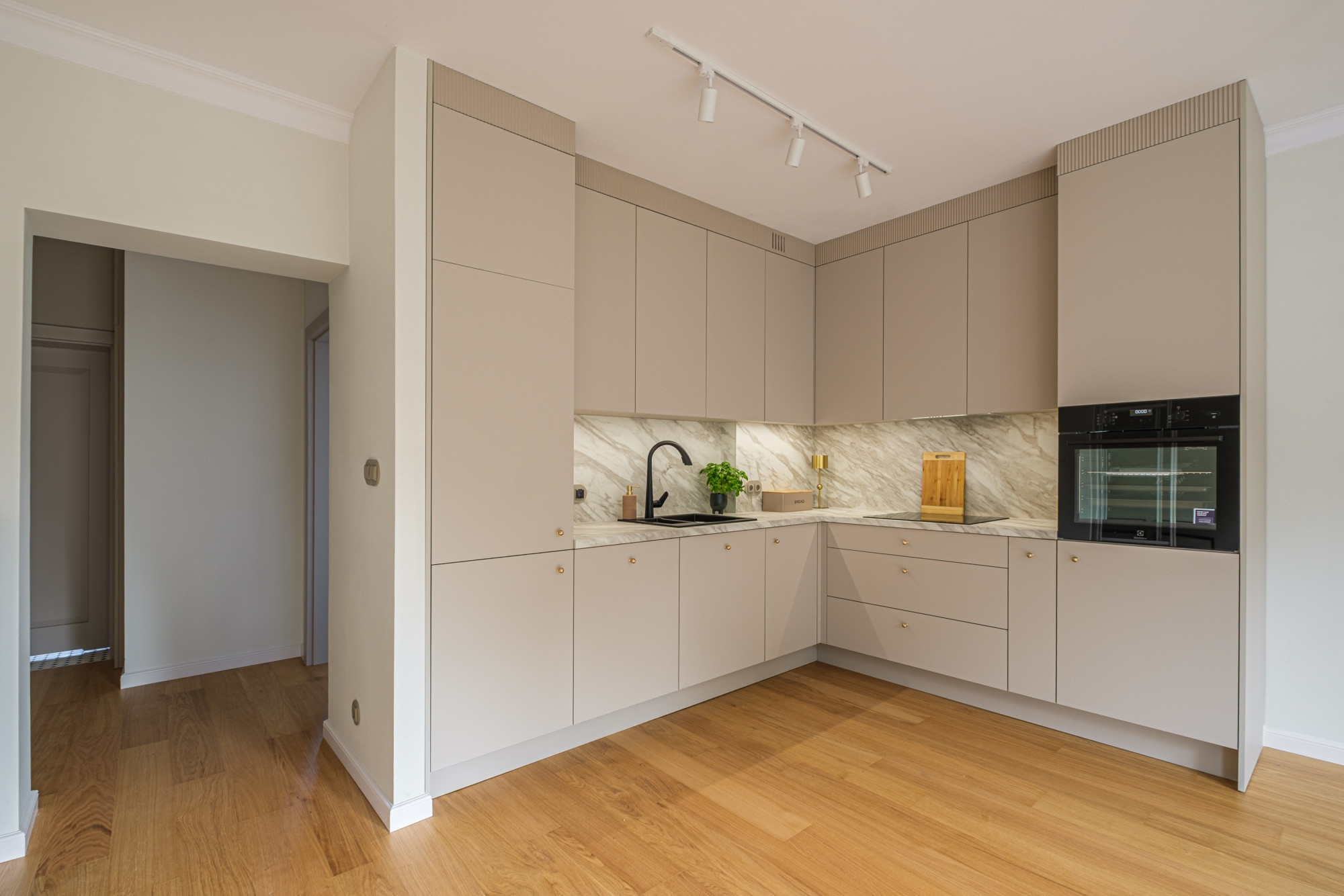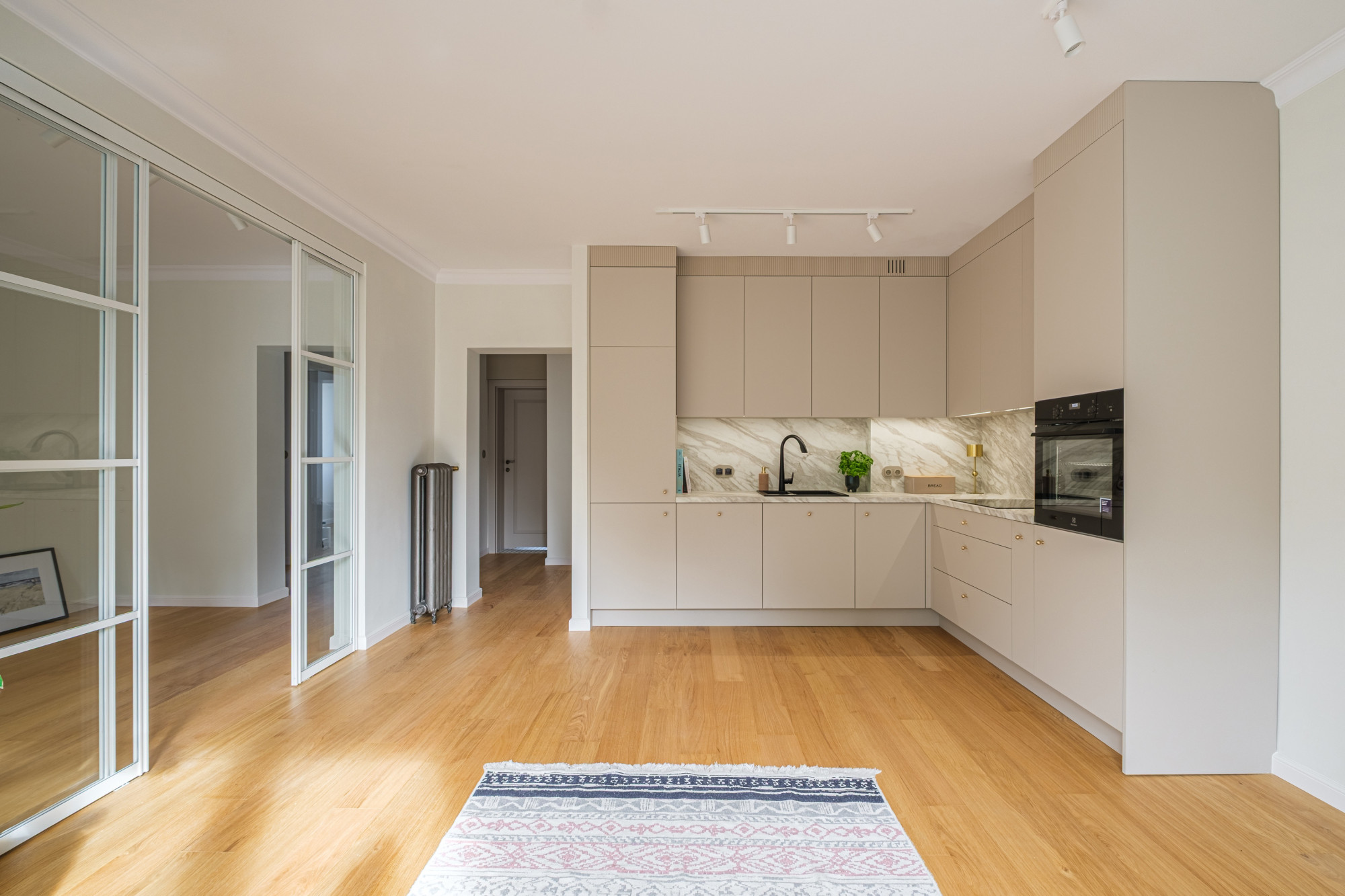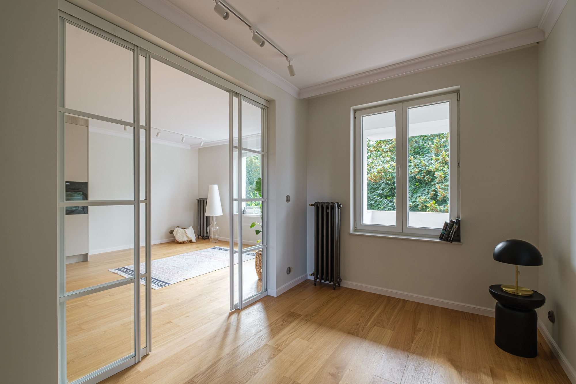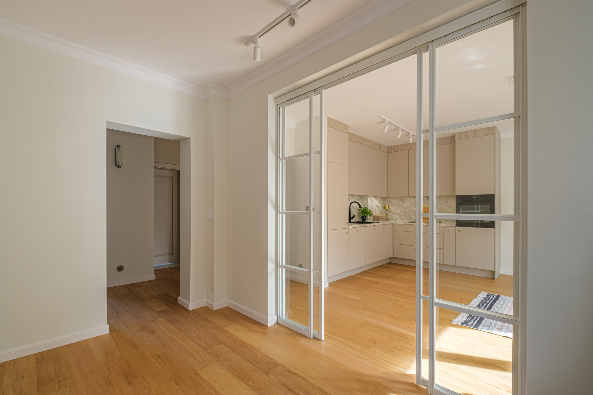 Mieszkanie przeszło gruntowny remont, zostało wykończone w wysokim standardzie z dbałością o każdy detal. Wykonane zostały nowe zabudowy stolarskie na wymiar, kuchnia oraz łazienka w nowoczesnym stylu. Wymienione drzwi (zewnętrzne i wewnętrzne marki Barański), podłogi z paneli fornirowanych drewnem, profesjonalnie odnowione żeliwne grzejniki.