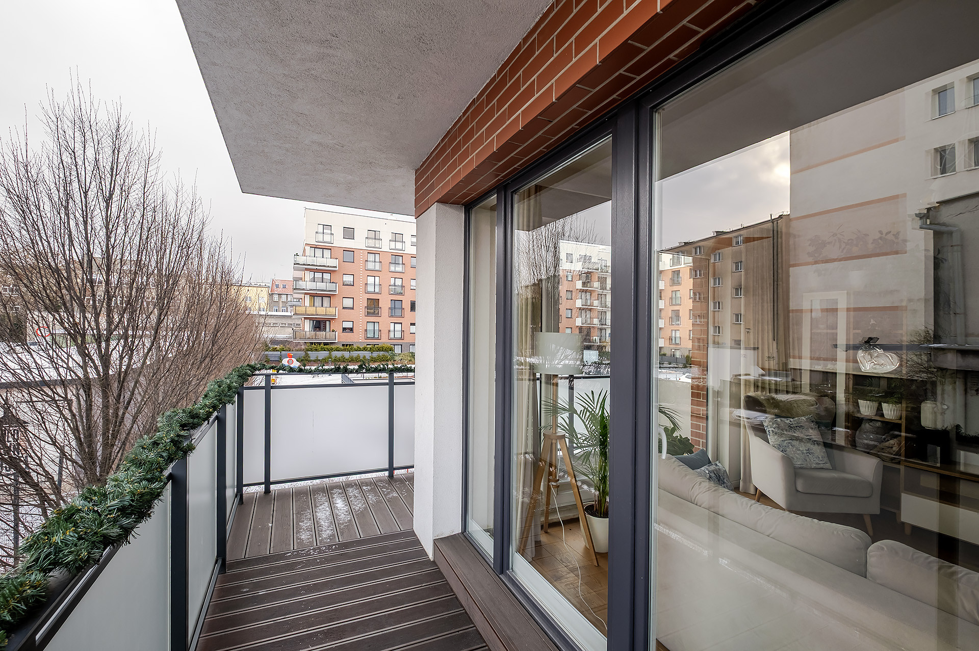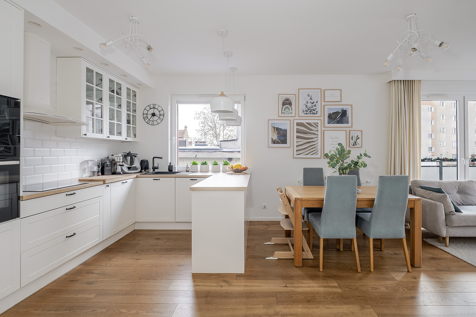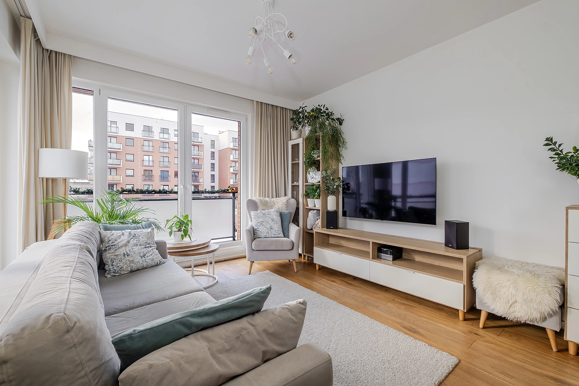 Mieszkanie zostało wykończone w jasnych, ciepłych barwach, z dębową deską na podłodze, która nadaje wnętrzu elegancji i naturalnego charakteru. Zabudowa kuchenna oraz szafy zostały wykonane na wymiar przez stolarza, a kuchnia wyposażona jest w wysokiej klasy sprzęt AGD marki Bosch. Dodatkowym atutem jest system alarmowy z powiadomieniami SMS.