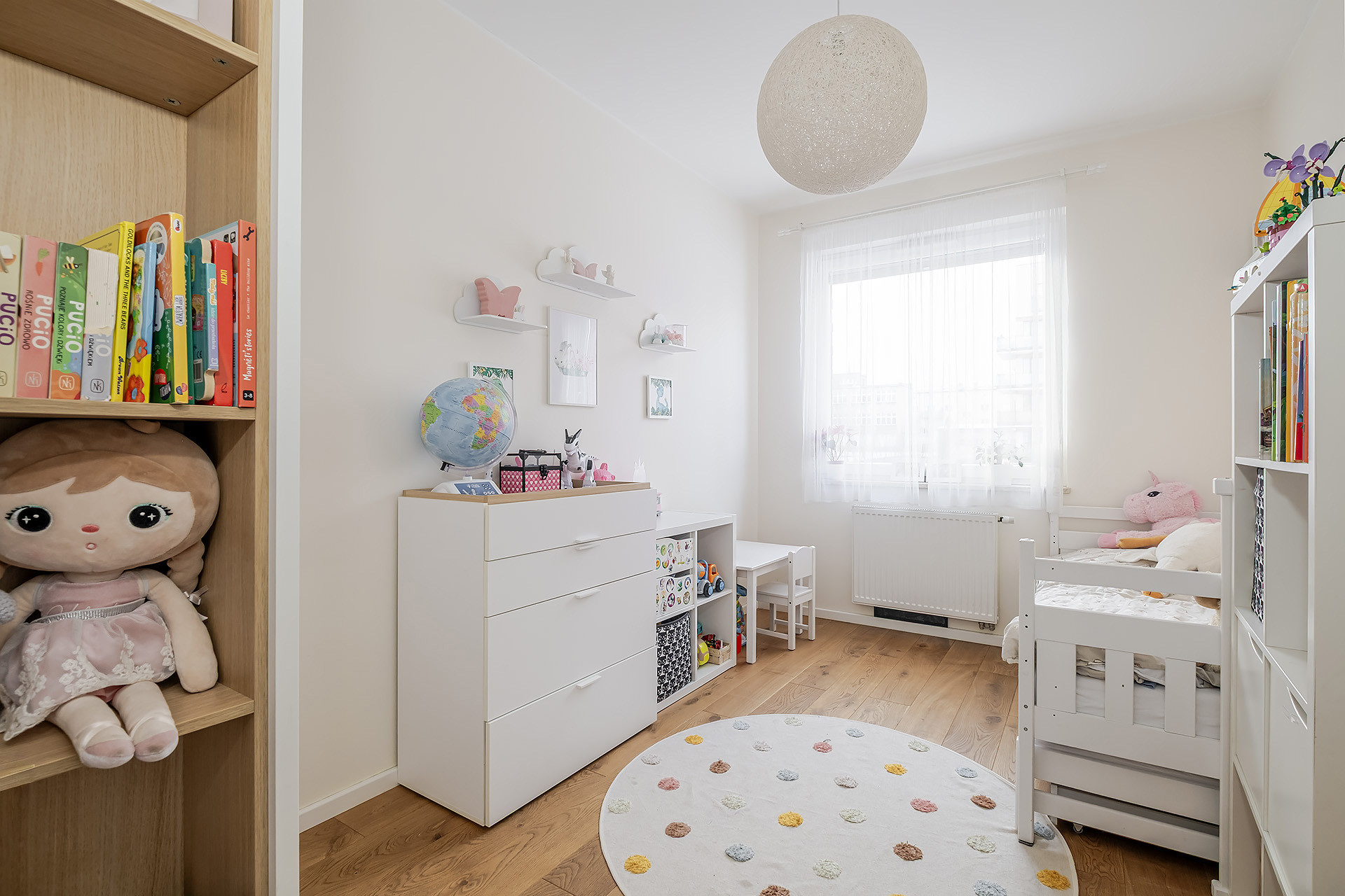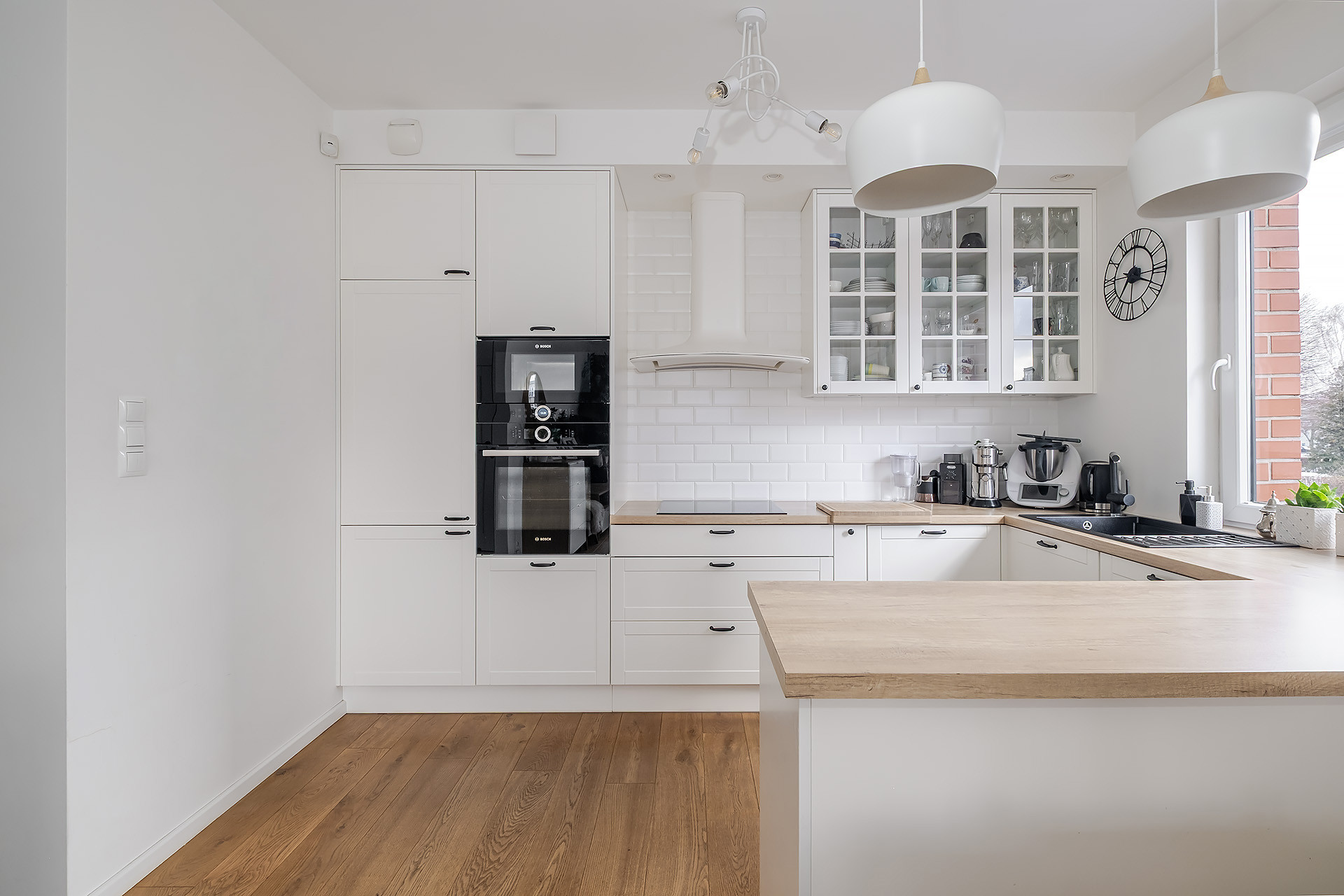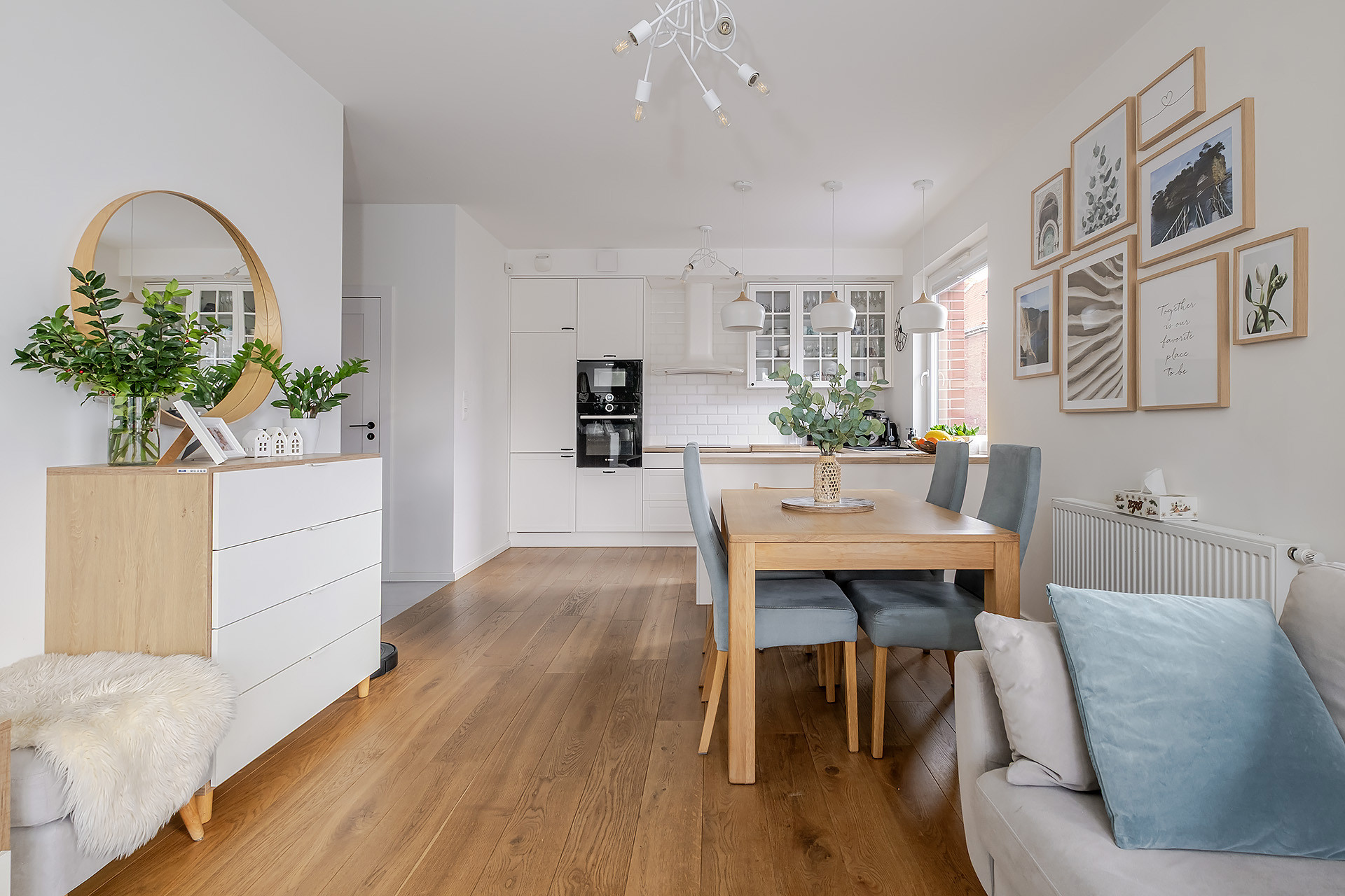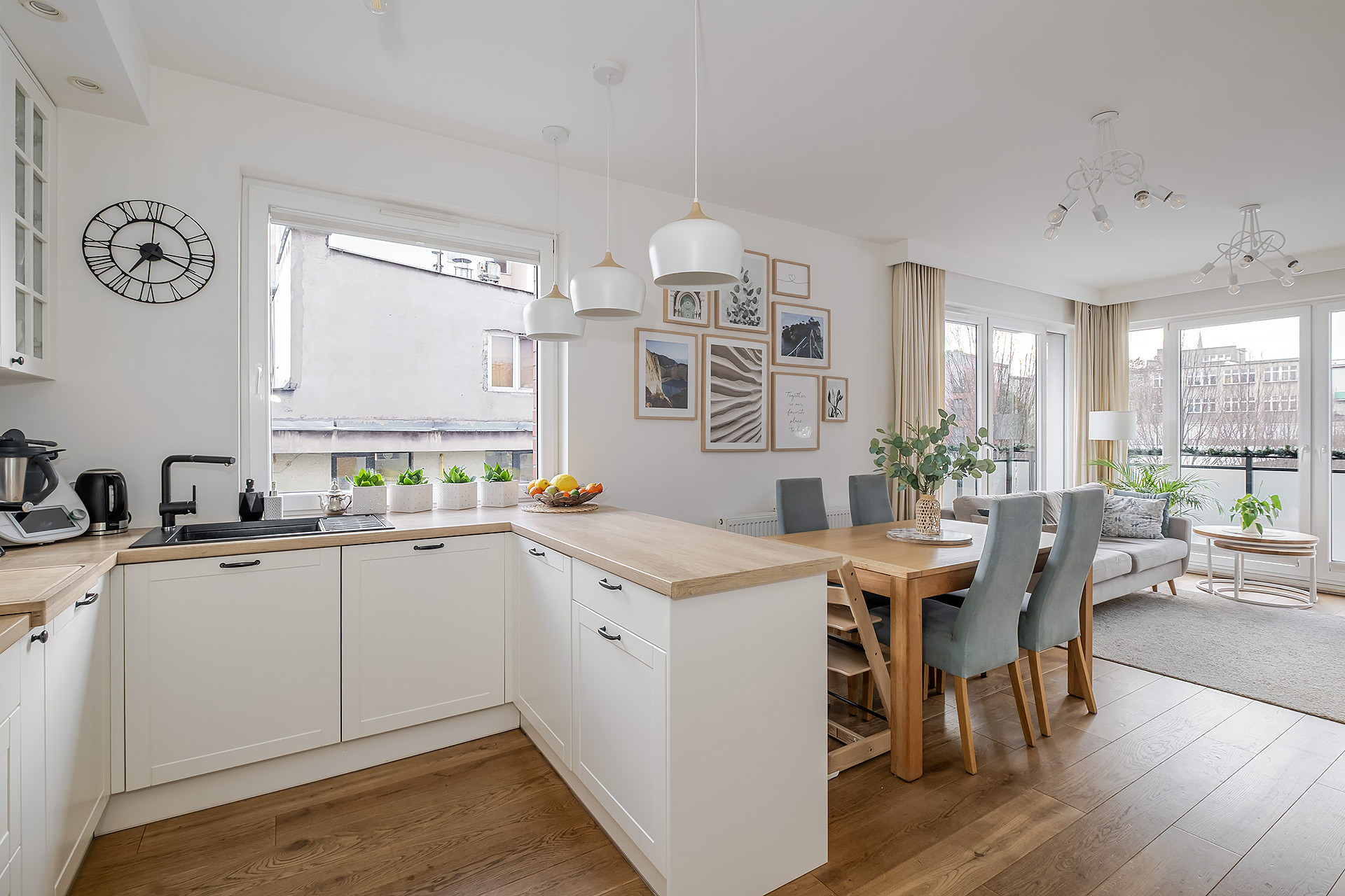 Mieszkanie zostało wykończone w jasnych, ciepłych barwach, z dębową deską na podłodze, która nadaje wnętrzu elegancji i naturalnego charakteru. Zabudowa kuchenna oraz szafy zostały wykonane na wymiar przez stolarza, a kuchnia wyposażona jest w wysokiej klasy sprzęt AGD marki Bosch. Dodatkowym atutem jest system alarmowy z powiadomieniami SMS.