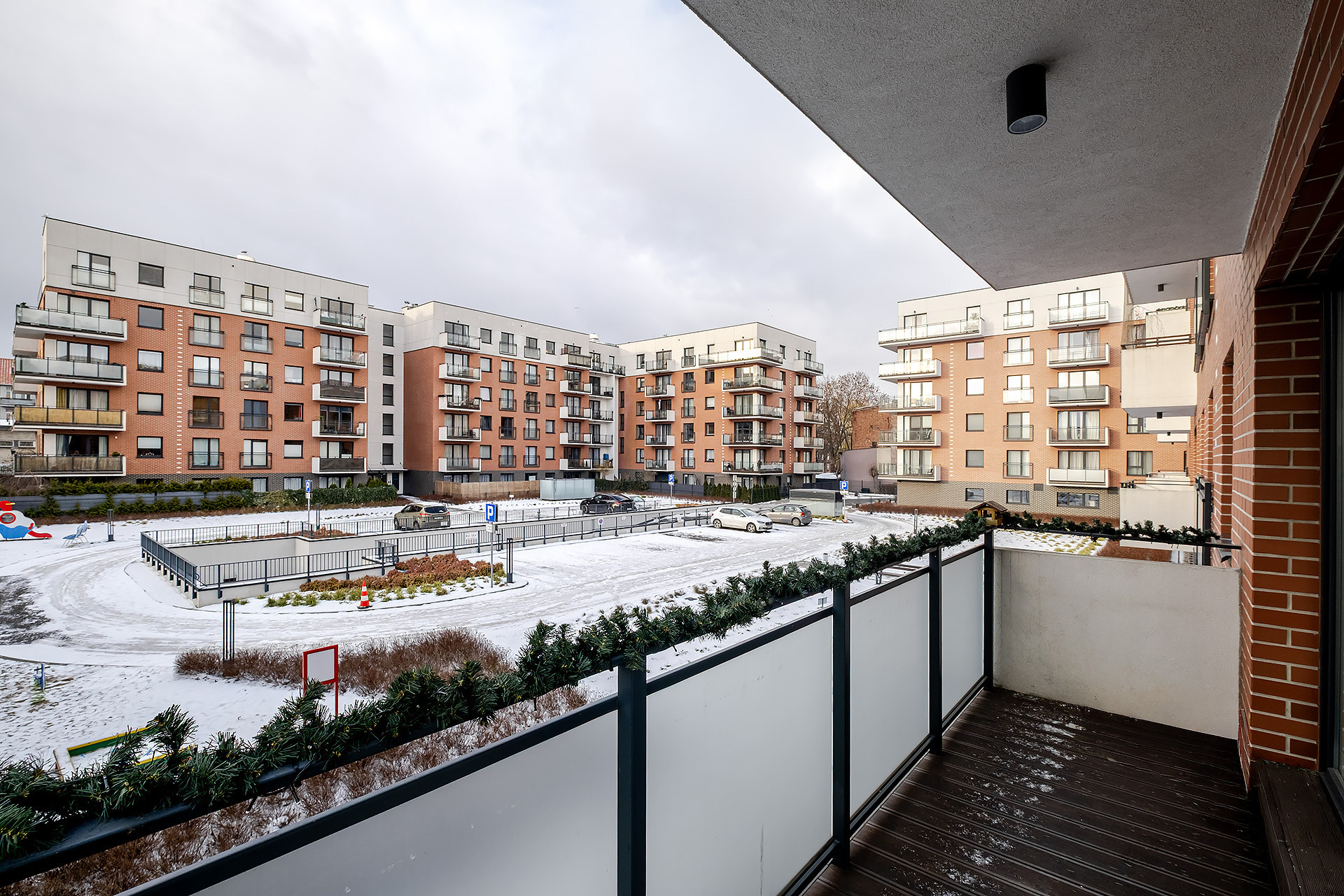 Mieszkanie znajduje się w inwestycji Nowa Grobla Apartamenty, będącej dziełem ogólnopolskiego dewelopera ATAL. Mieści się na 1 piętrze, pięciopiętrowego apartamentowca, który wzniesiono w 2018 roku. Ogólny stan całej nieruchomości należy uznać za idealny. Klatka schodowa jest czysta, zadbana, szeroka, a wejście do niej zabezpieczone domofonem. Na dachu budynku zaaranżowano taras widokowy z ławkami, który z pewnością posłuży przyszłym mieszkańcom jako miejsce relaksu i odpoczynku. Na poszczególne kondygnacje dostaniemy się także dzięki cichobieżnej windzie. Do wspólnego użytku mieszkańców pozostaje rowerownia/wózkarnia. W pobliżu nieruchomości znajdziemy ogólnodostępne miejsca postojowe.