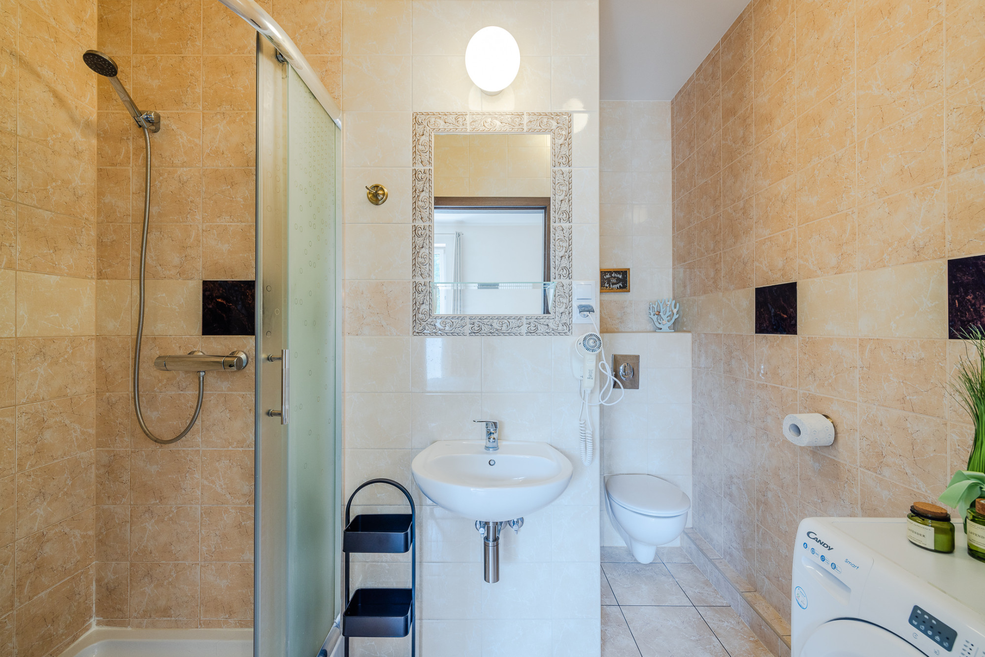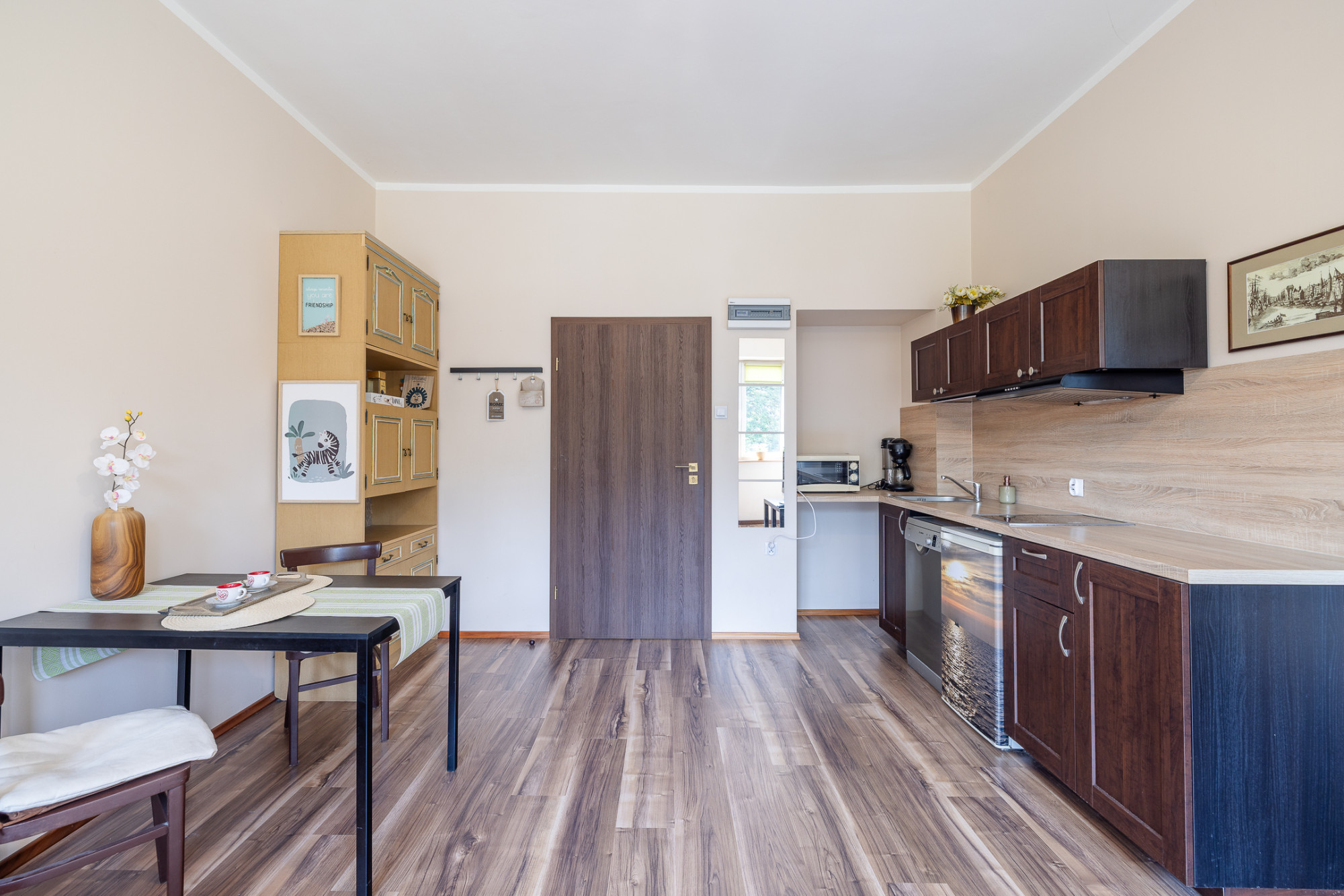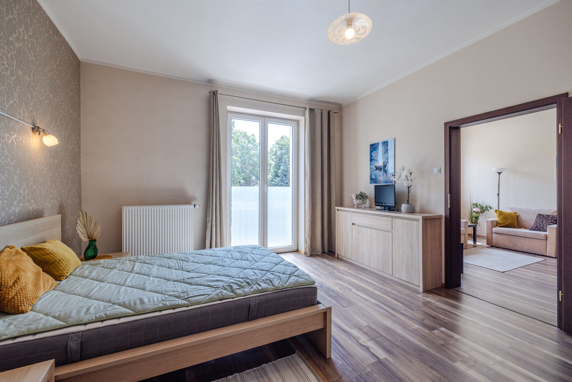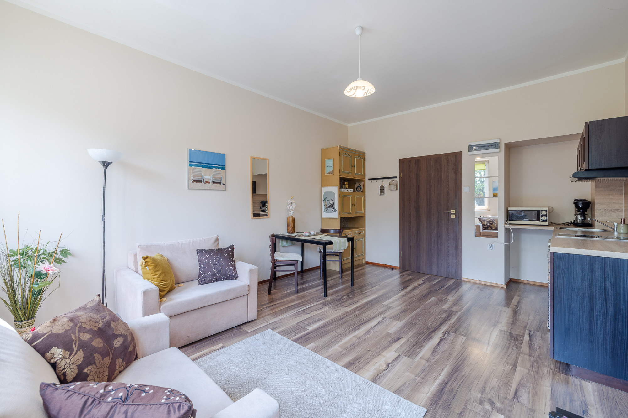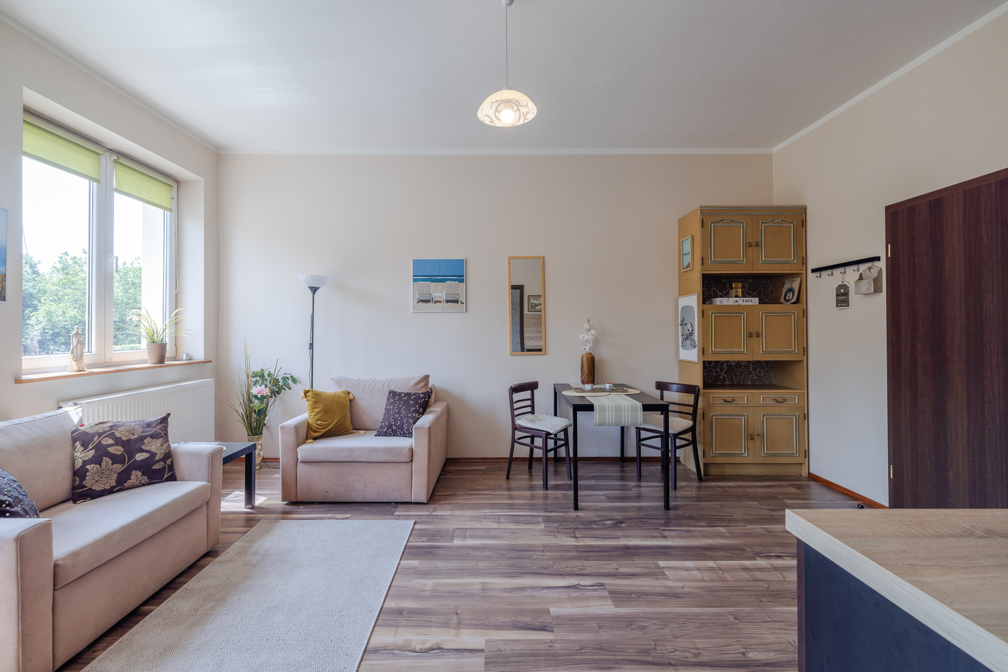 Mieszkanie składa się z salonu z aneksem kuchennym, sypialni z garderobą i łazienki z kabiną prysznicową. . Aneks kuchenny jest w pełni wyposażony : zmywarka, płyta indukcyjna, okap, lodówka, kuchenka mikrofalowa, ekspres do kawy, komplet naczyń i garnków.