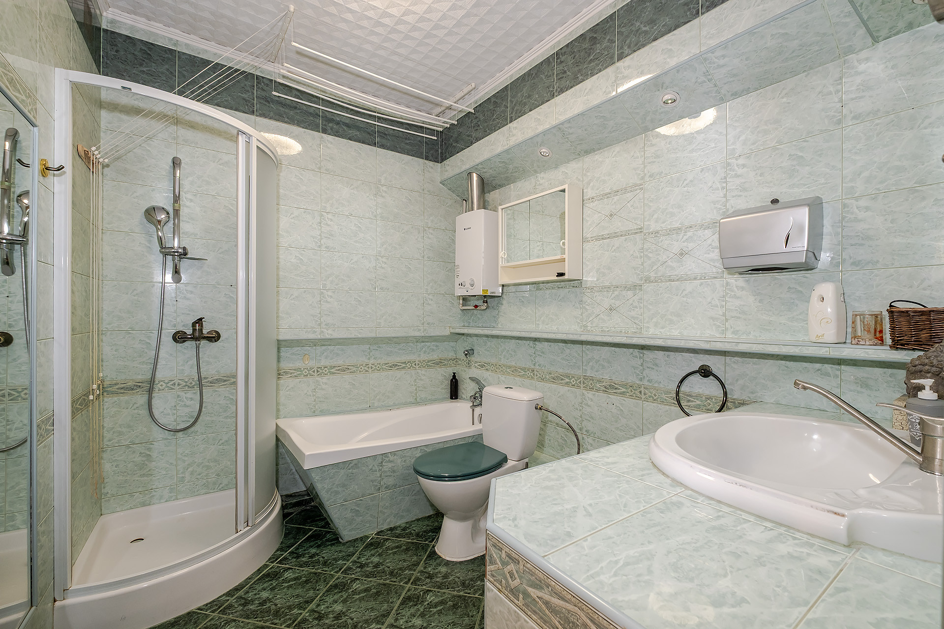 – łazienka z WC, wanną, prysznicem, umywalką, lustrem, grzejnikiem drabinkowym