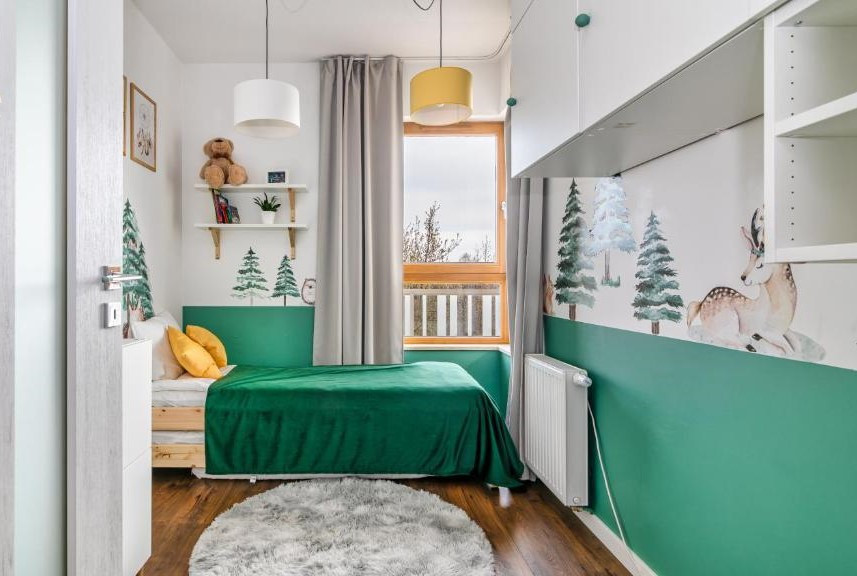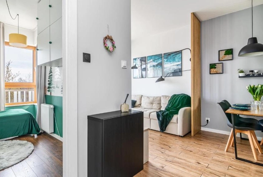 – pokój dzienny z aneksem kuchennym oraz wyjściem na duży balkon (8 m2) z widokiem na zieleń,