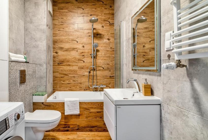 – łazienka z WC, wanną, umywalką, grzejnikiem drabinkowym