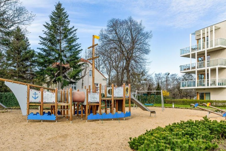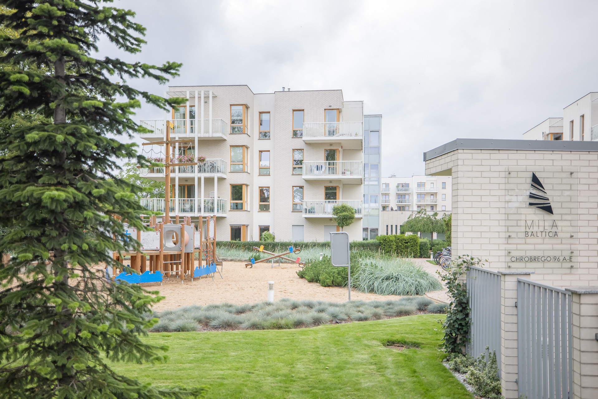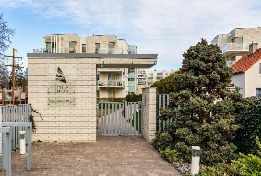 BUDYNEK: Mieszkanie mieści się na 2 piętrze w 3-piętrowym apartamentowcu, w inwestycji Mila Baltica, będącej dziełem dewelopera ROBYG. Obiekt powstał w 2017 roku. Do jego budowy użyto materiałów mieszanych. Całość bardzo estetyczna, nowoczesna, prestiżowa. Ogólny stan całej nieruchomości należy uznać za idealny. Budynek jest monitorowany, chroniony, a teren, na którym się znajduje – ogrodzony. Wejścia na posesję, jak również do klatki schodowej zabezpieczone są domofonem. Klatka zadbana, czysta, szeroka, utrzymana w nienagannym porządku. Na poszczególne kondygnacje dostaniemy się też dzięki cichobieżnej windzie. Na dachu budynku zainstalowano solary, które dostarczają energię elektryczną, którą są oświetlane np. części wspólne osiedla. Do wyłącznego użytku mieszkańców sala fitness, sauna oraz sala zabaw dla dzieci.
