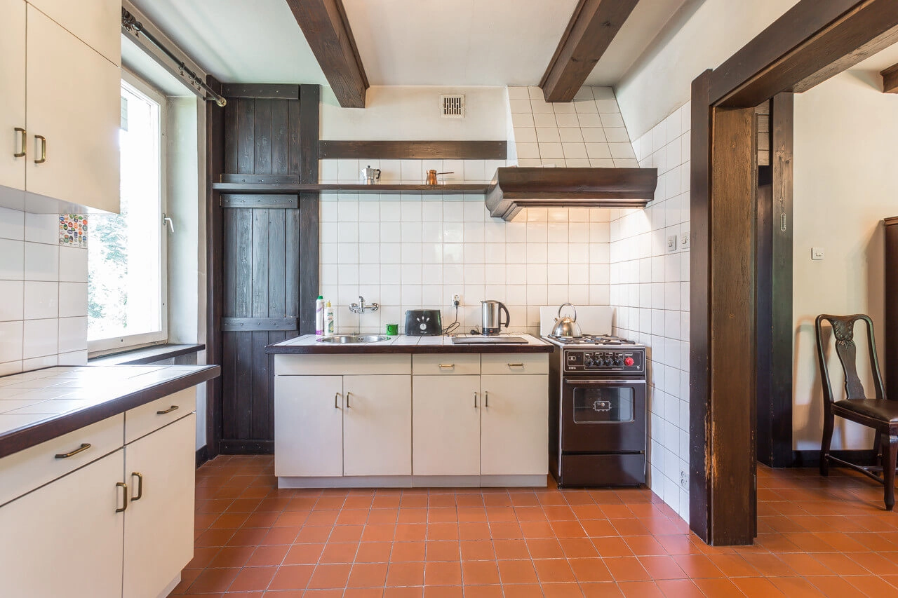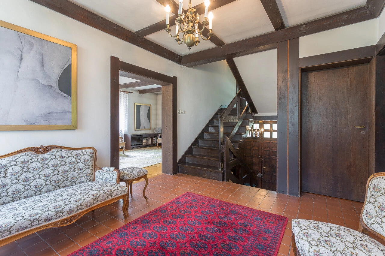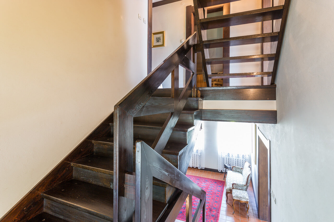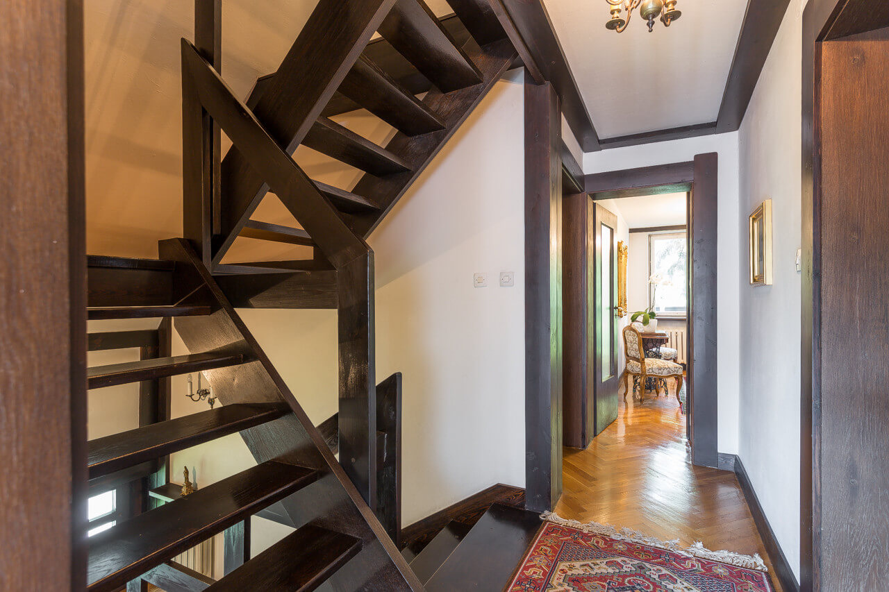 Na podłogach deska sosnowa, dębowy parkiet, terakota. Klatka schodowa komunikująca dwa poziomy jest drewniana (dąb). Parapety sosnowe.