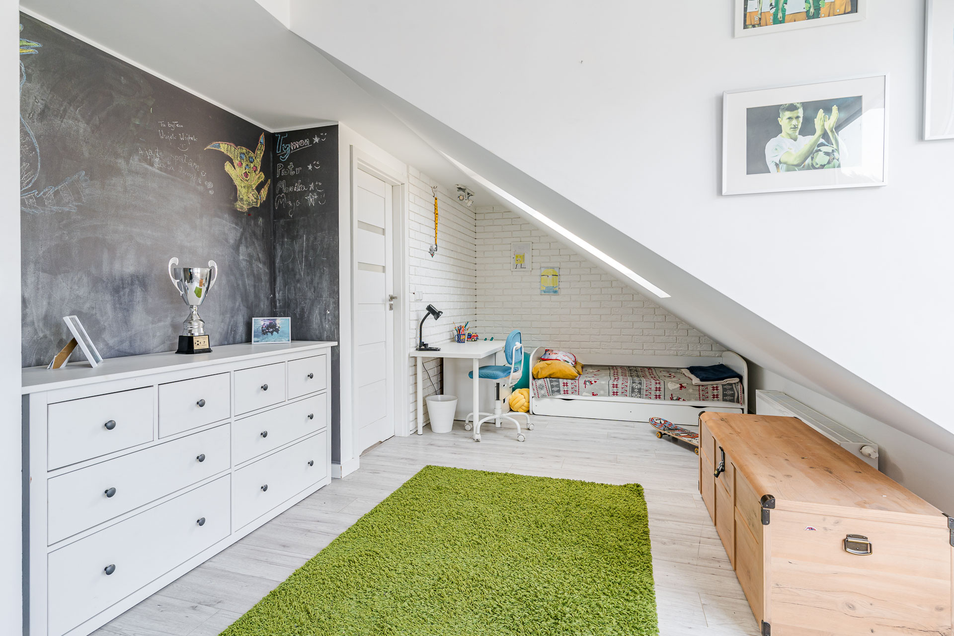 Poziom drugi: antresola zaaranżowana na pokój dziecięcy z prywatną łazienką z prysznicem oraz dostępem do drugiego tarasu.