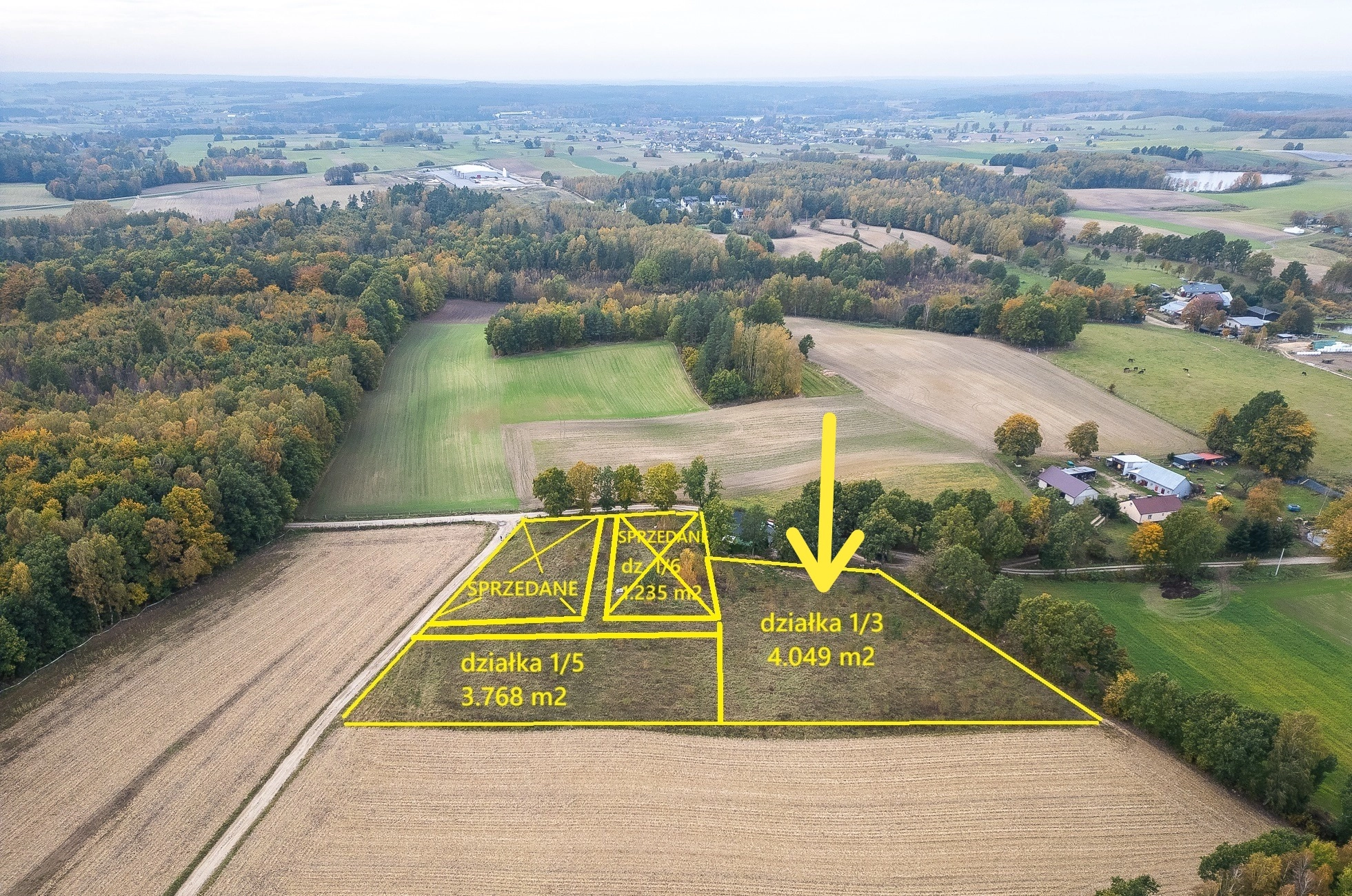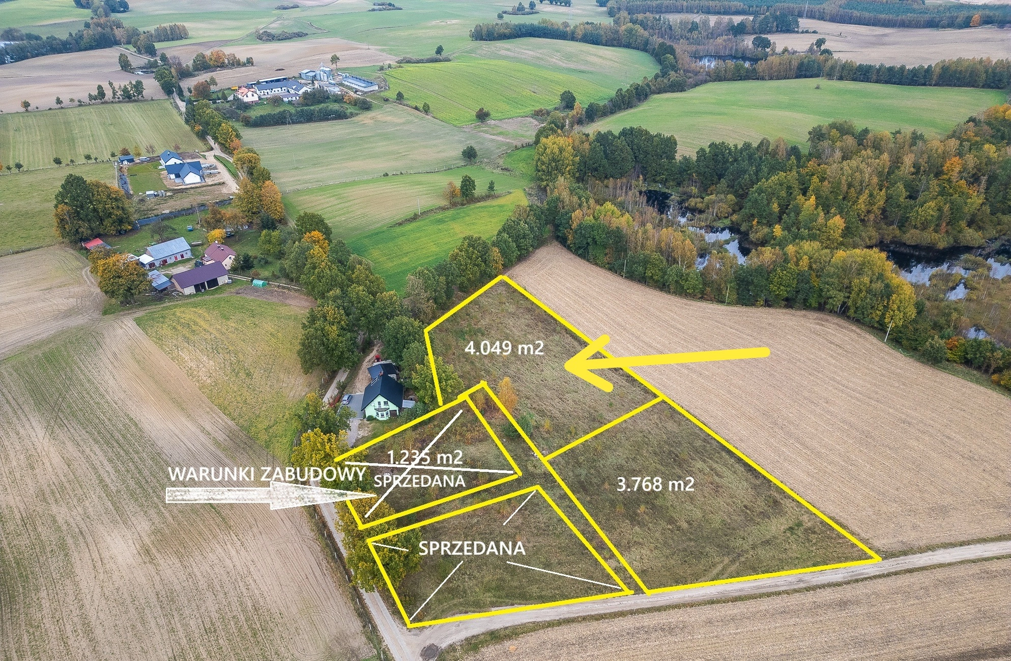 Na sprzedaż działka budowlana z wydanymi warunkami zabudowy o powierzchni 4.049 m2, stanowiąca odrębną własność z czystą Księgą Wieczystą.