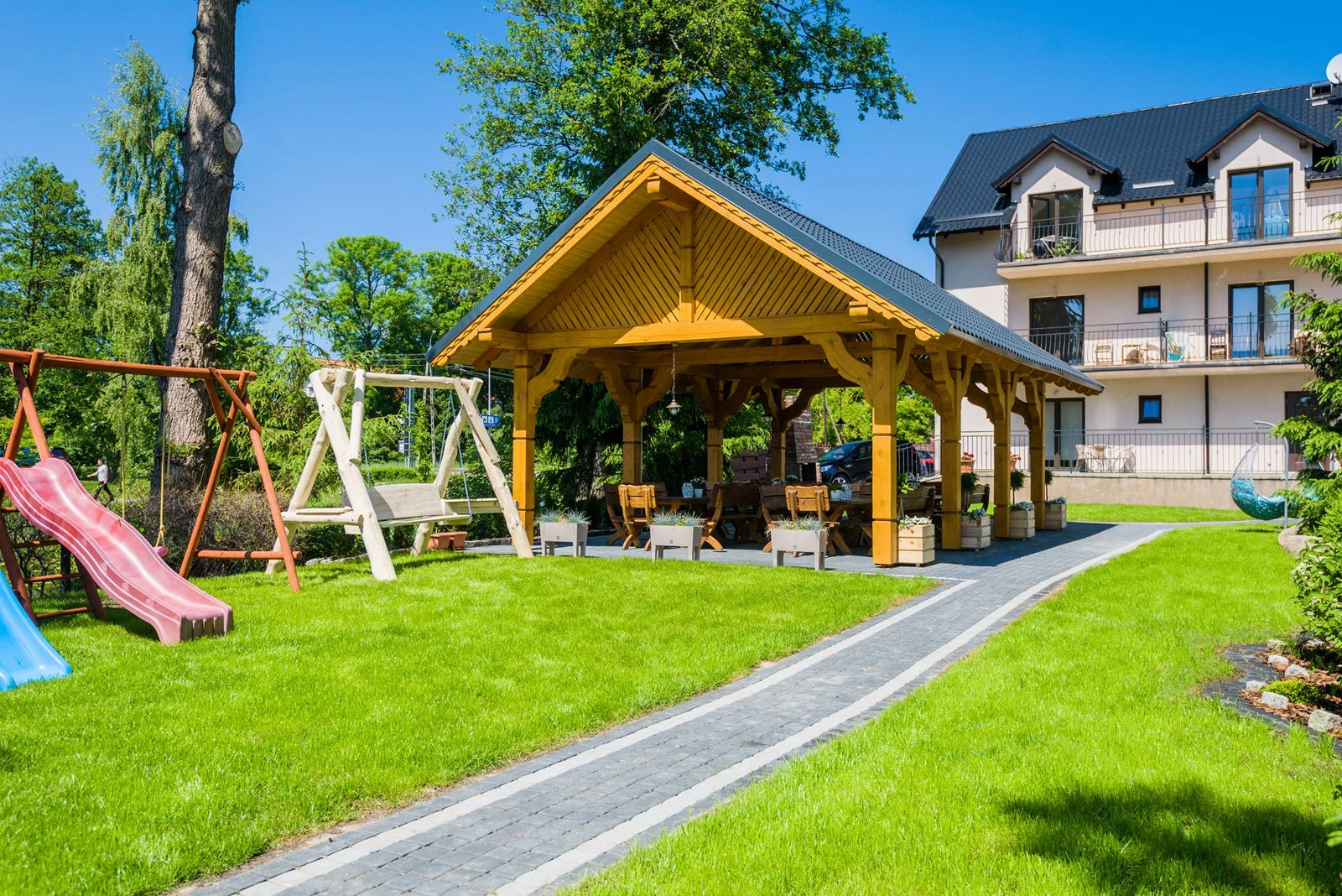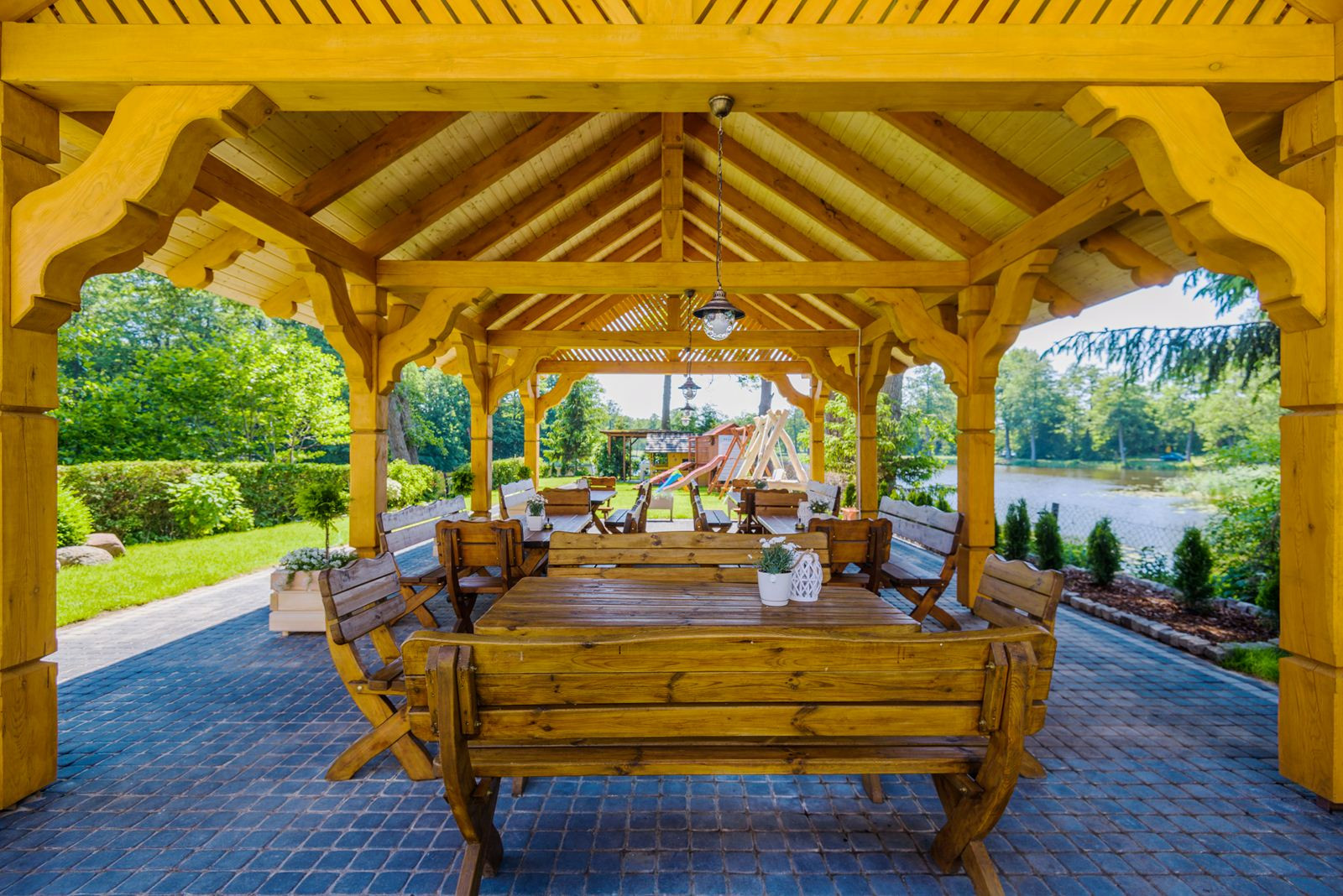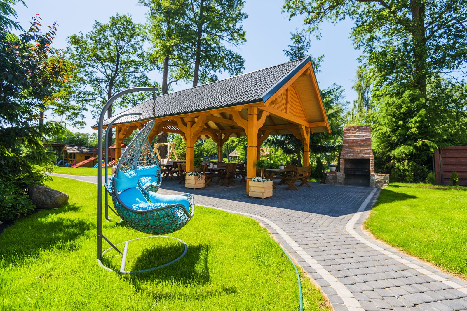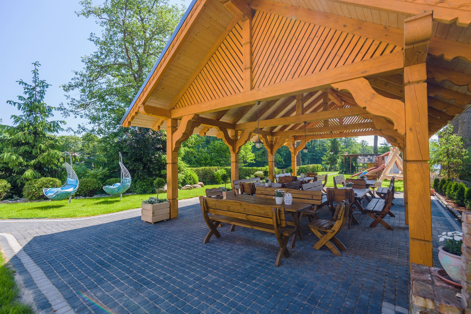 * Ogród z drewnianą wiatą, ławkami i kamiennym grillem